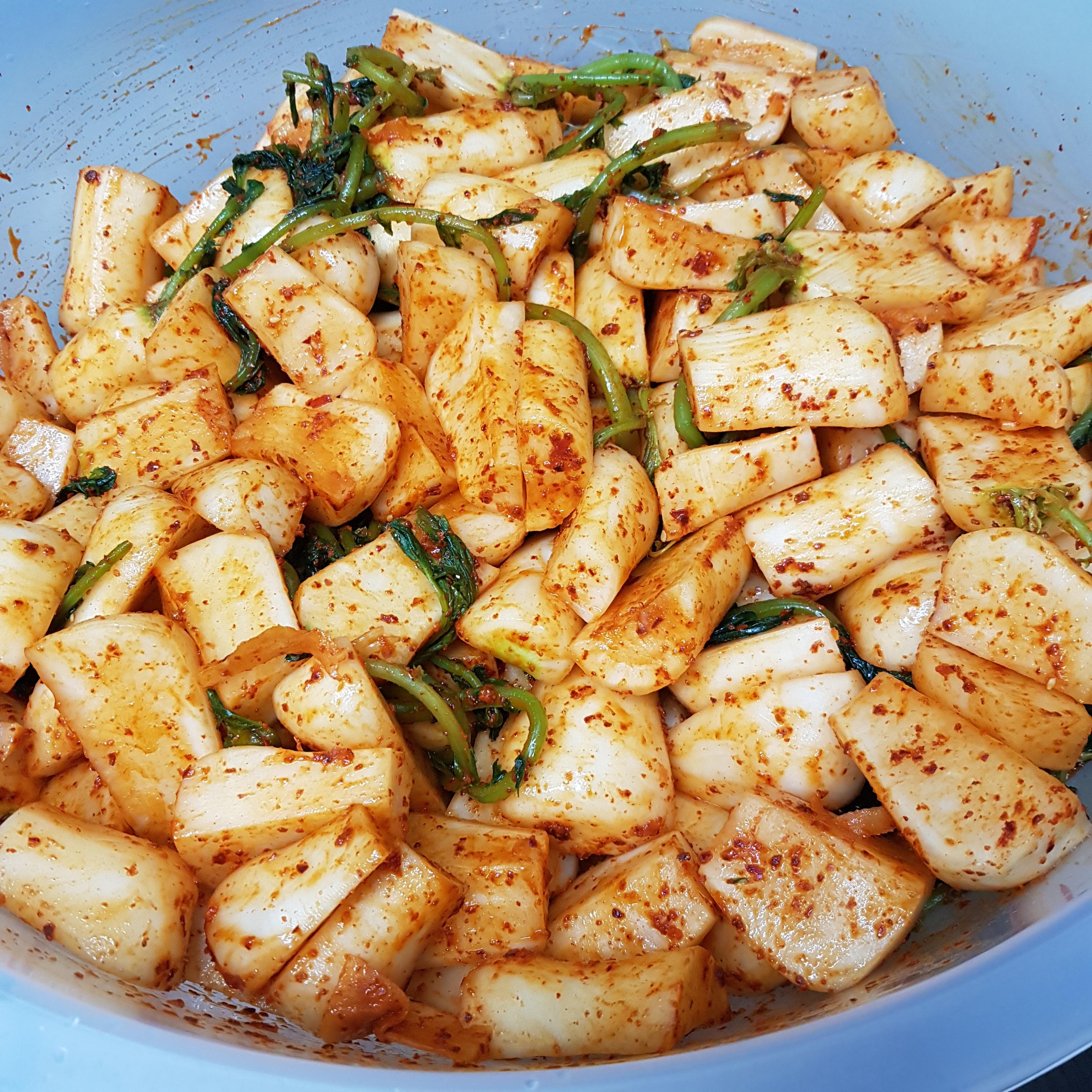 ▶ 물기 뺀 알타리에 고운 고춧가루 반컵을 넣고 색을 입혀주세요 그래야 양념이 잘 묻어있답니다 먼저 색을 입힌 후 준비한 양념장을 넣고 골고루 버무려주면 봄 알타리김치 총각김치 만드는 법 완성입니다