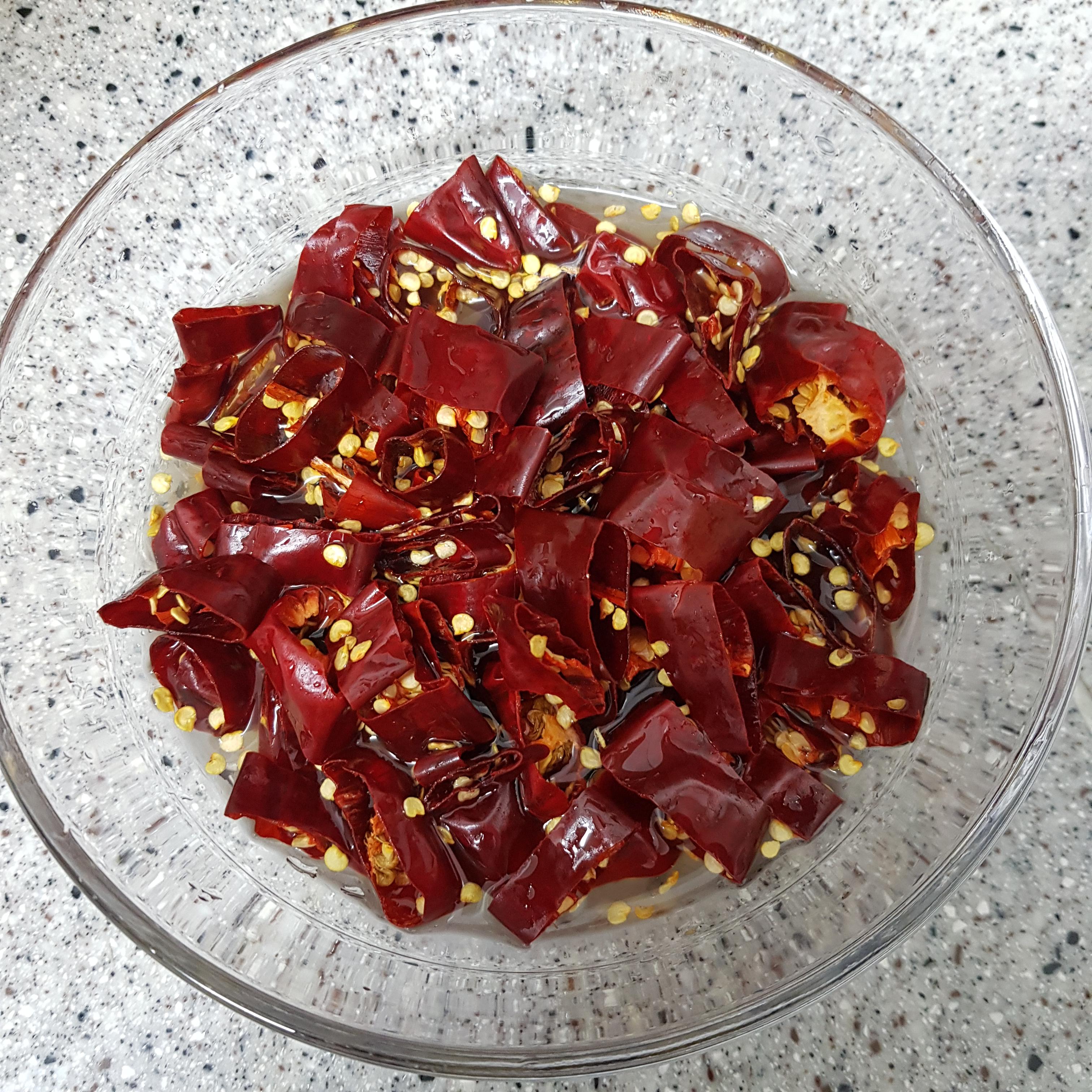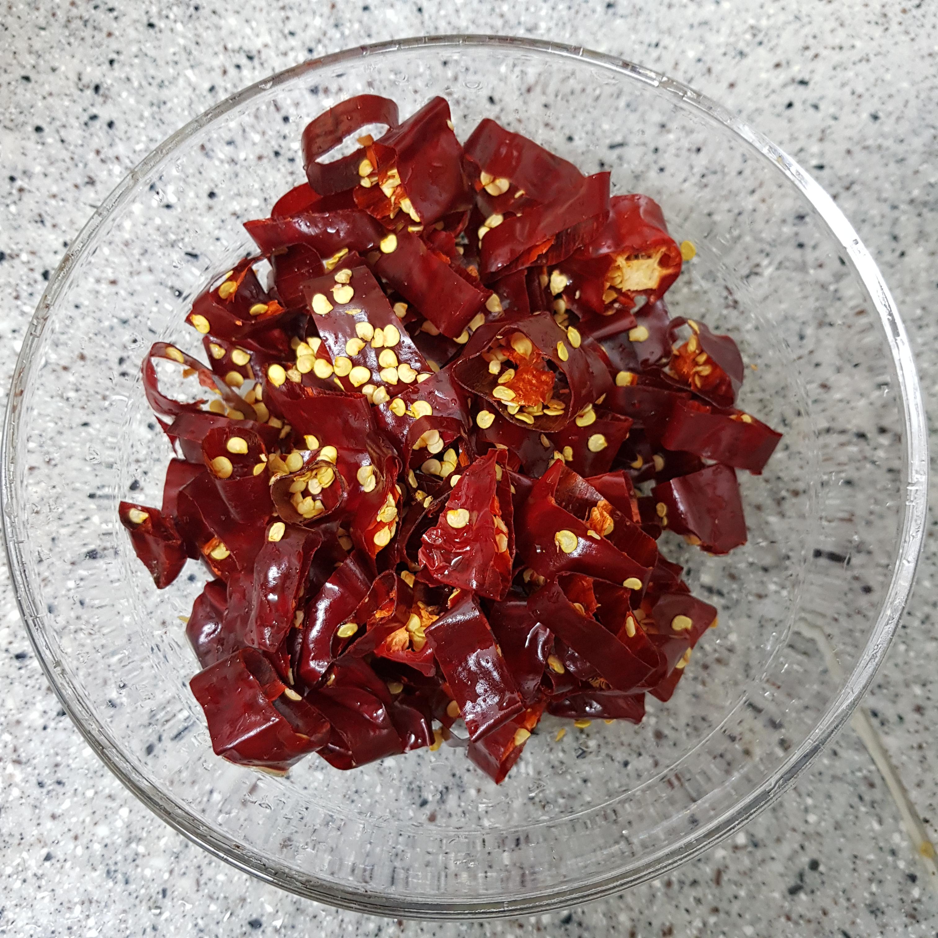 ▶ 건고추 15개는 씻은 후 꼭지를 떼어주고 믹서기에 잘 갈릴 수 있도록 가위로 잘라주세요 잘라준 후 볼에다 넣고 진하게 뺀 육수 1컵을 넣어 불려주시고 알타리 손질을 해주세요