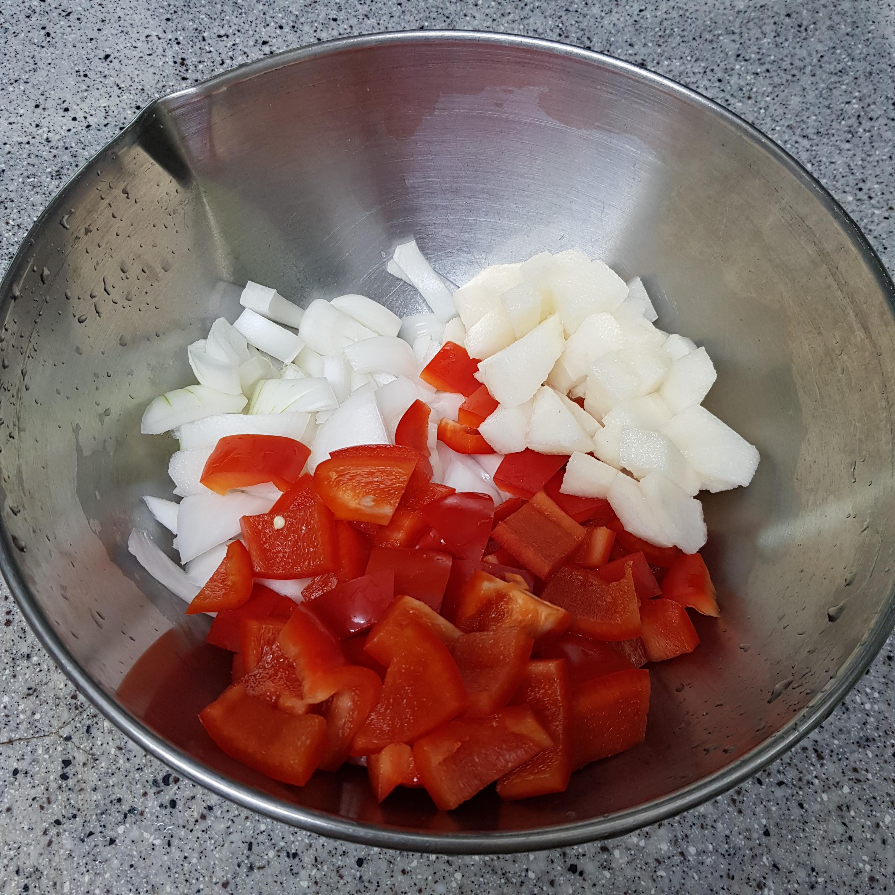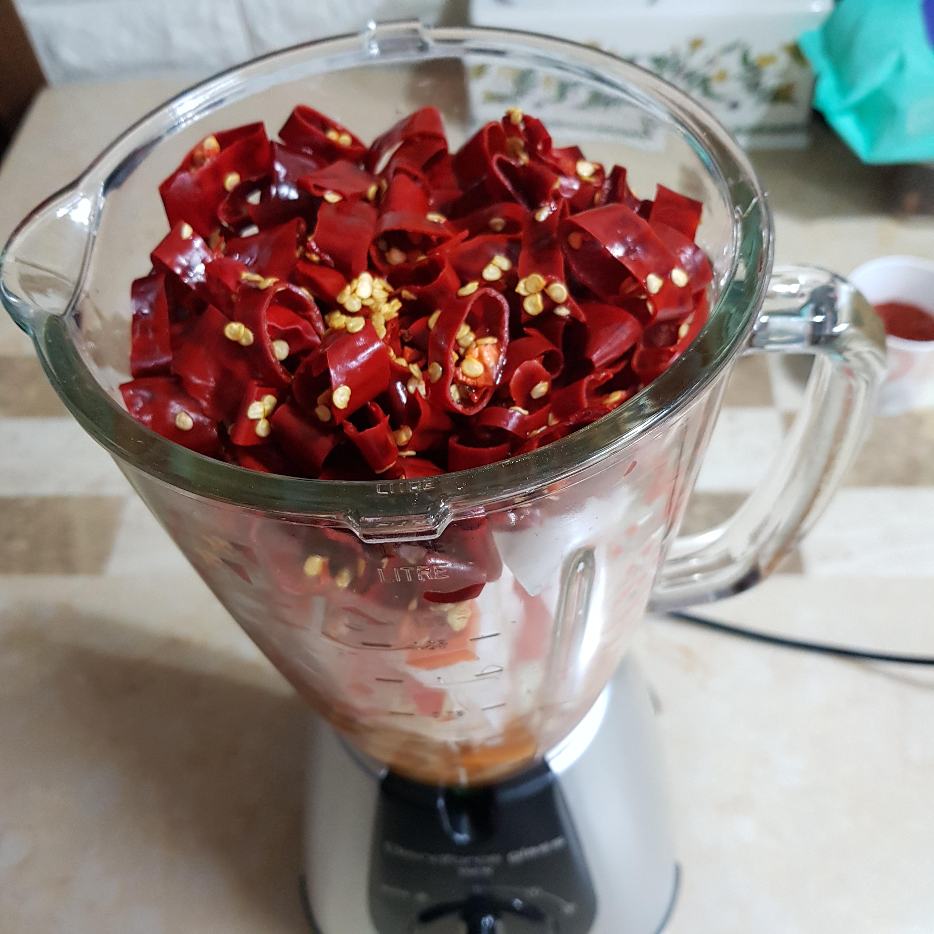 ▶ 양파, 배, 파프리카, 마늘, 생강을 잘 갈릴 수 있도록 썰어준 후 믹서기에 넣고 맨 마지막에 불린 건고추(불린 육수와 함께)를 넣어 갈아주세요