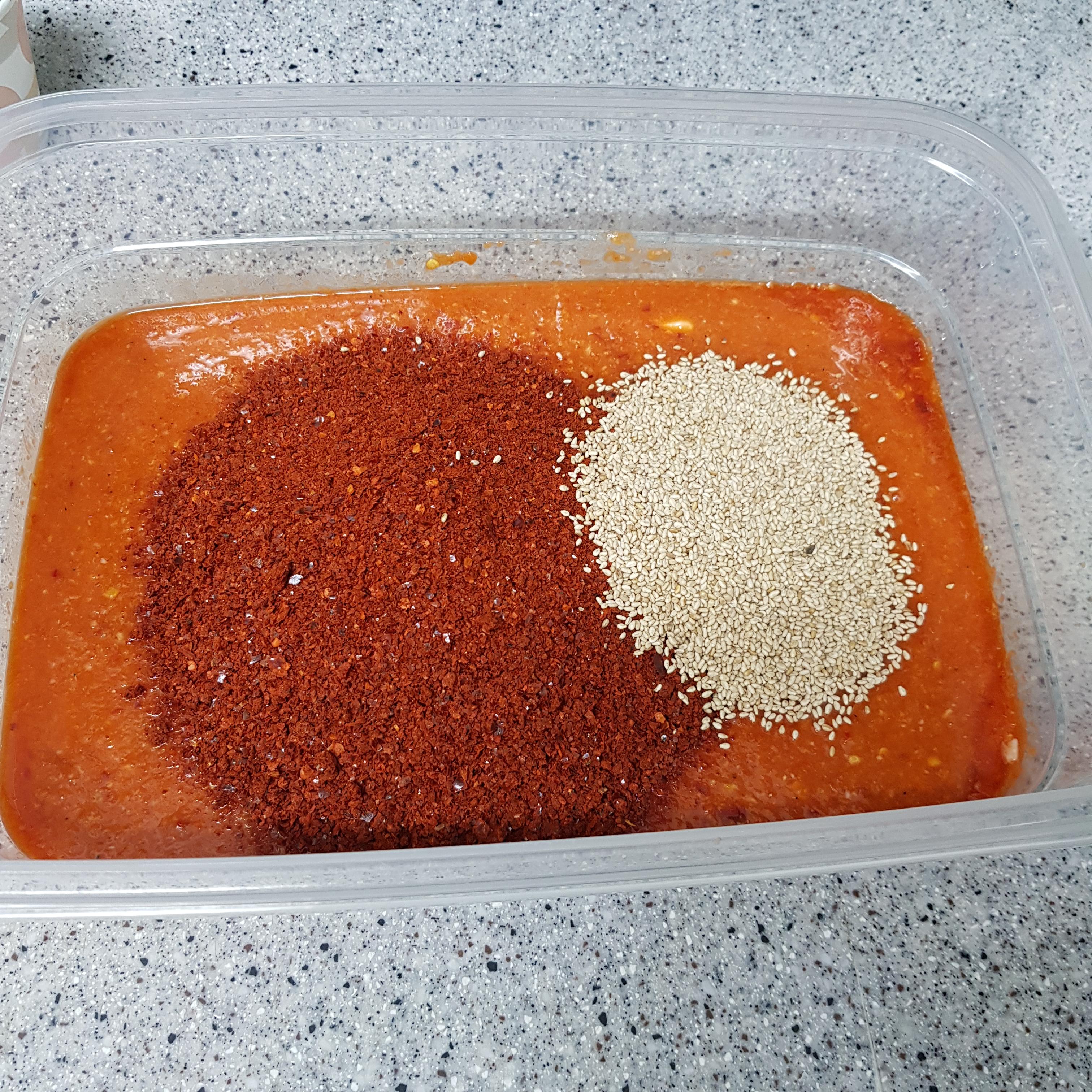 ▶ 옮겨 담은 후 고춧가루 2컵과 통깨 반 컵을 넣고 골고루 섞어주세요
