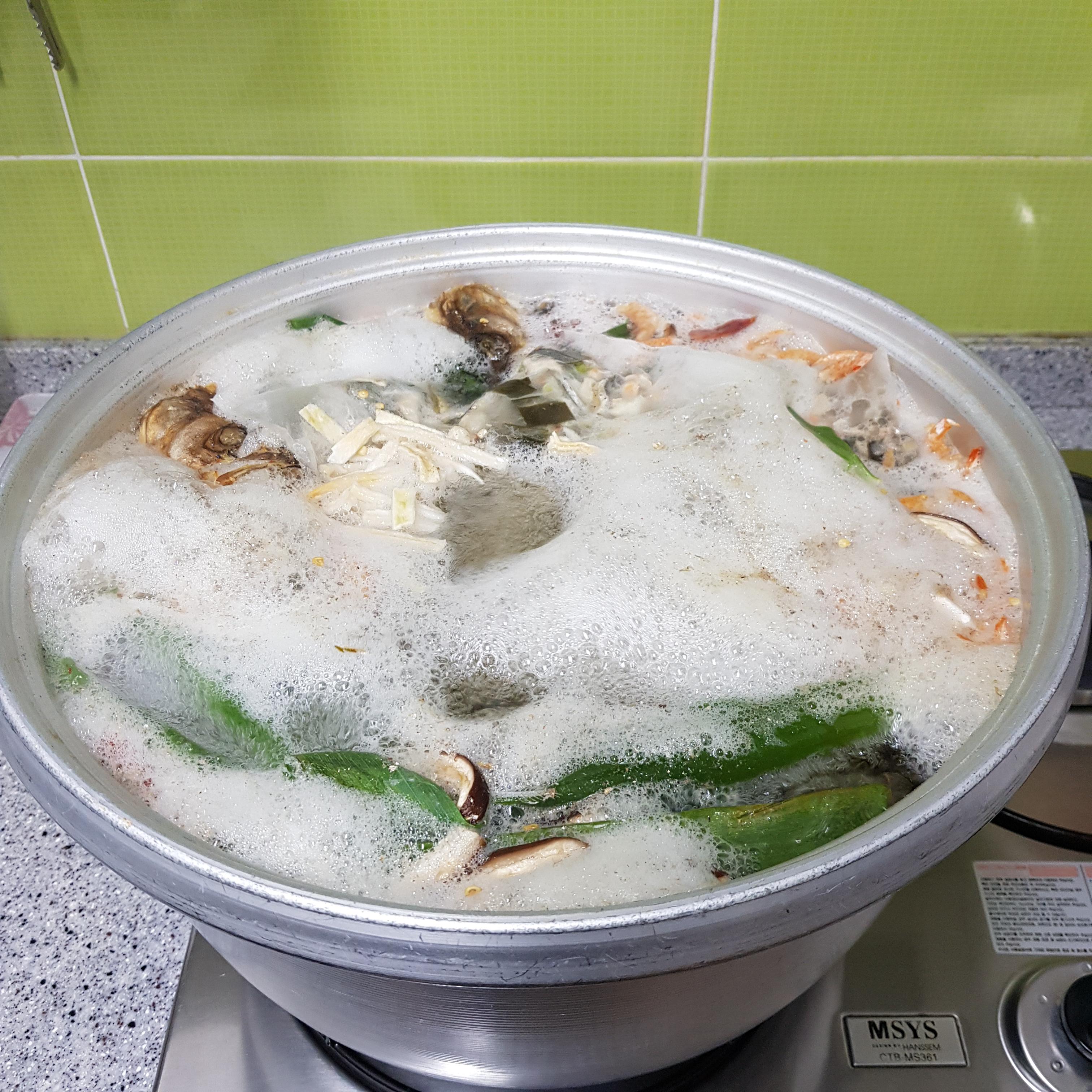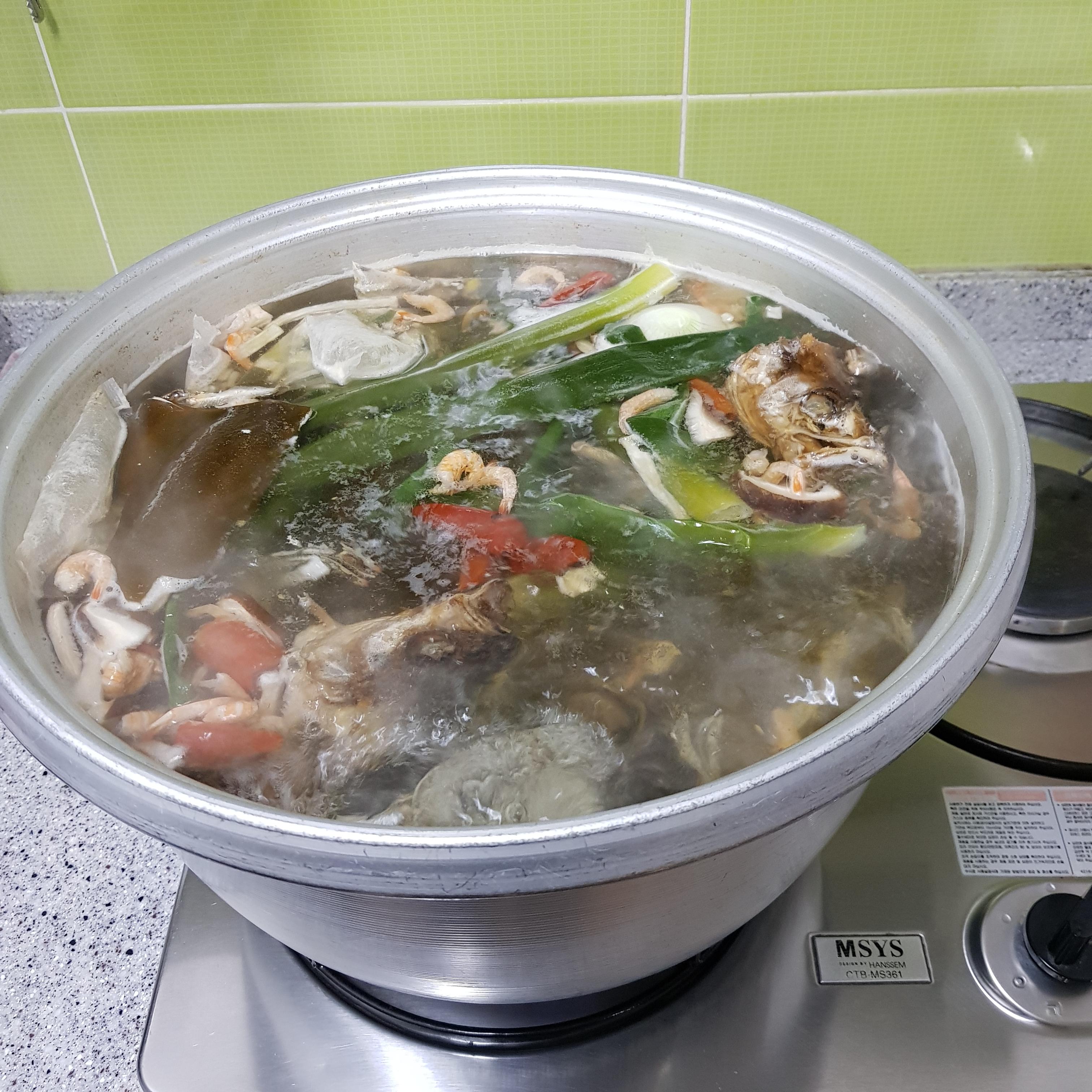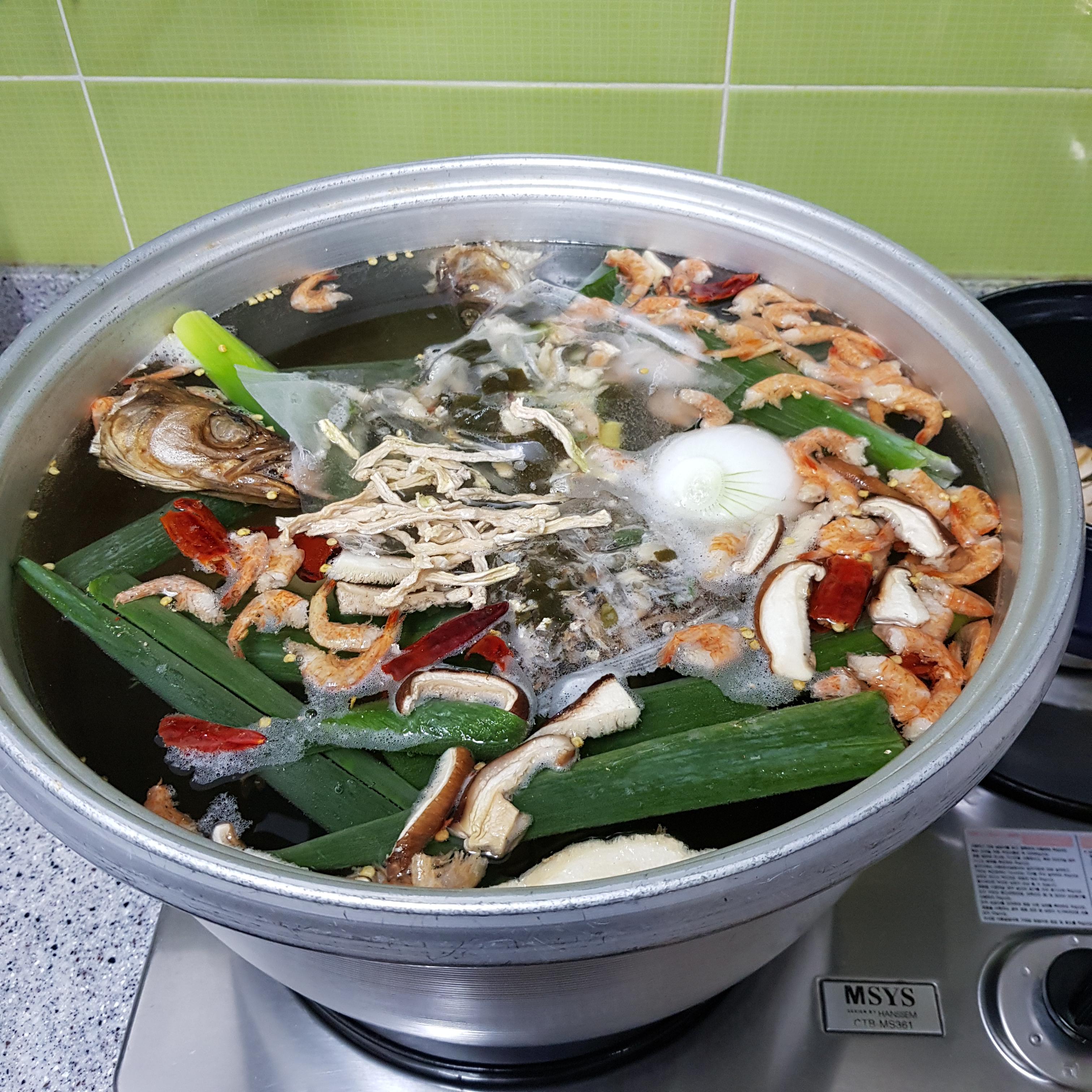 ▶ 멸치, 북어대가리, 건새우, 건표고버섯, 건다시마, 건고추, 양파, 대파, 무말랭이, 무, 시판용 티백 넣고 센 불에서 끓여서 육수를 준비해주세요