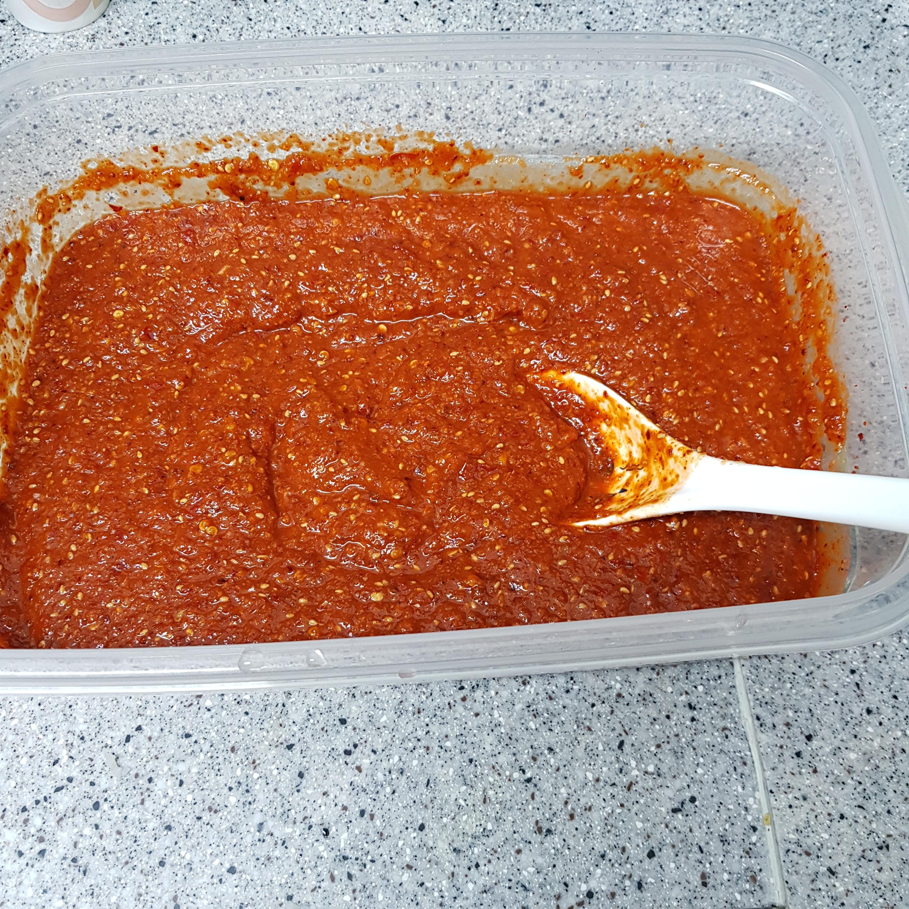 찹쌀풀국 1컵 반, 파프리카 2개, 양파 1개, 배 1/4개, 마늘 220g, 생강 20g, 건고추 15개, 고춧가루 2컵, 새우젓 1컵, 멸치액젓 5큰술, 다시마 육수 1컵(시판용 대체 가능), 매실액 3큰술, 통깨 반컵
