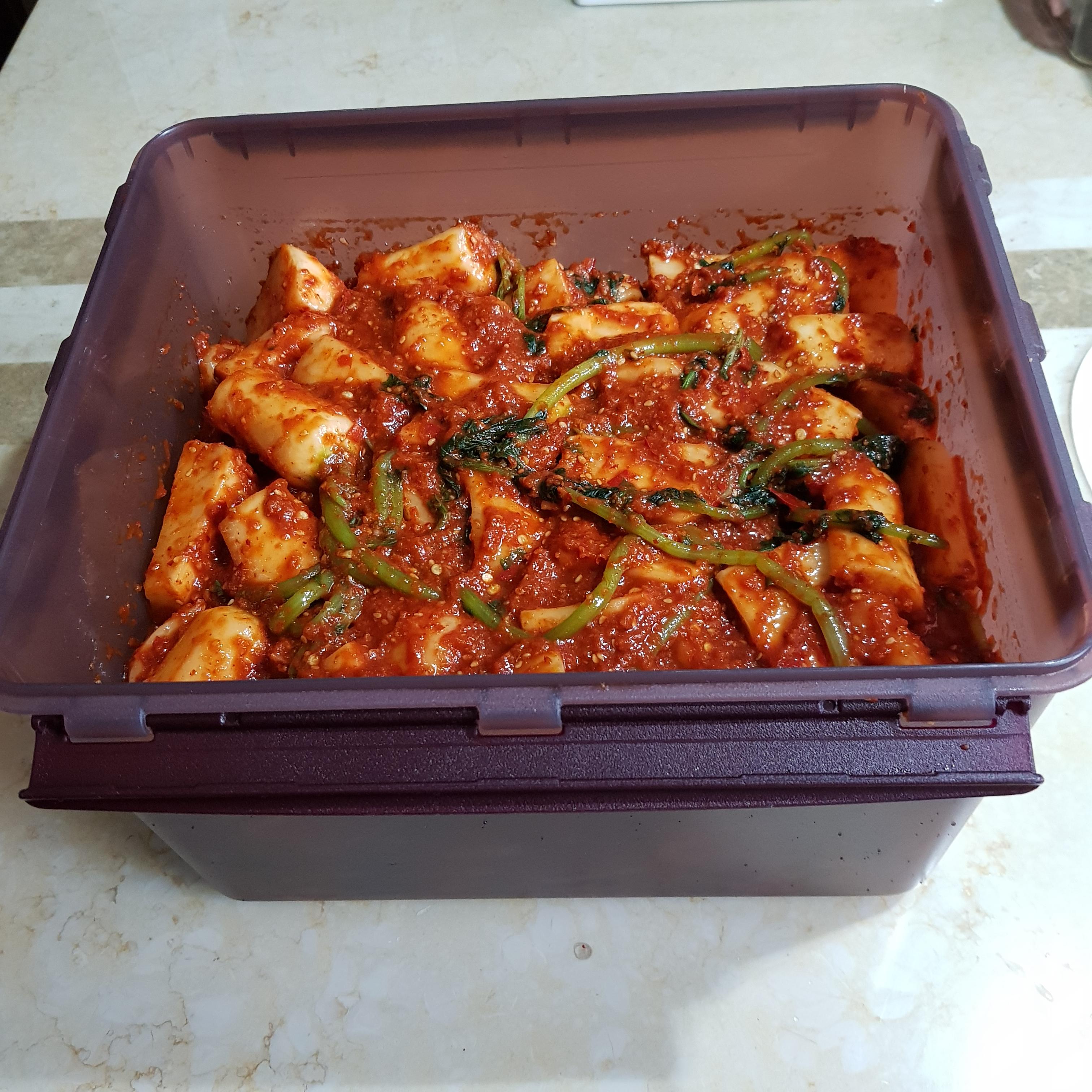 ▶ 버무린 알타리는 김치 통에 담아 비닐을 덮어주고 뚜껑을 닫은 채 베란다에서 2~3일 정도 숙성시켜 드시면 된답니다 숙성과정은 입맛에 맞게 2일 정도가 지나면 한번 맛 체크를 해보시고 입맛에 맞게 숙성시켜주면 됩니다