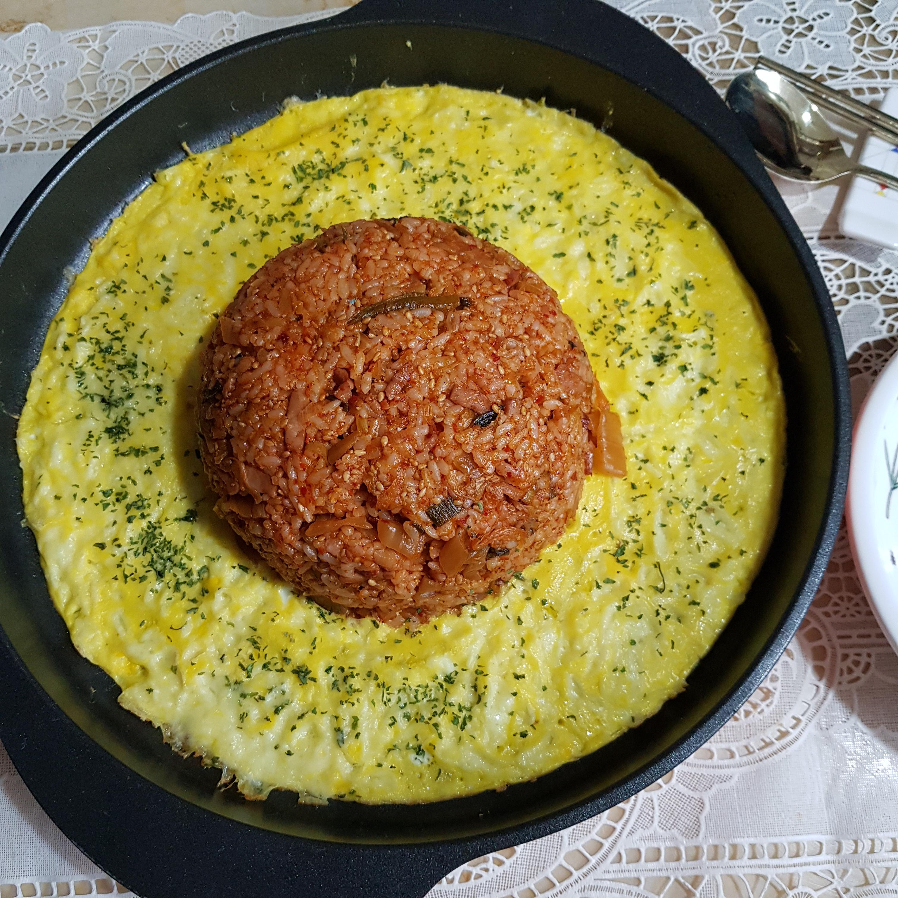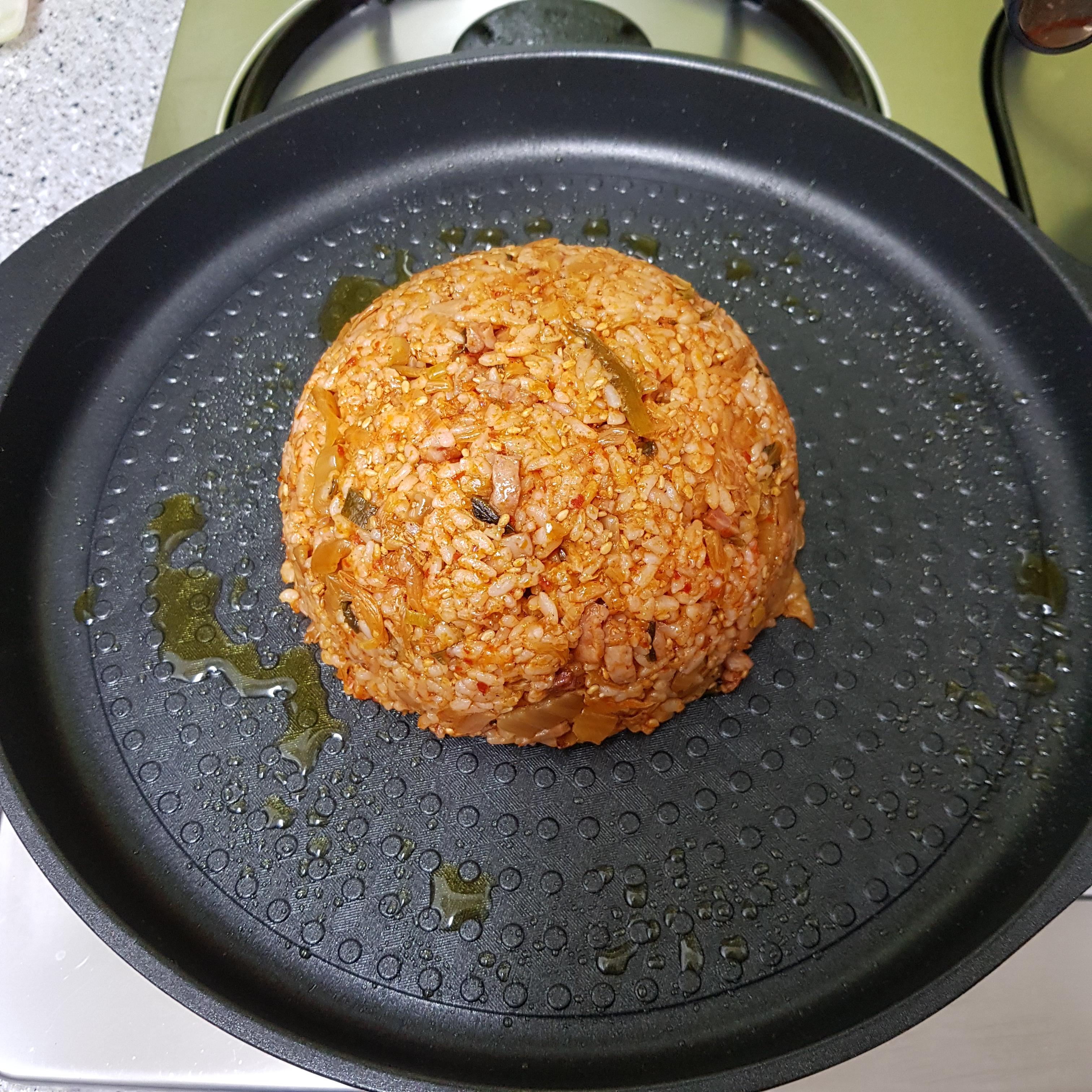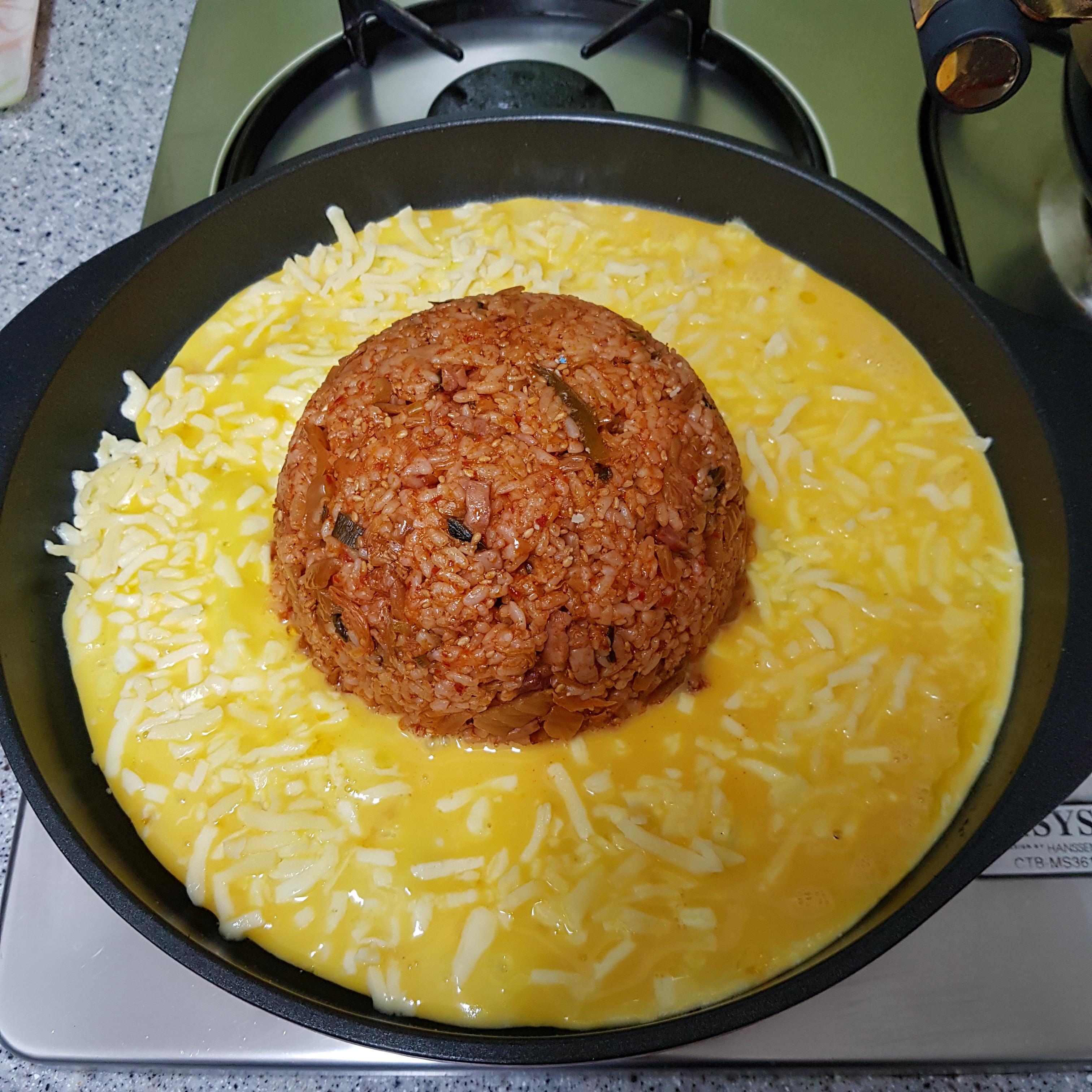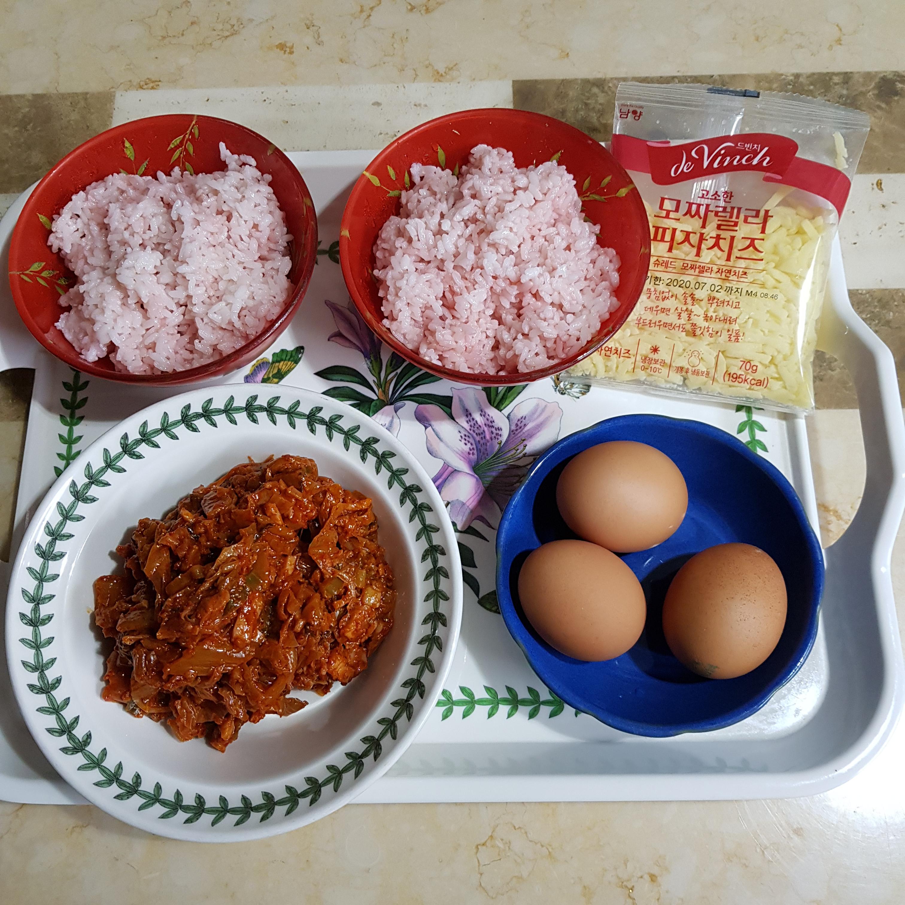 밥 2공기, 백종원 김치볶음 2컵, 계란 3개, 모차렐라 치즈 70g