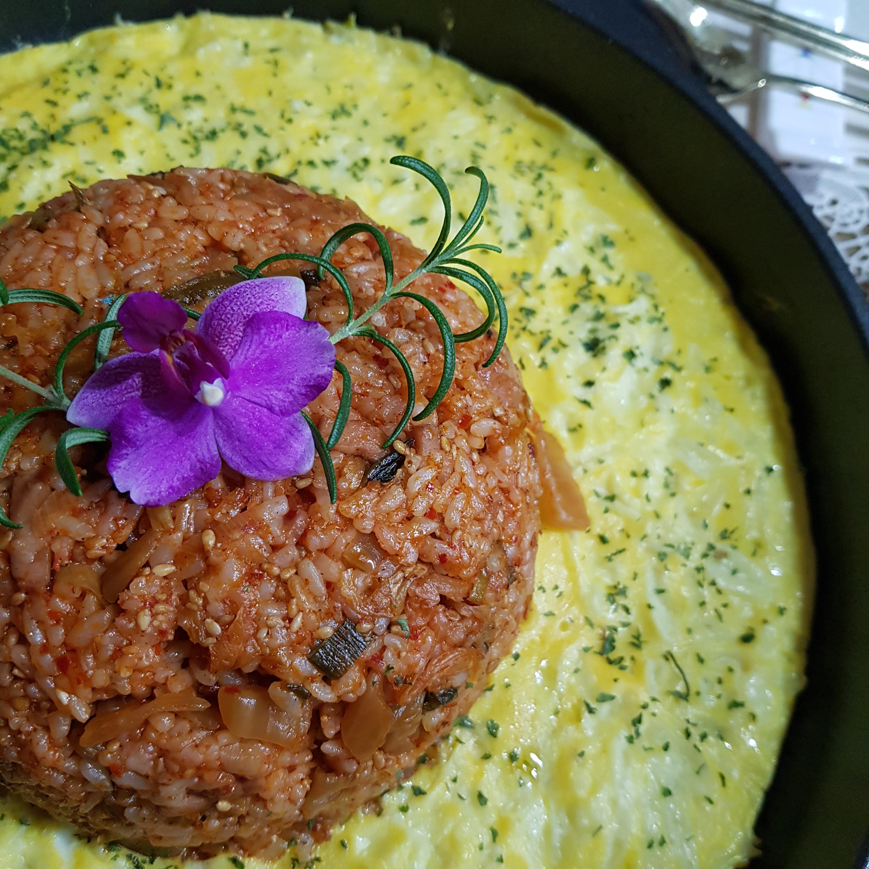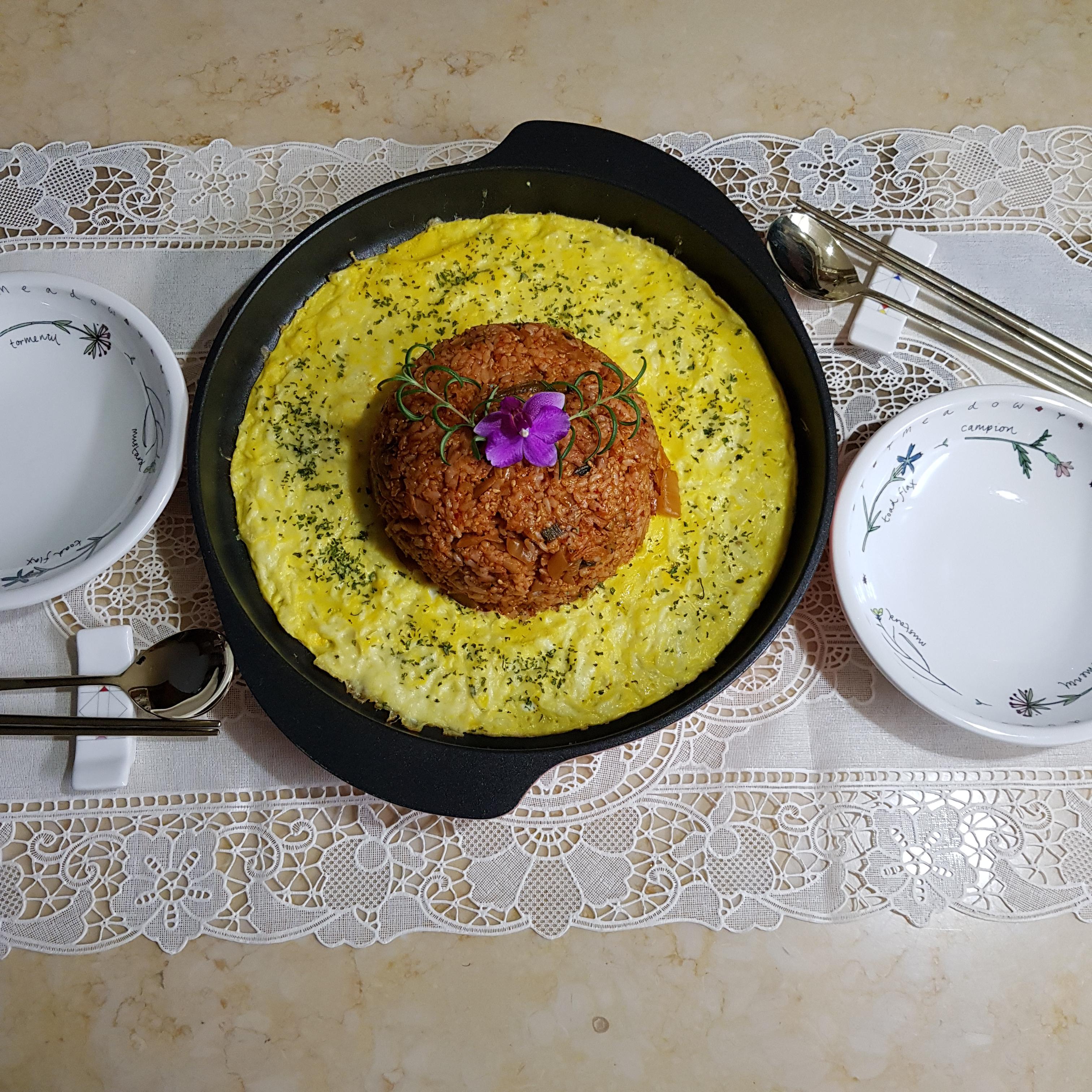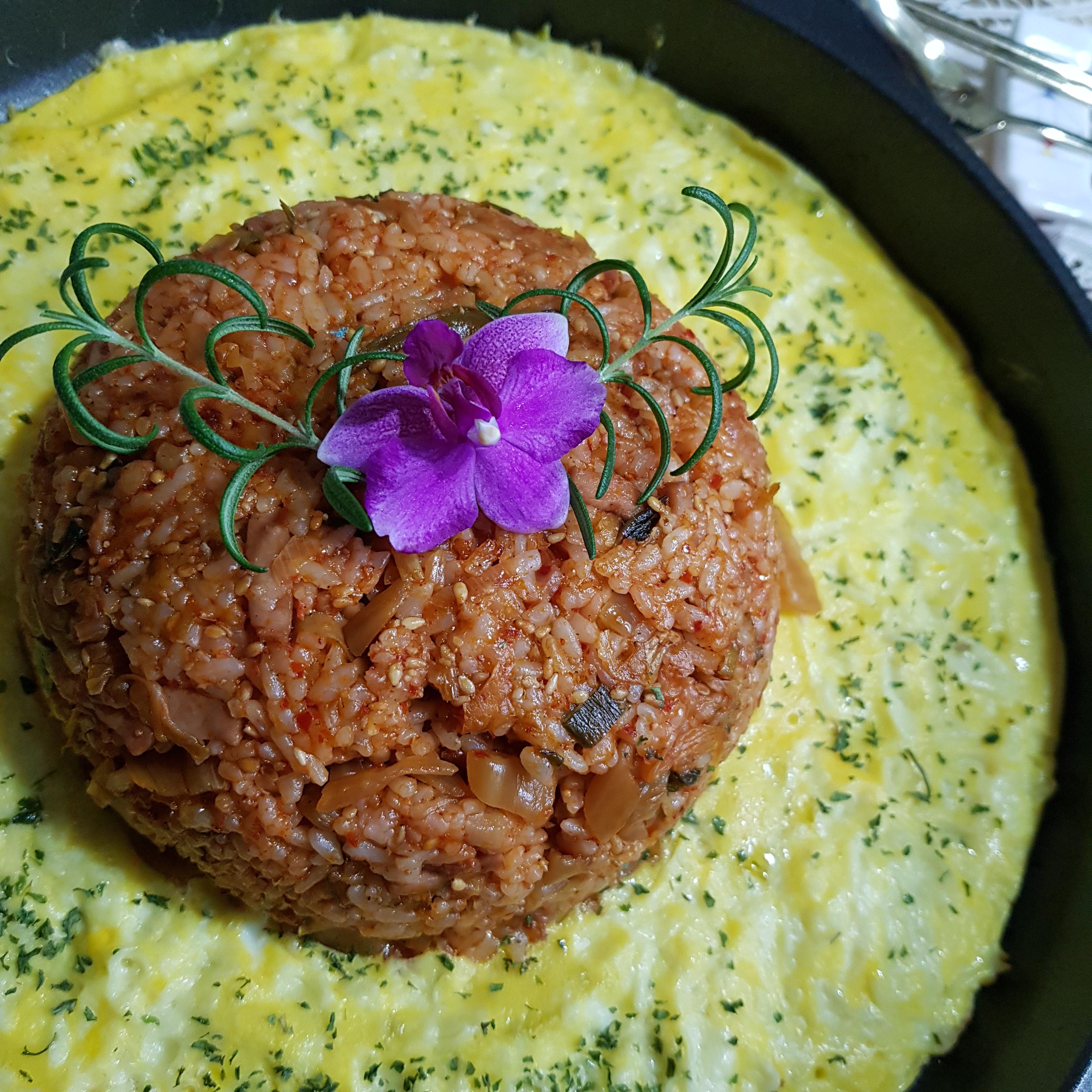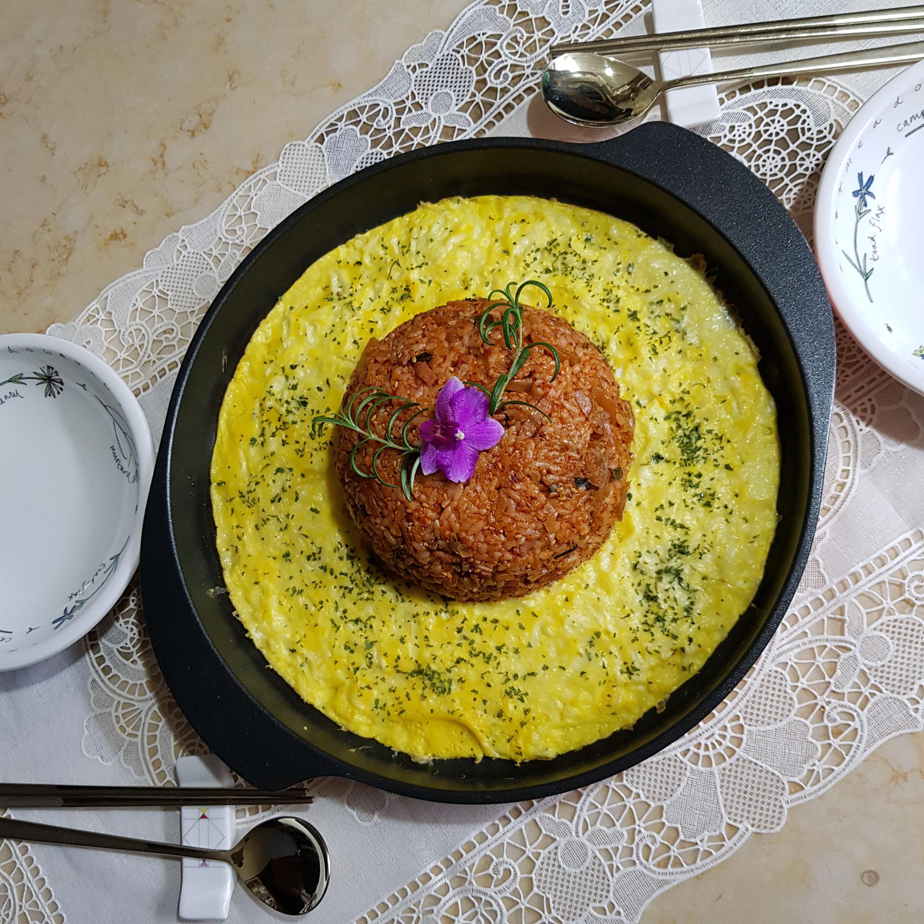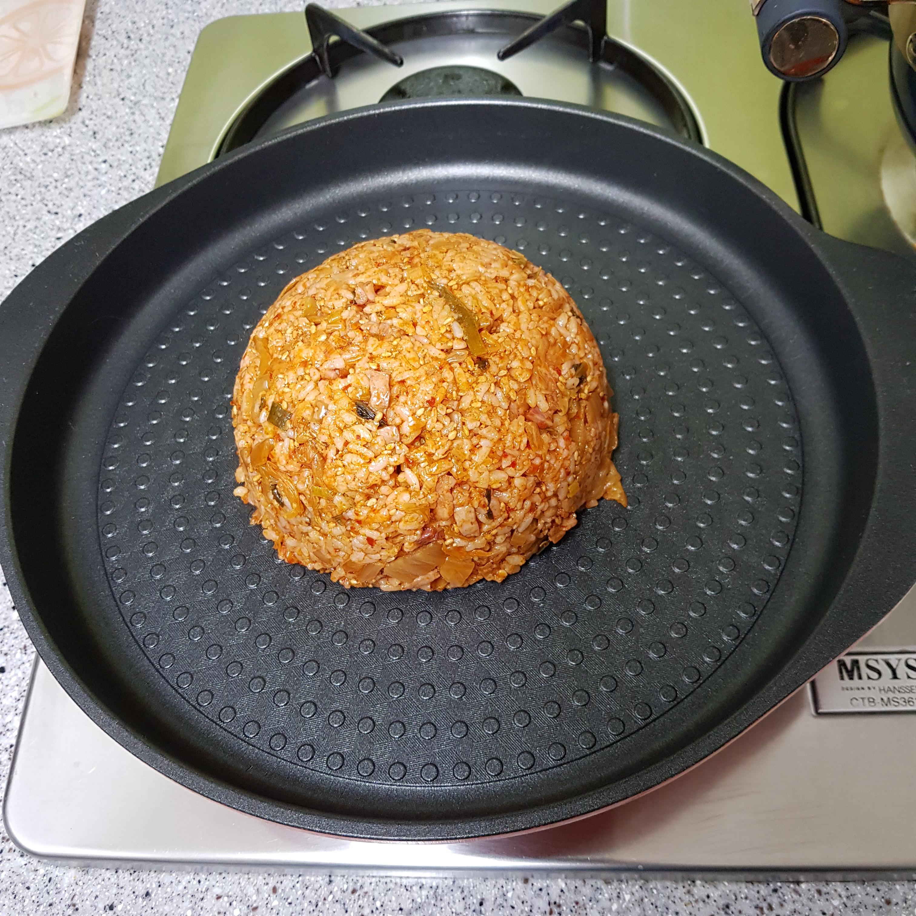 밥 2공기, 백종원 김치볶음 2컵, 계란 3개, 모차렐라 치즈 70g