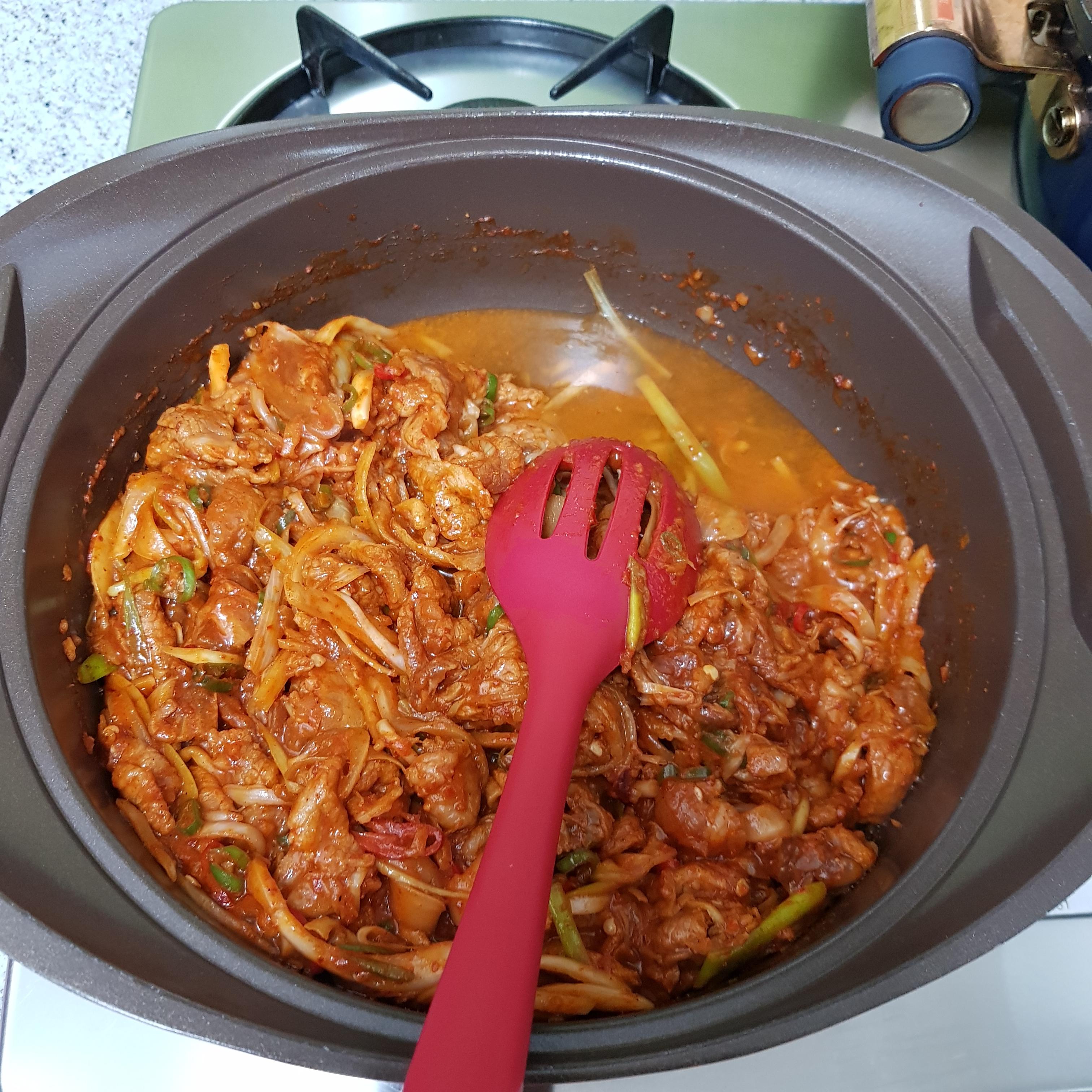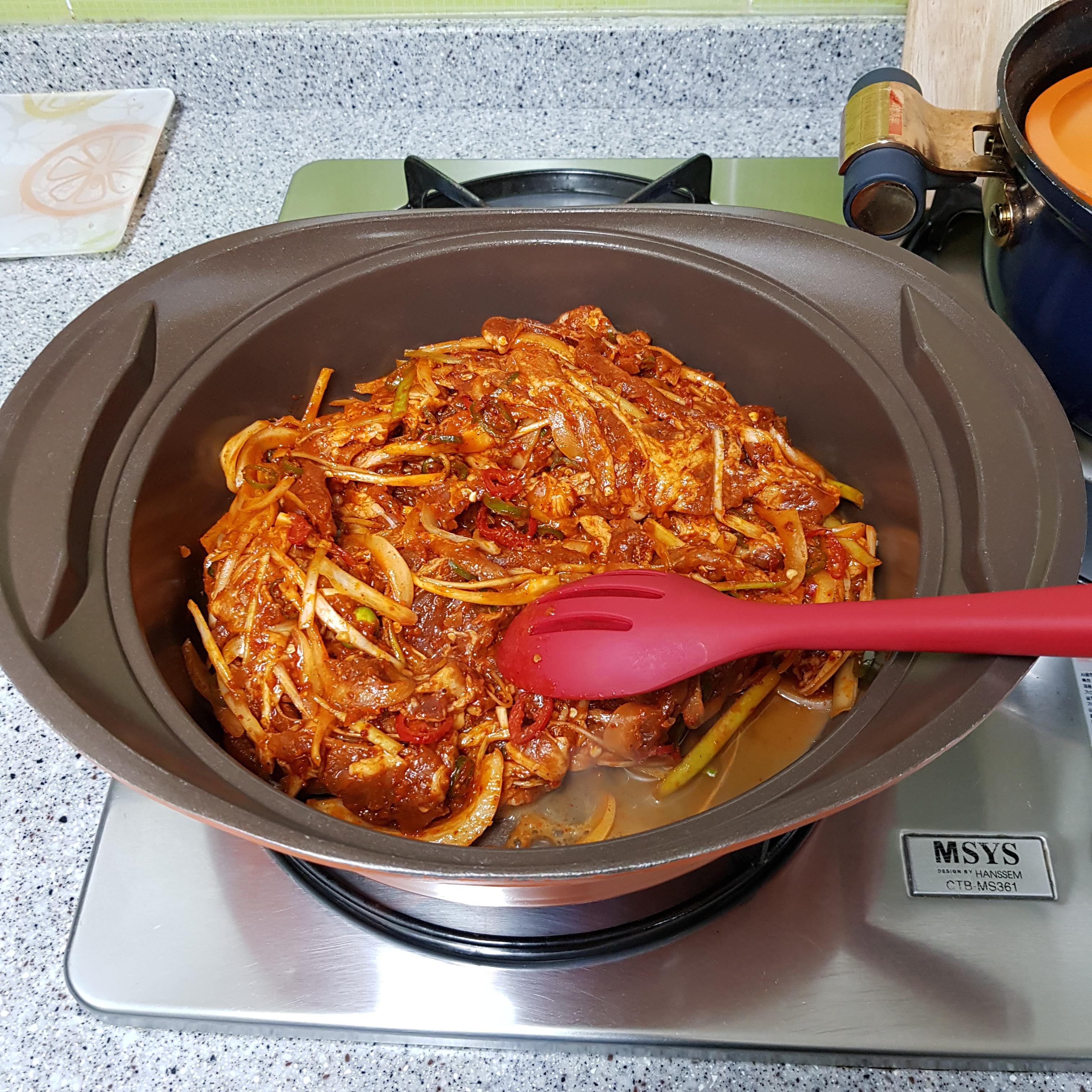 ▶ 재워둔 고기를 냄비에 넣고 중불에서 볶아주세요