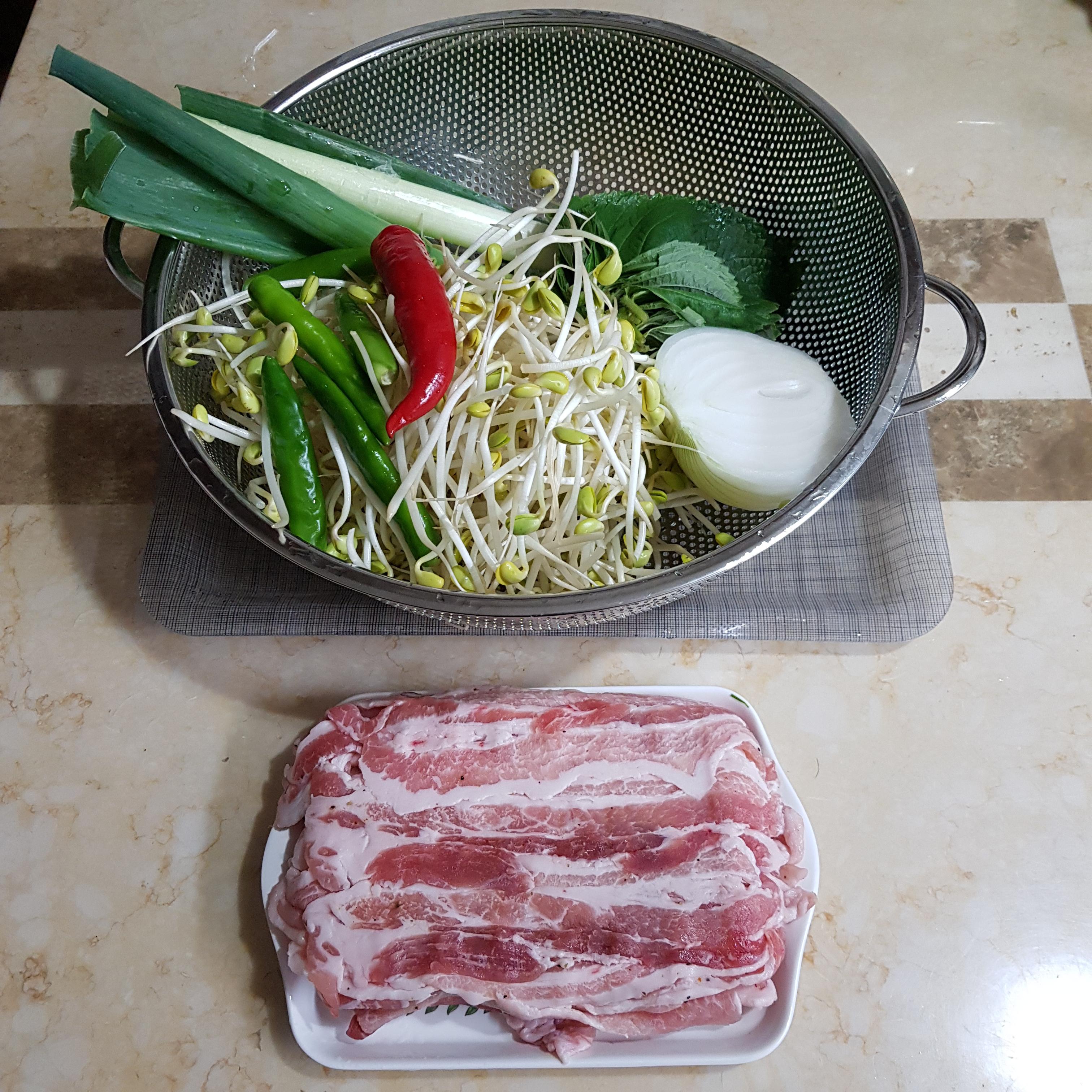 얇은 삼겹살 500g, 콩나물 400g, 대파 1대, 양파 반개, 깻잎 15장, 청양고추 5개, 홍고추 1개, 물 반컵, 통깨 1큰술, 꽃소금 2티스푼(콩나물 밑간용)