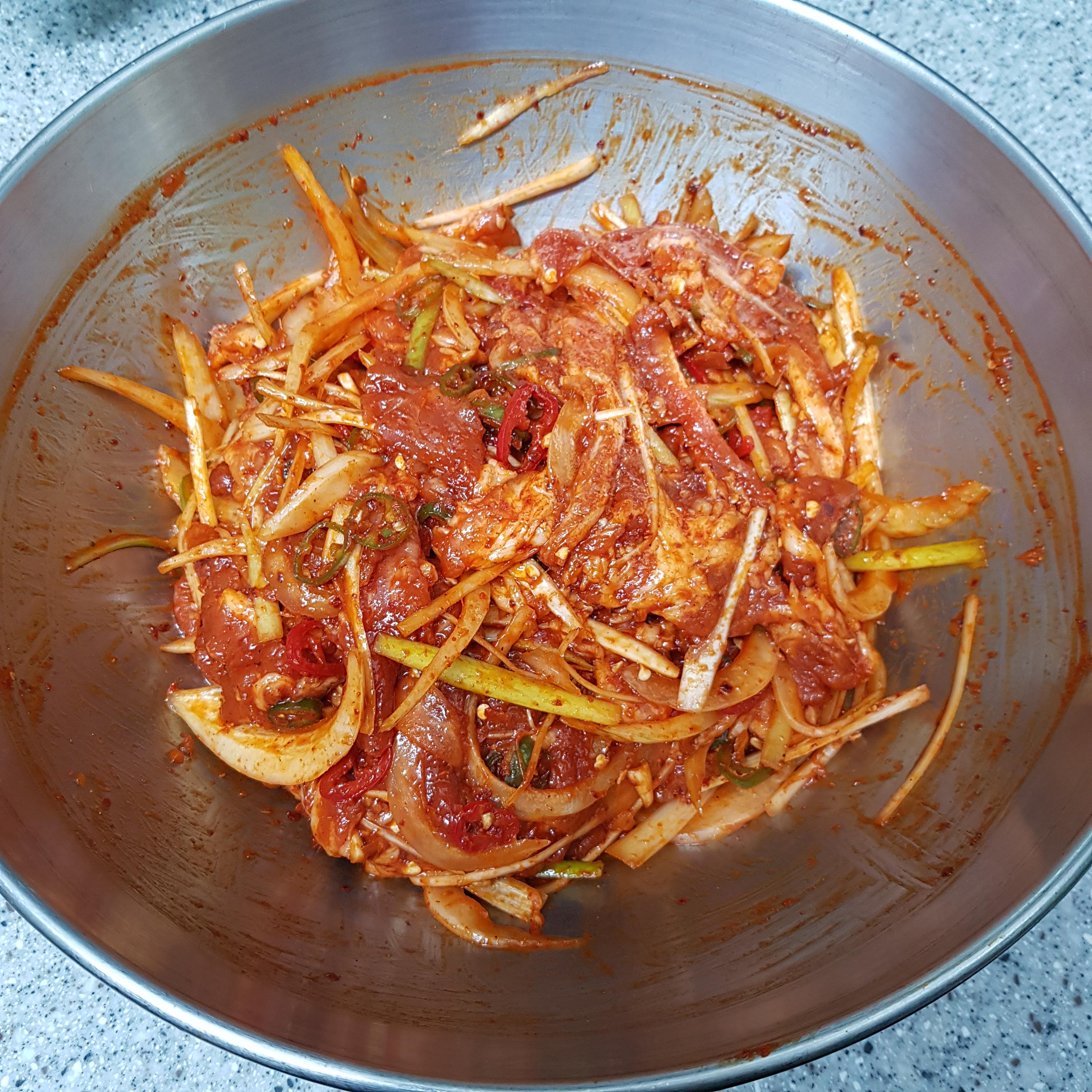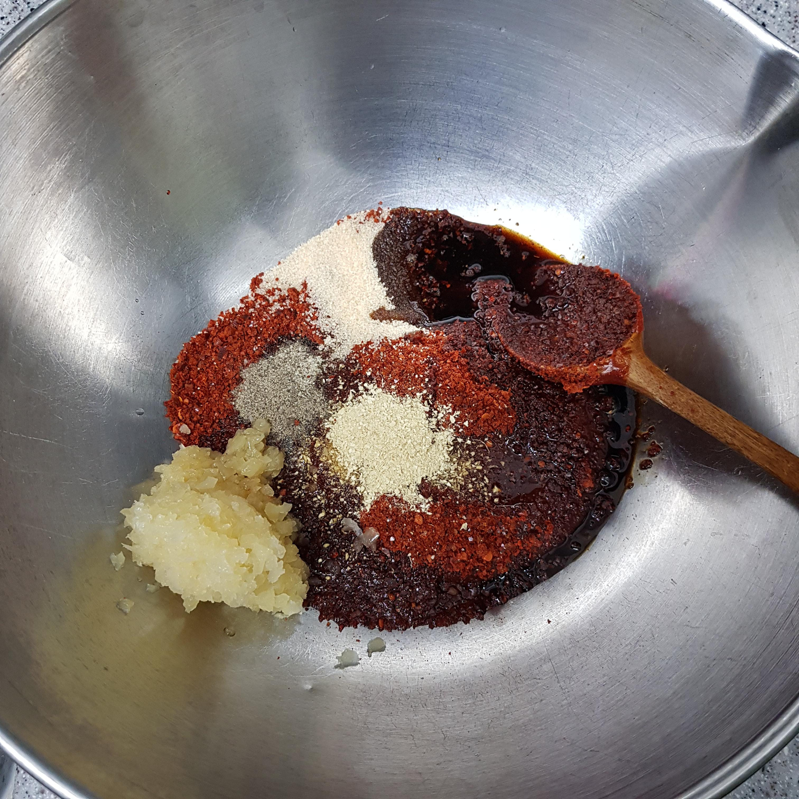 고추장 3큰술, 고춧가루 2큰술, 매실액 2큰술, 다진 마늘 1큰술, 생강 분말 1티스푼, 후추 반티스푼, 설탕 반큰술, 양조간장 3큰술