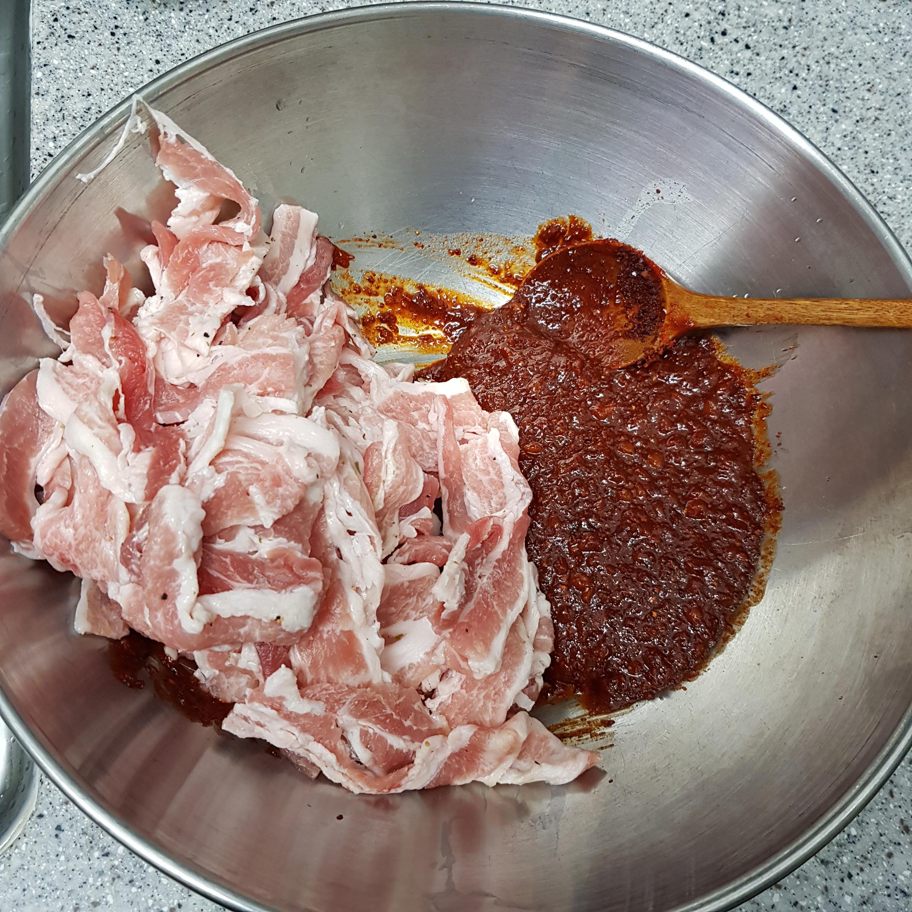 ▶ 준비해둔 김수미 콩나물불고기 양념에 삼겹살을 바로 넣지 마시고 양념을 한쪽으로 밀어 두고 삼겹살을 넣어 양념에 버무려주세요