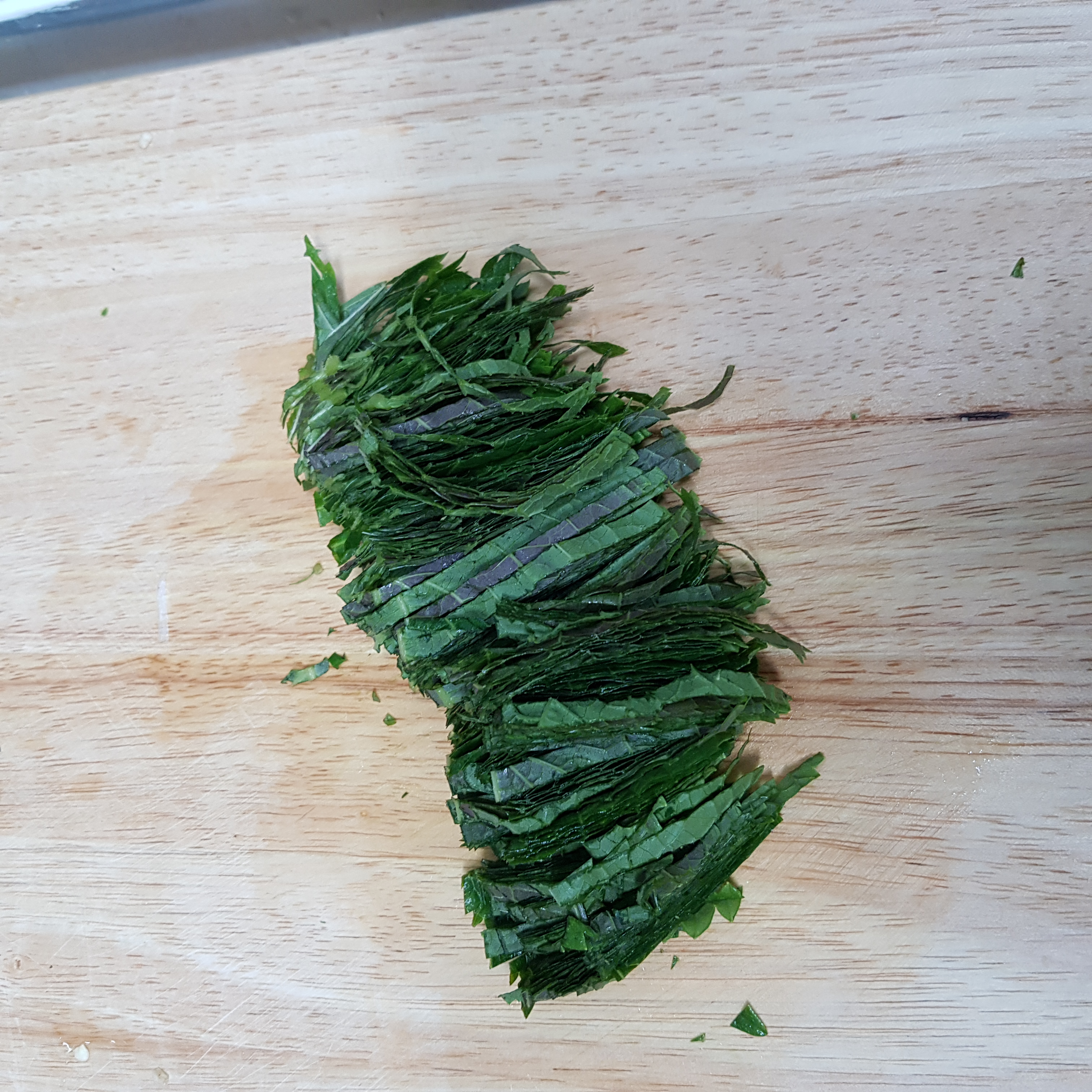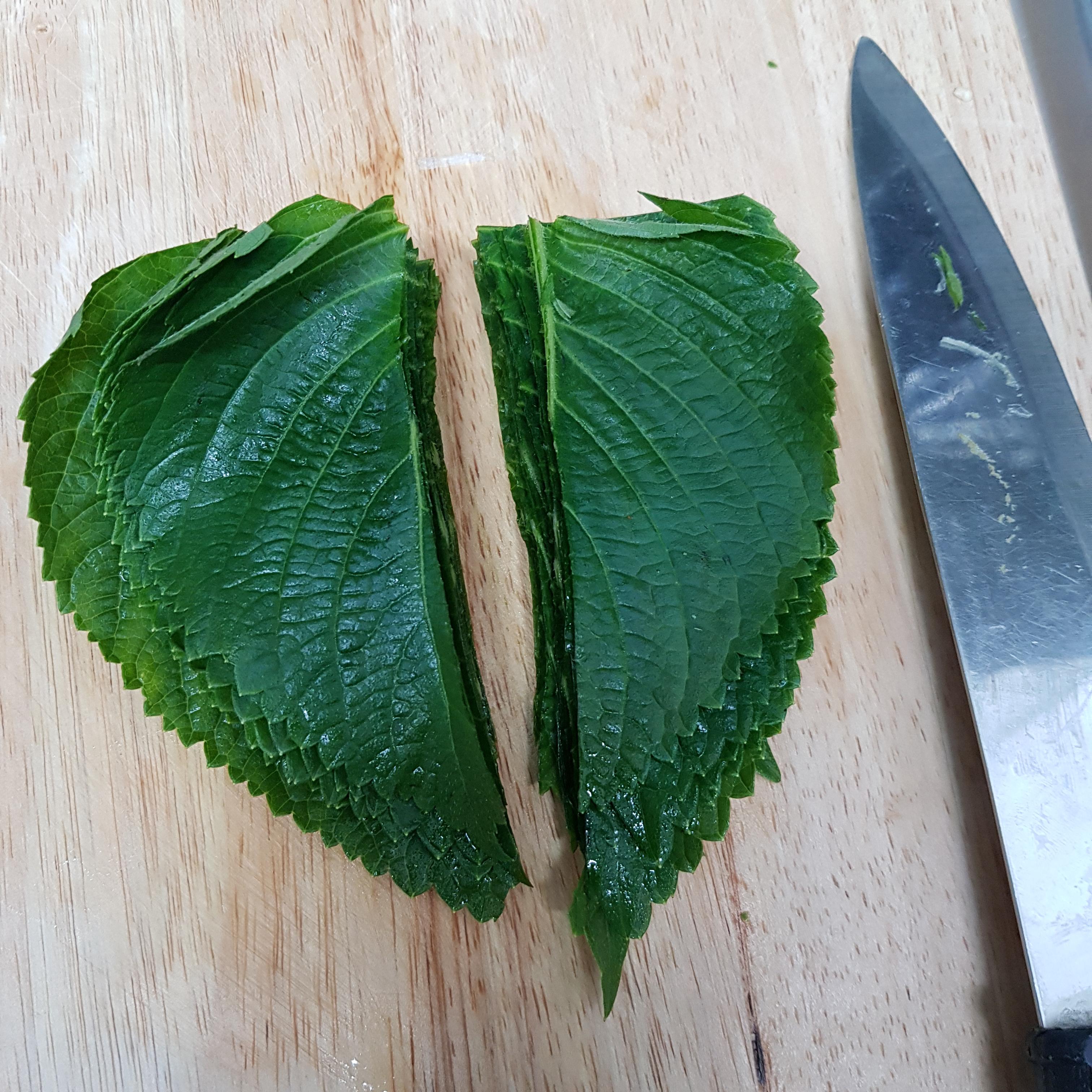 ▶ 깻잎 15장은 꼭지를 자르고 반으로 자른 후 가늘게 채썰어 준비해주세요