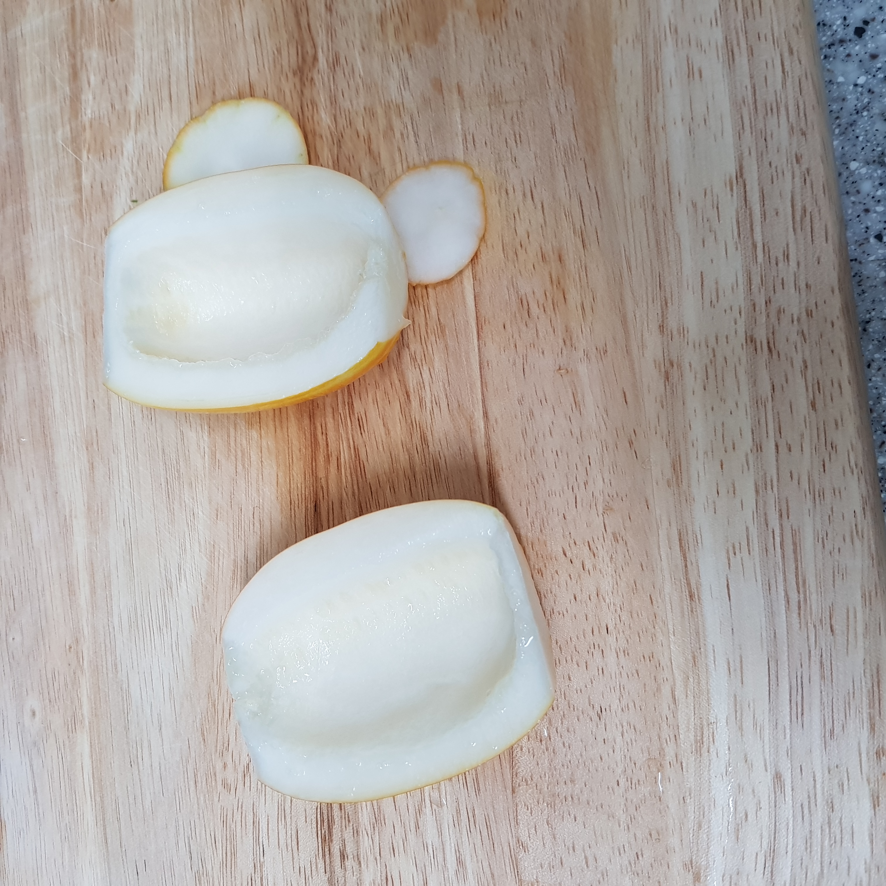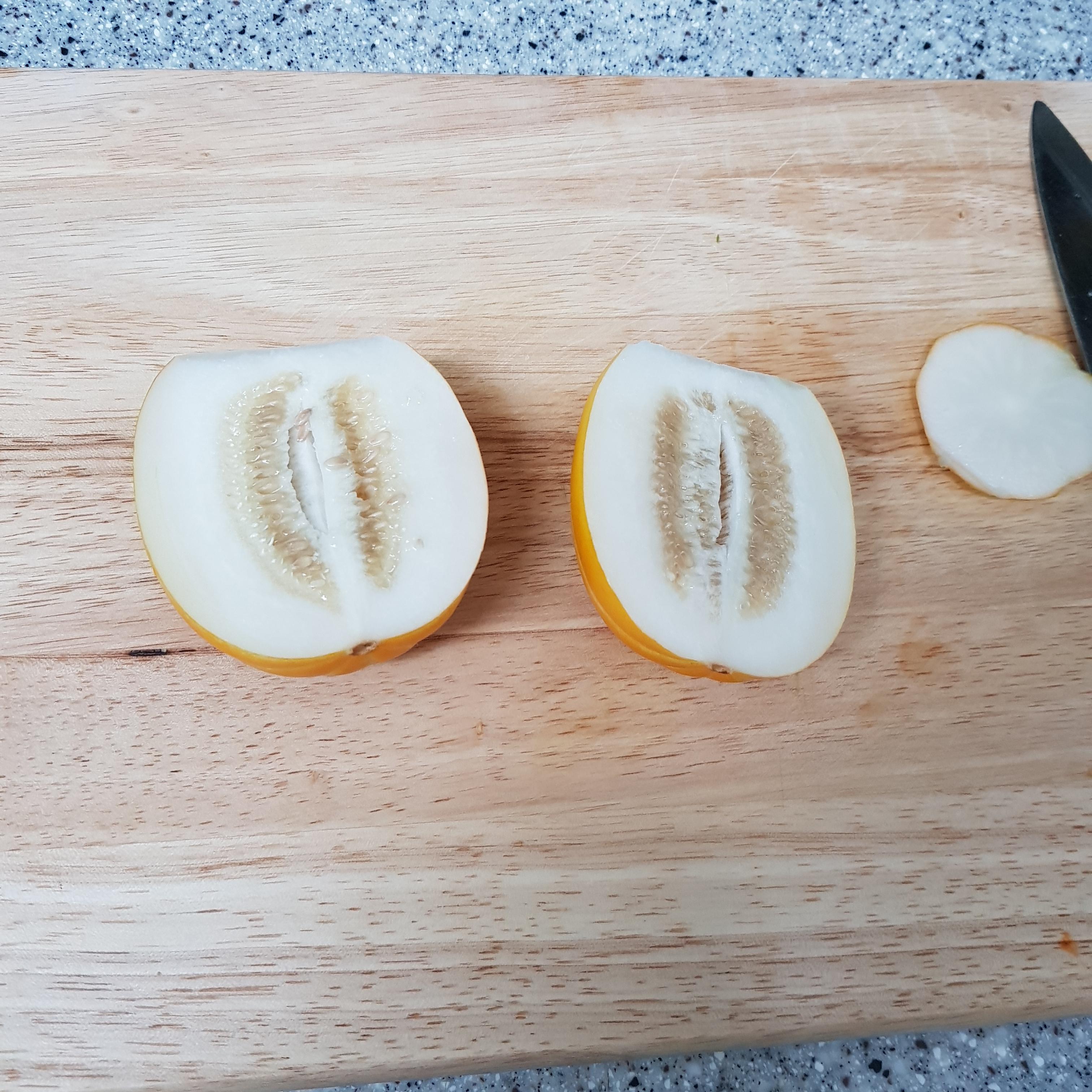 ▶ 깨끗이 씻은 참외는 오이와 마찬가지로 쓴맛이 나는 꼭지를 자르고 밑부분도 잘라준 후 반으로 잘라 스푼으로 참외 씨, 태좌를 긁어내 준비해주세요