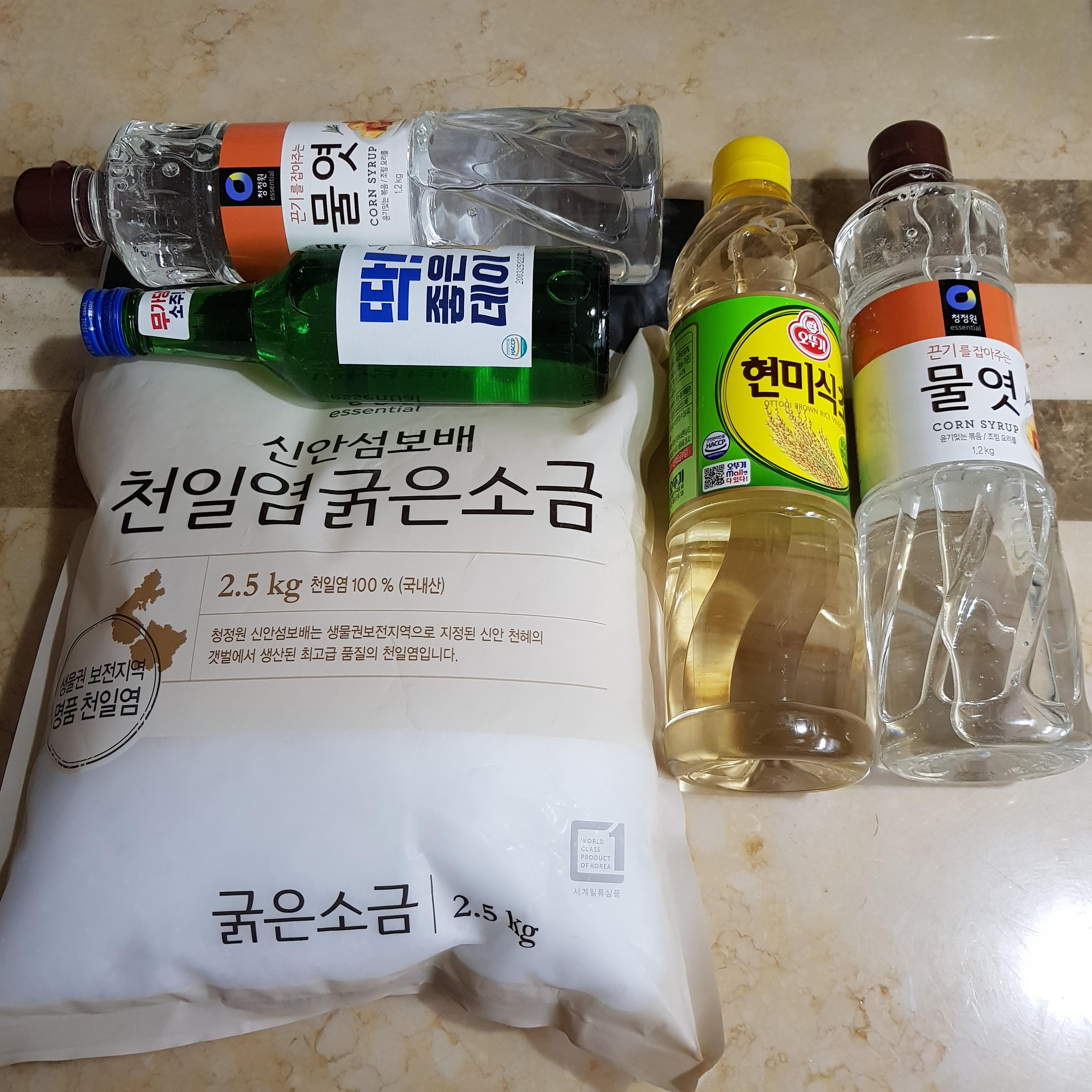 천일염 400g, 현미식초 1L, 소주 1병, 물엿 2L, 건고추 10개
