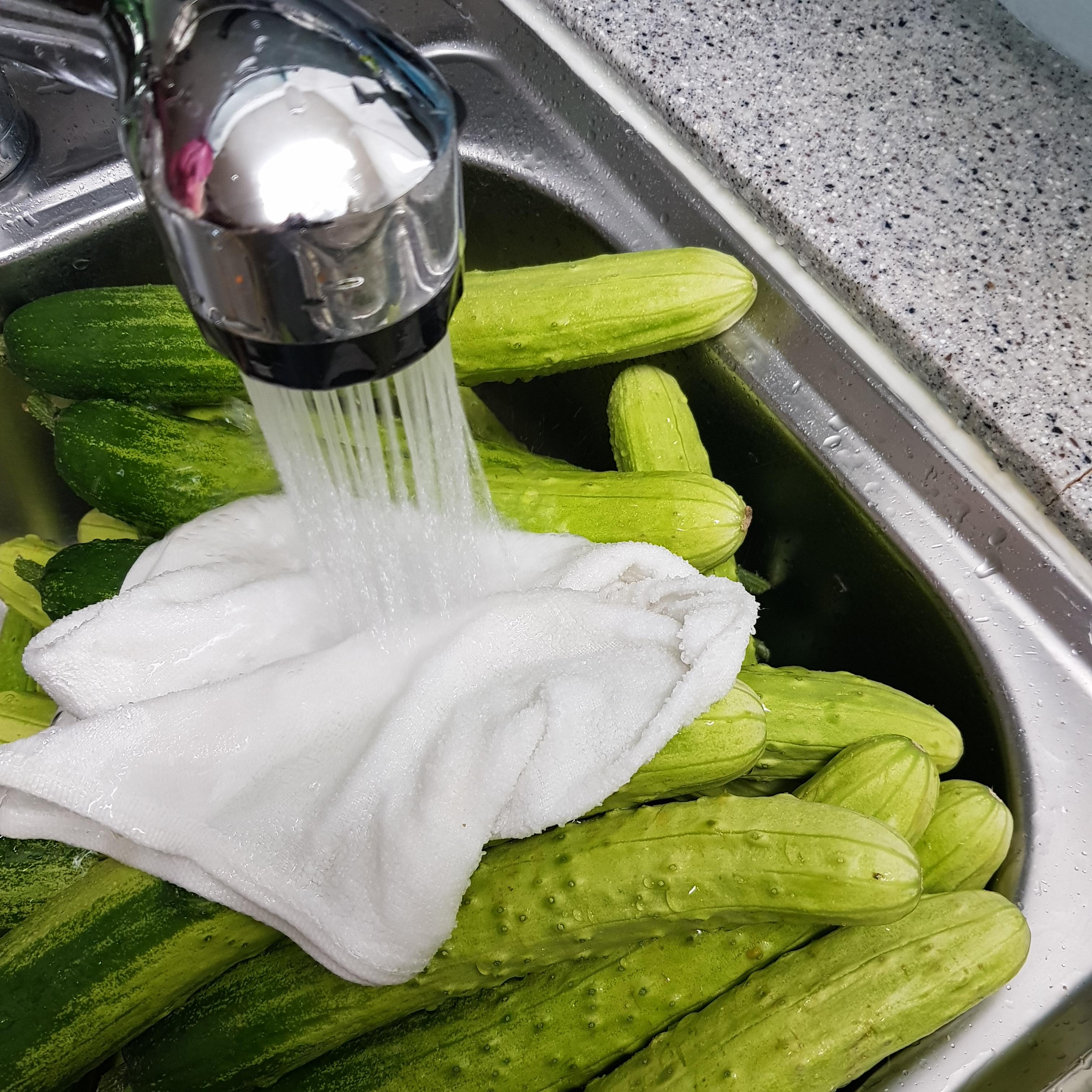 ▶ 일반적인 오이는 굵은 소금으로 문질러가며 씻어주는데 오이지 만들 때 오이를 굵은소금으로 문지르면 표면에 상처가 생겨 쉽게 무르고 상처 난 오이는 절이는 과정에서 곰팡이가 쉽게 생길 수 있기 때문에 부드러운 면포로 살살 문질러 씻어주세요