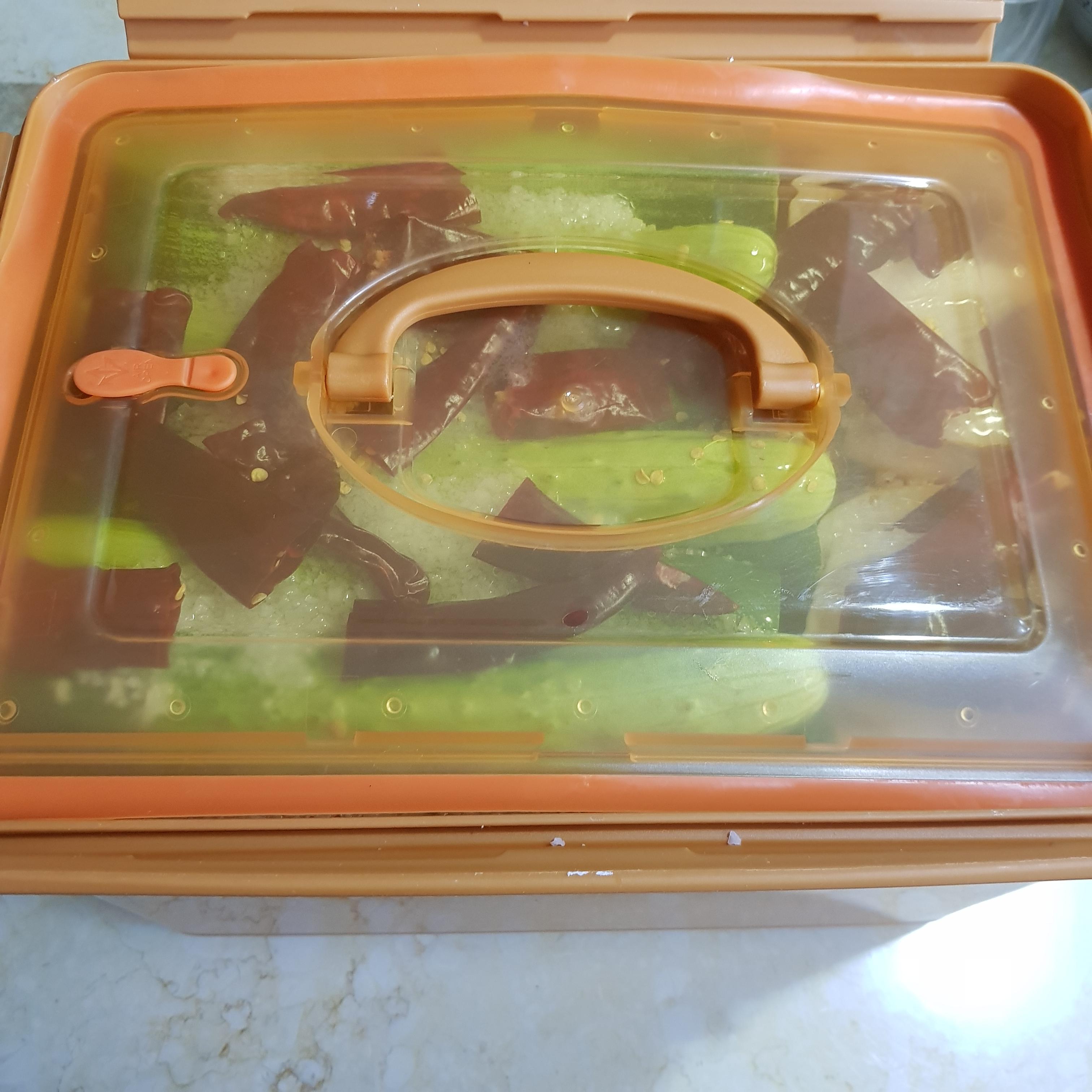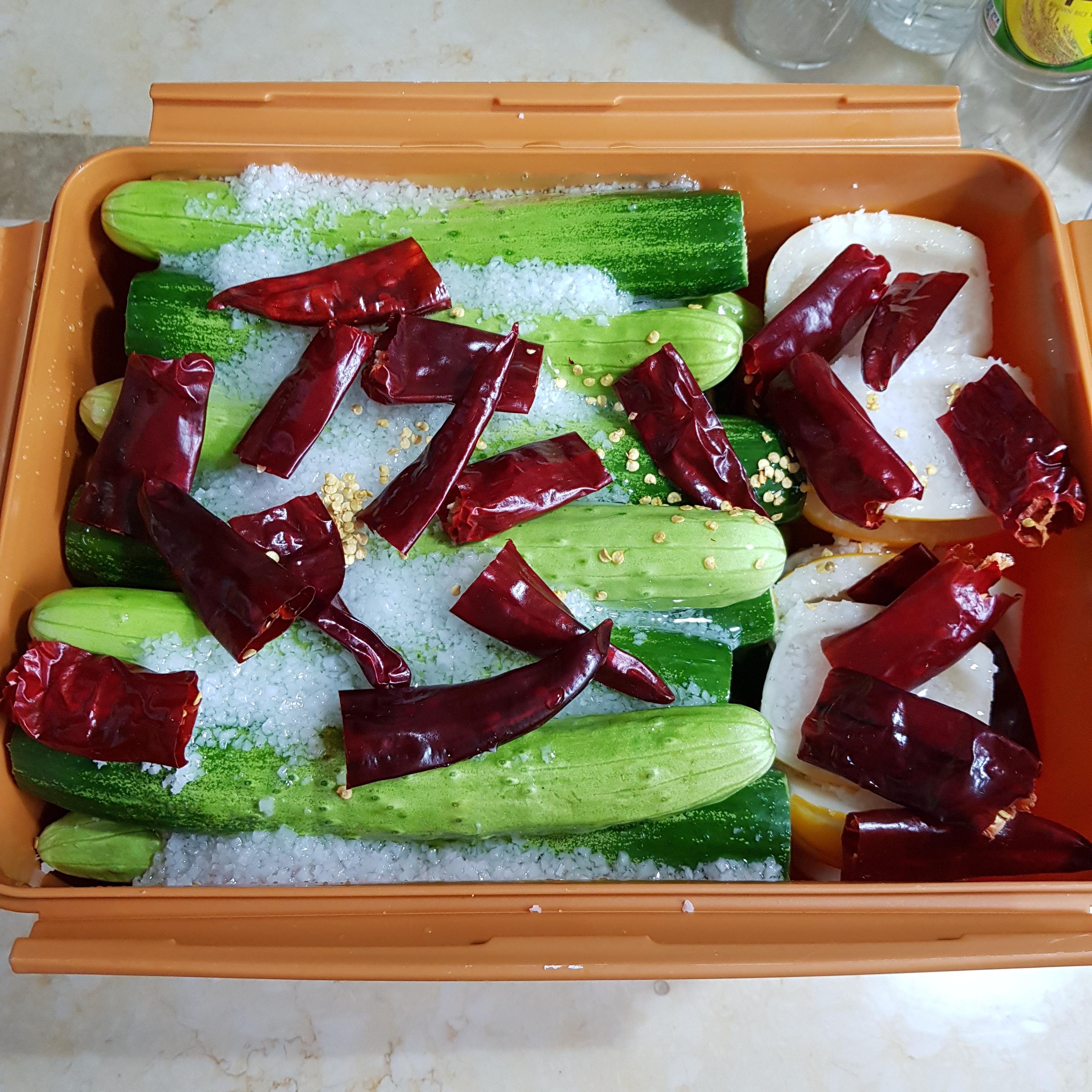 ▶ 15L 정도 크기의 김치통에 손질한 오이를 한쪽으로 담아주세요