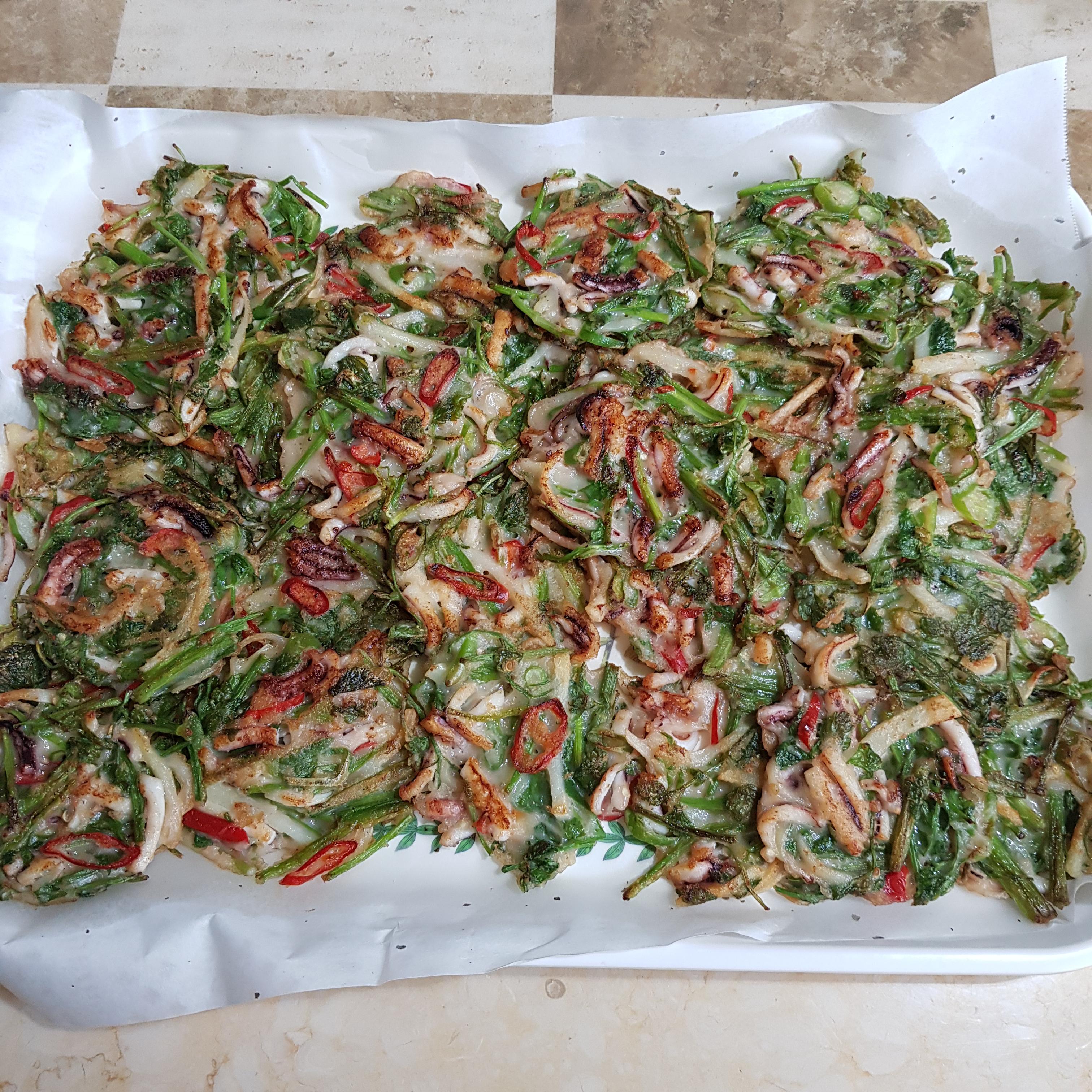 ▶ 완성된 돌미나리전 보기에도 군침이 돌죠? 보통 미나리랑 다르게 향이 강한 돌미나리와 오징어, 청양고추가 듬뿍 들어가 정말 맛있답니다^^