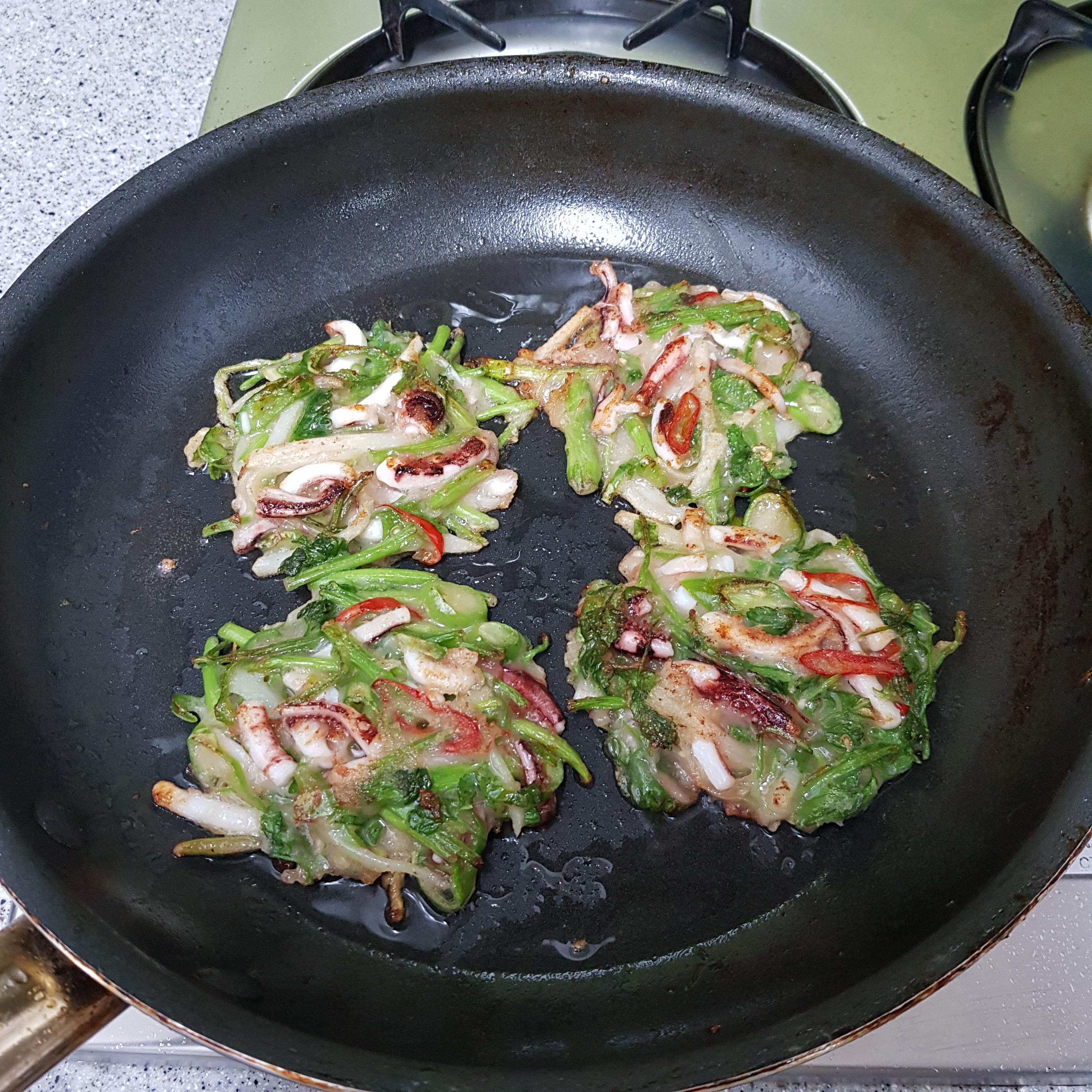 ▶ 예열된 팬에 기름을 두르고 반죽을 올려 앞뒤 노릇노릇하게 구워주세요 참고로 전의 식감을 위해 전은 보통 뒤집은 후 뒤집개로 눌러 주는데 돌미나리전은 눌리지마시고 그대로 구워주는게 살아있는 식감을 느낄 수 있어 더 맛있답니다 참고해주세요