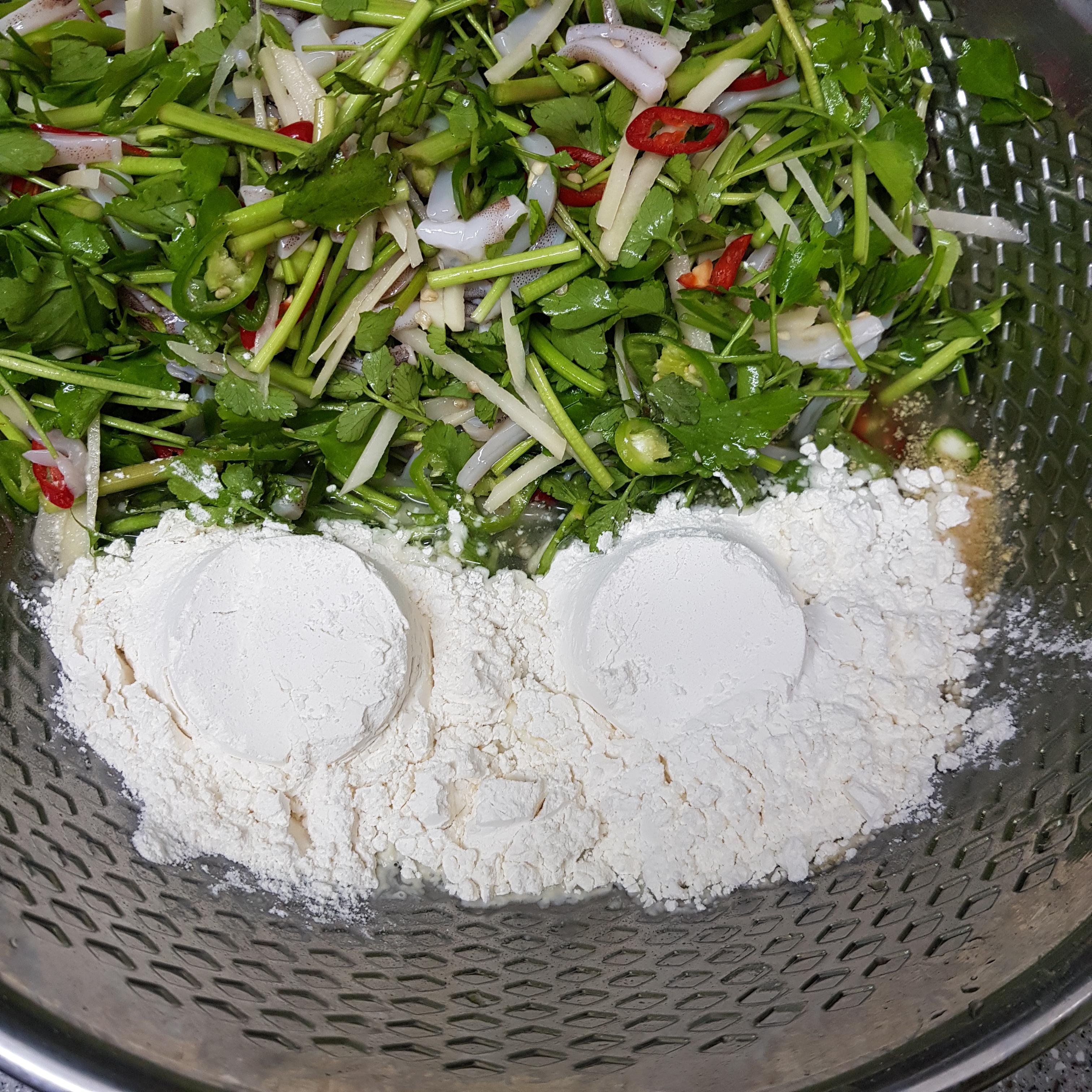 ▶ 생강분말 1티스푼, 튀김가루 1컵, 부침가루 2컵을 넣어주세요 생강분말이 약간의 오징어 비린내를 제거해주고 튀김가루와 부침가루를 섞어 반죽을 만들면 전의 바삭함을 더해준답니다