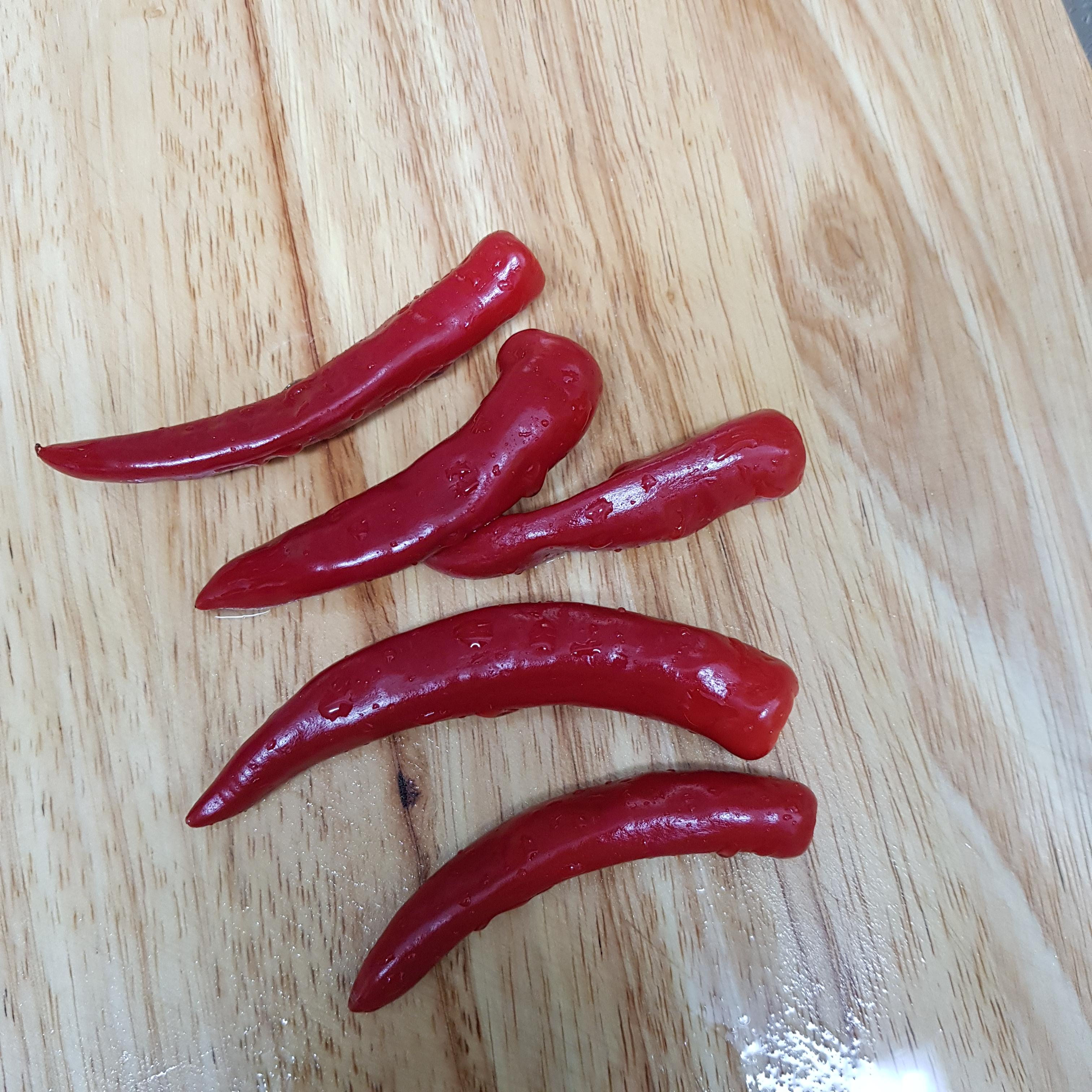 ▶ 홍고추도 마찬가지로 1개를 남겨두고 어슷썰기 해주세요 남은 청양고추와 홍고추 1개씩은 간장소스에 넣어줄 거랍니다