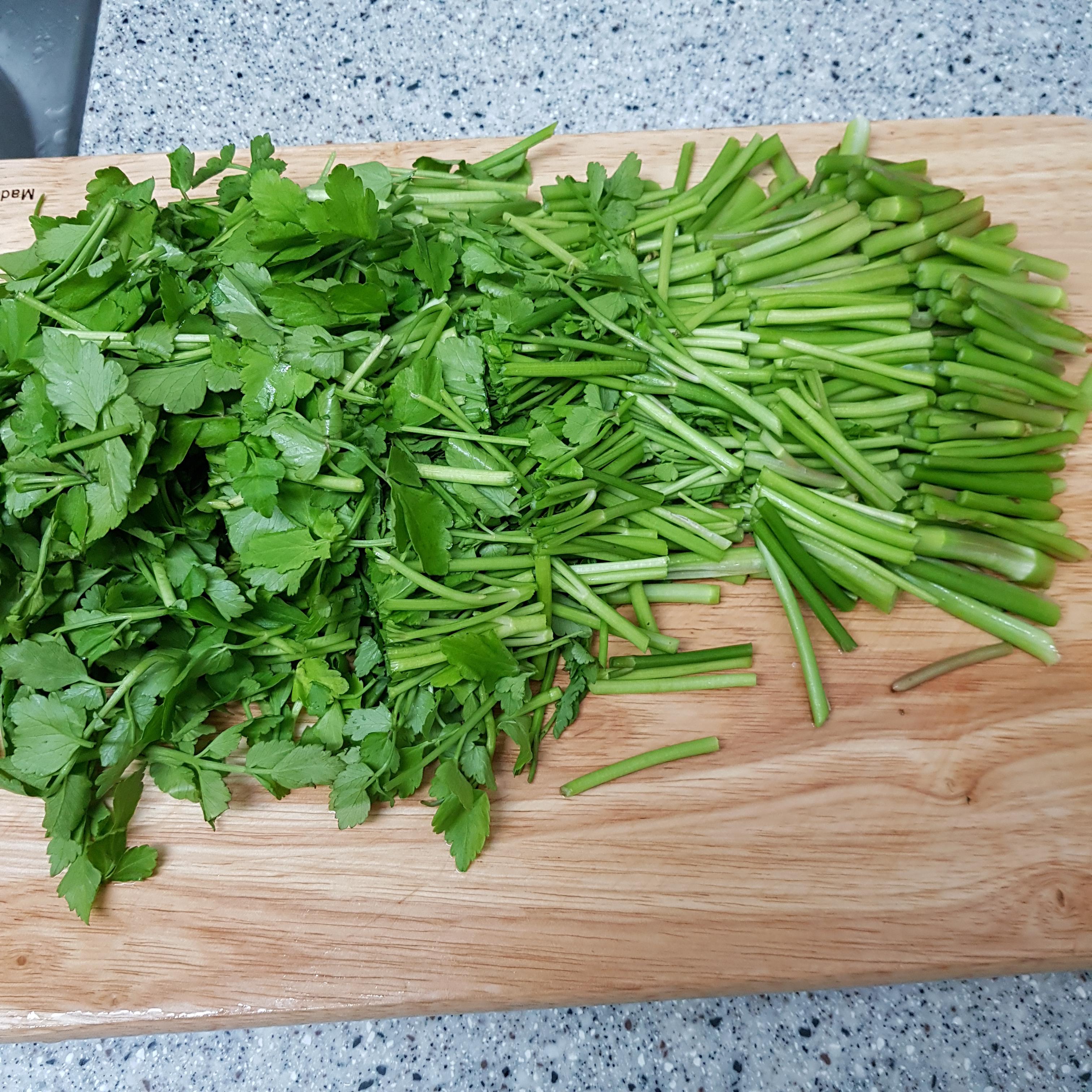 ▶ 돌미나리 300g을 손질한 후 씻기 전에 줄기, 잎 모두 3cm 정도로 썰어주세요