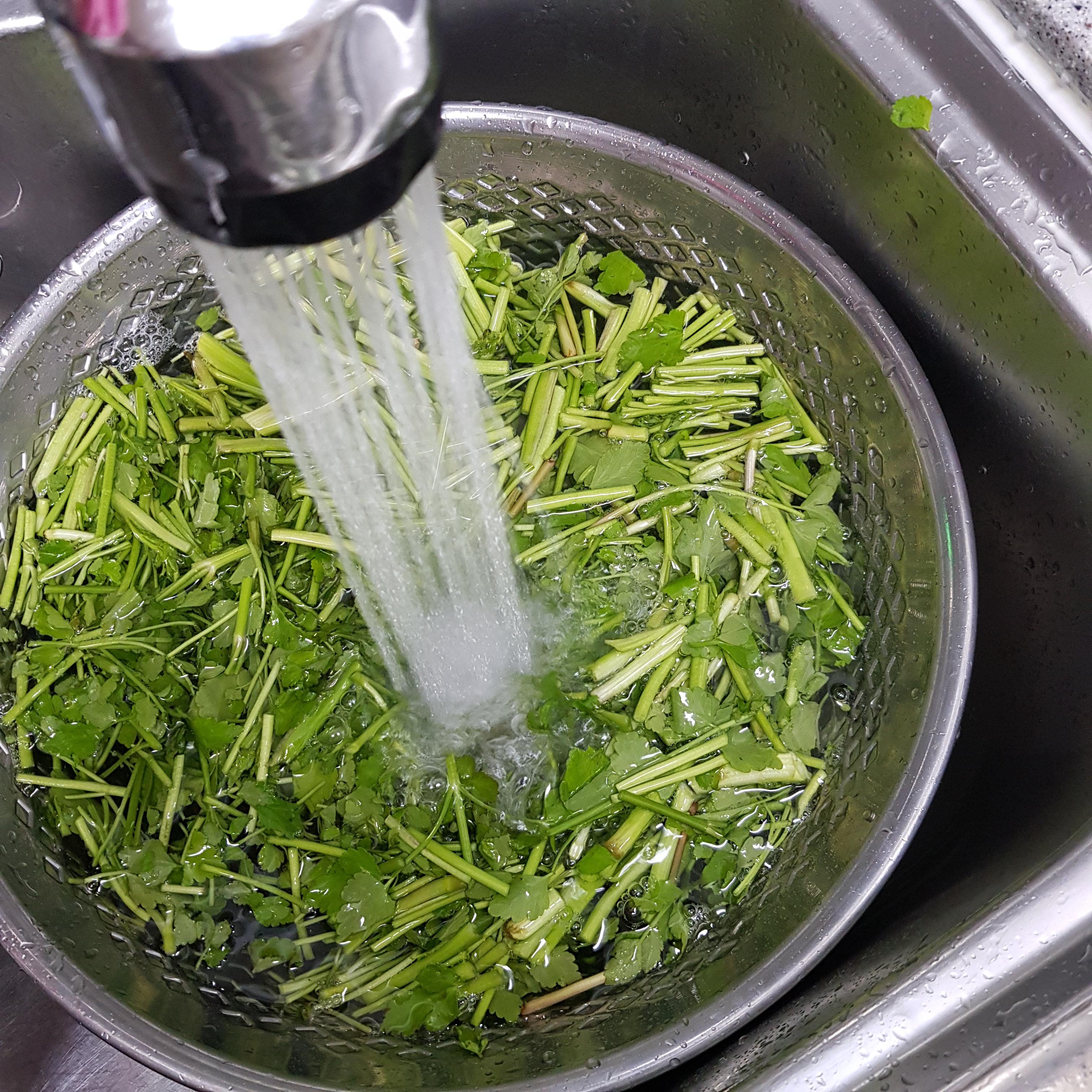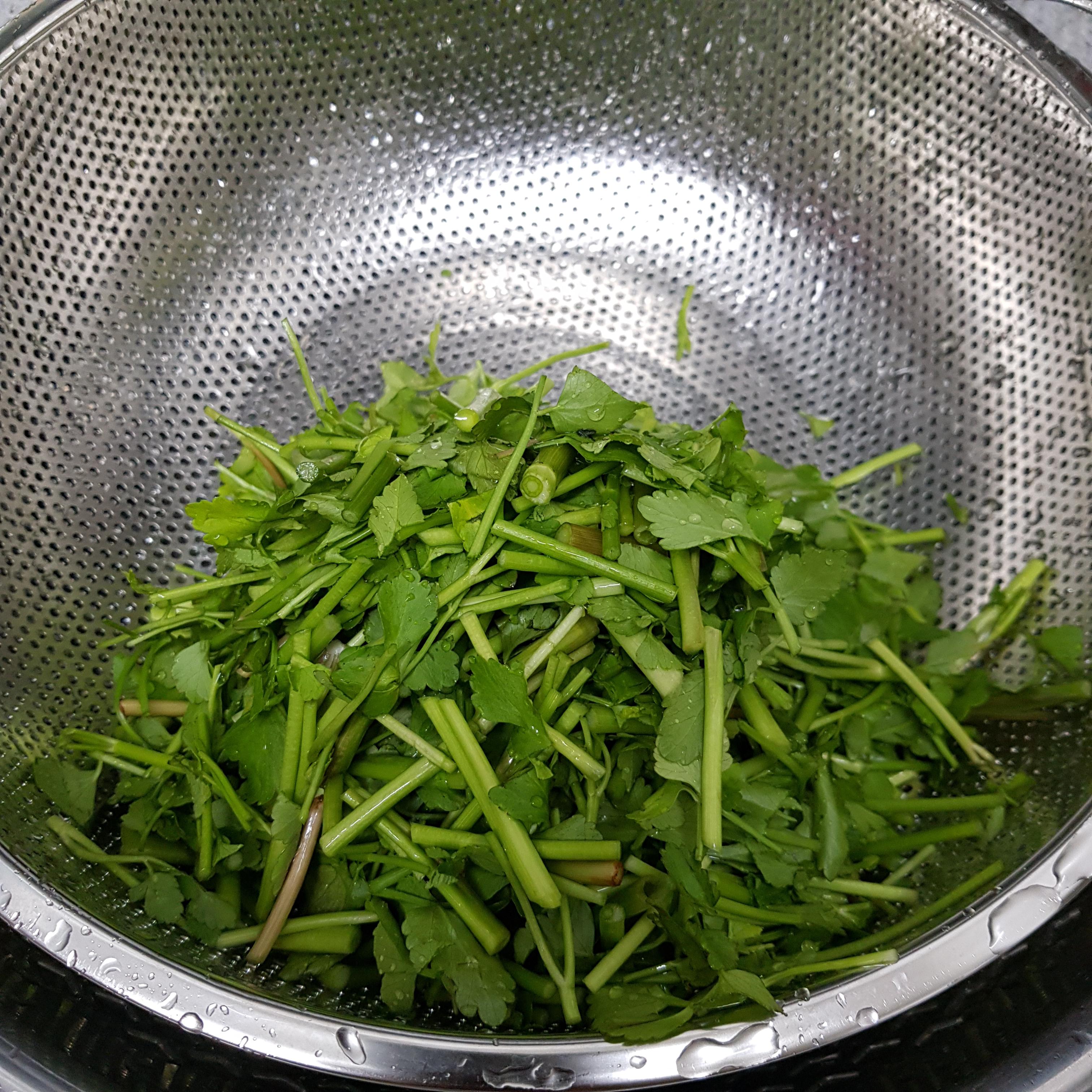 ▶ 작은 사이즈로 전을 부칠 거라 씻기 전에 썰어주었어요 씻기 전에 썰어주는 게 길이가 동일해 돌미나리전 만들 때 편해서 썰어준 후 씻어주고 채반에 밭쳐 물기를 뺴줬답니다
