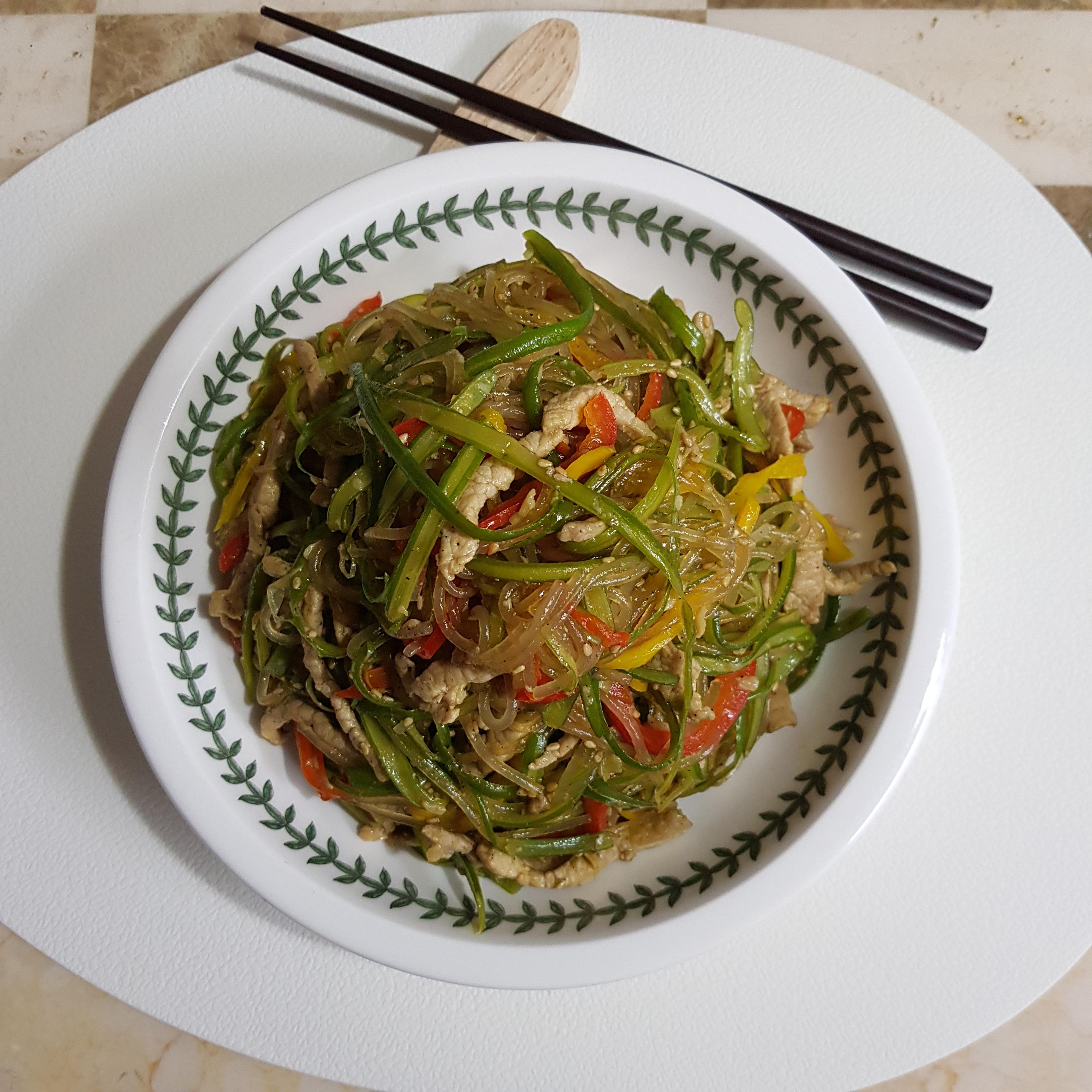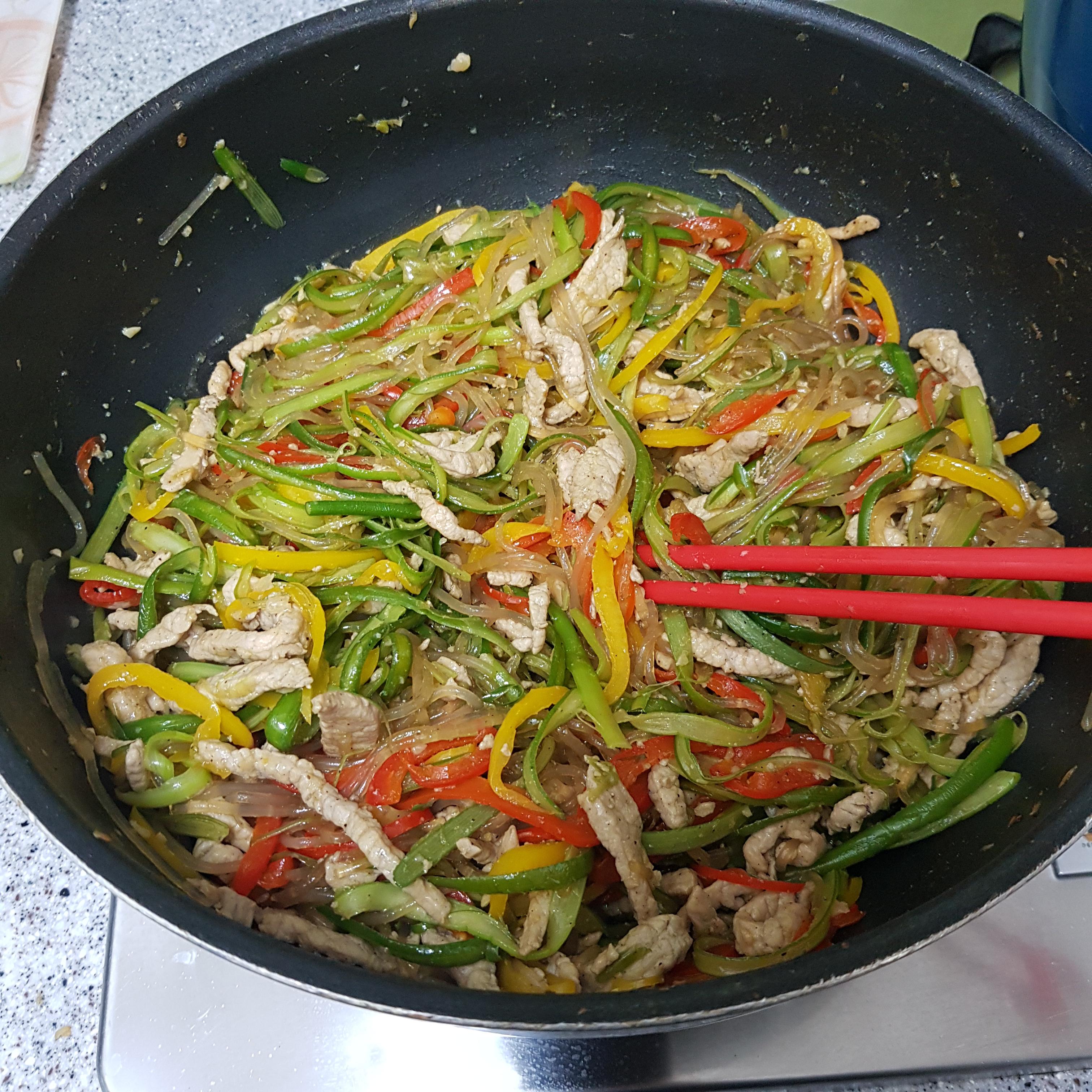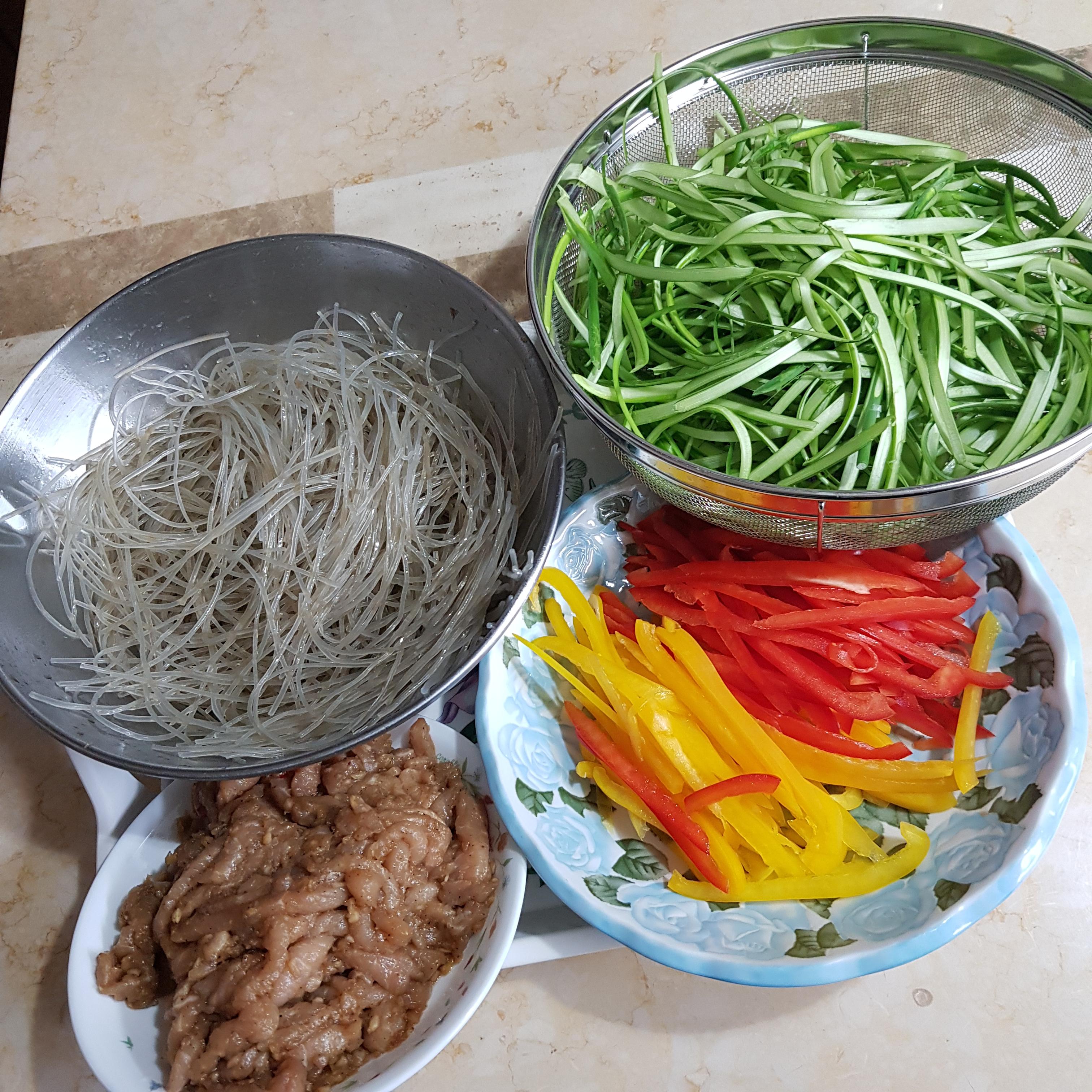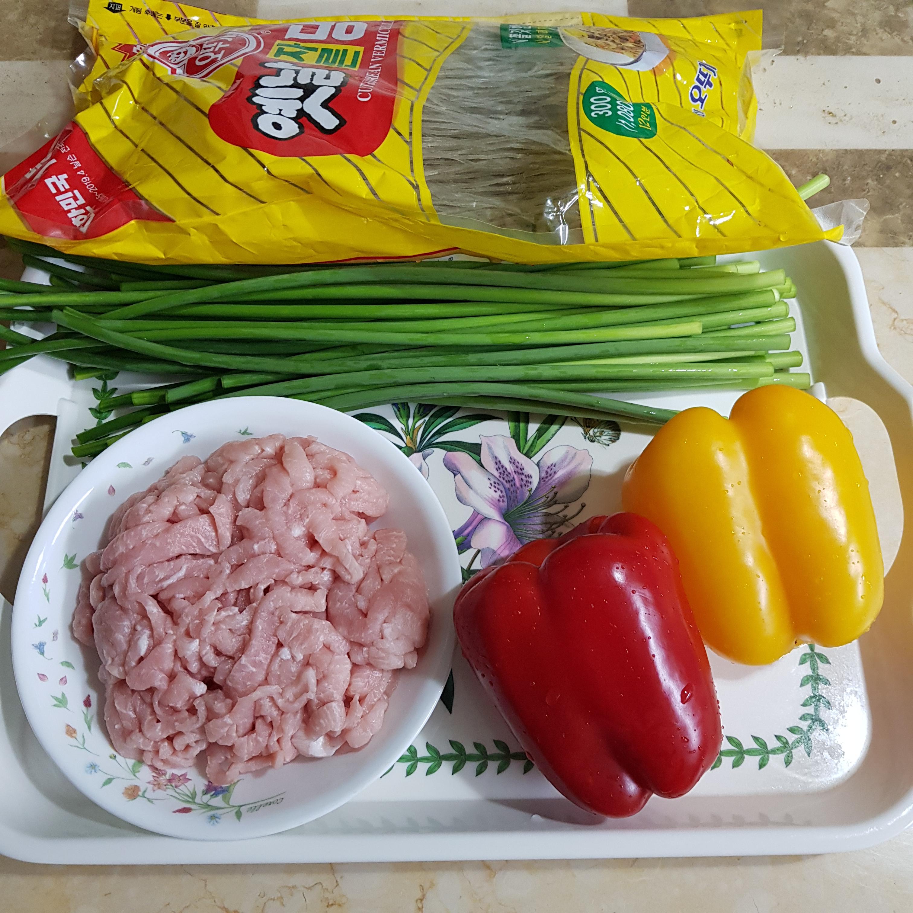 당면 200g, 마늘쫑 300g, 잡채용 돼지고기 350g, 빨간 파프리카 1개, 노랑 파프리카 1개