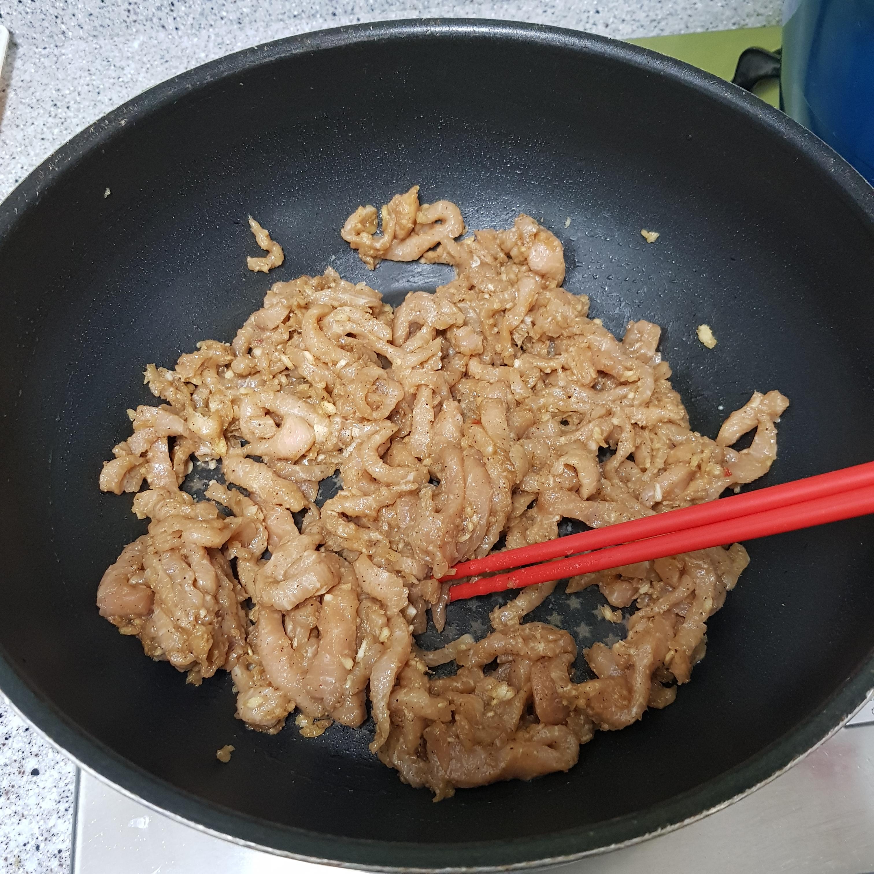 ▶ 예열된 팬에 밑간 해둔 잡채용 돼지고기를 중불에서 볶아주세요