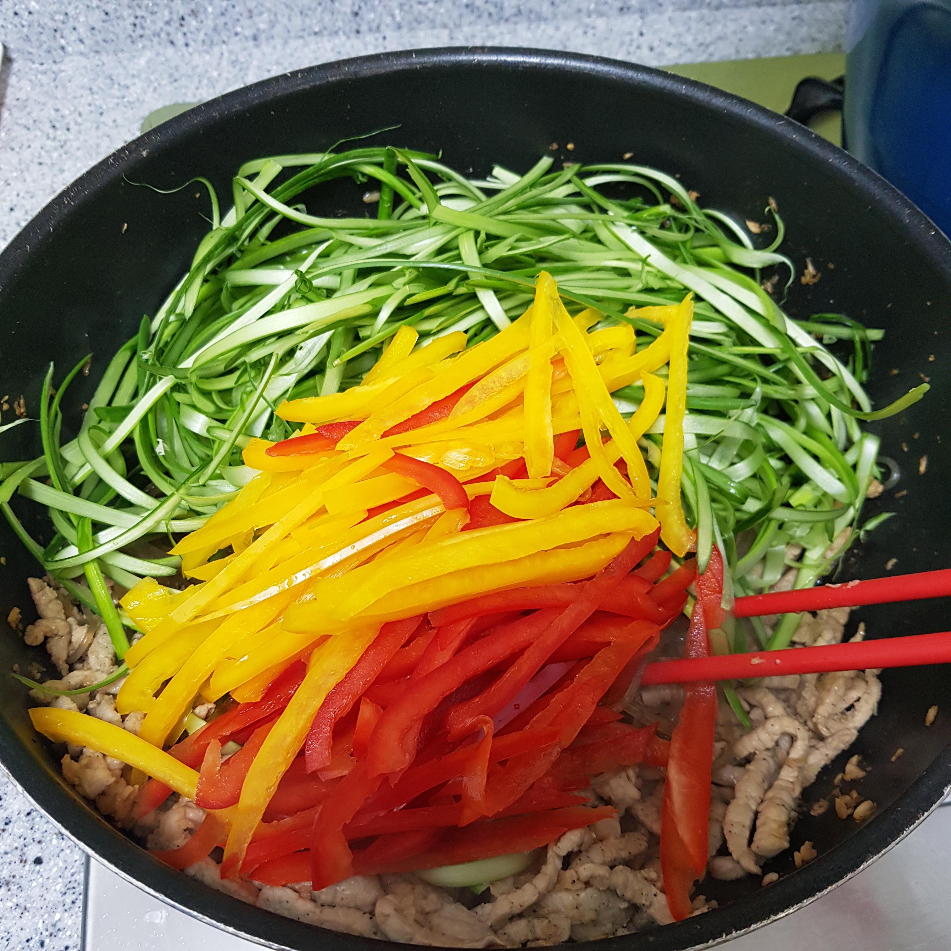 ▶ 손질한 파프리카, 마늘쫑을 넣고 볶아주세요 소고기를 넣은 경우 육즙으로 볶아주면 되지만 저처럼 돼지고기를 준비하셨다면 약불로 볶다가 재료가 타지 않게 물을 조금 넣어주면서 볶아주세요