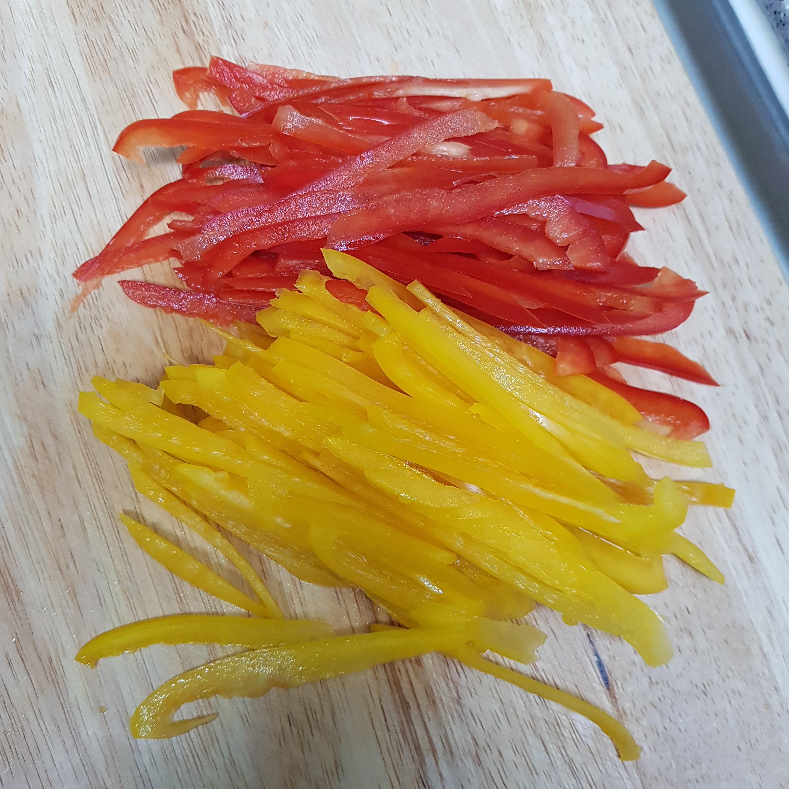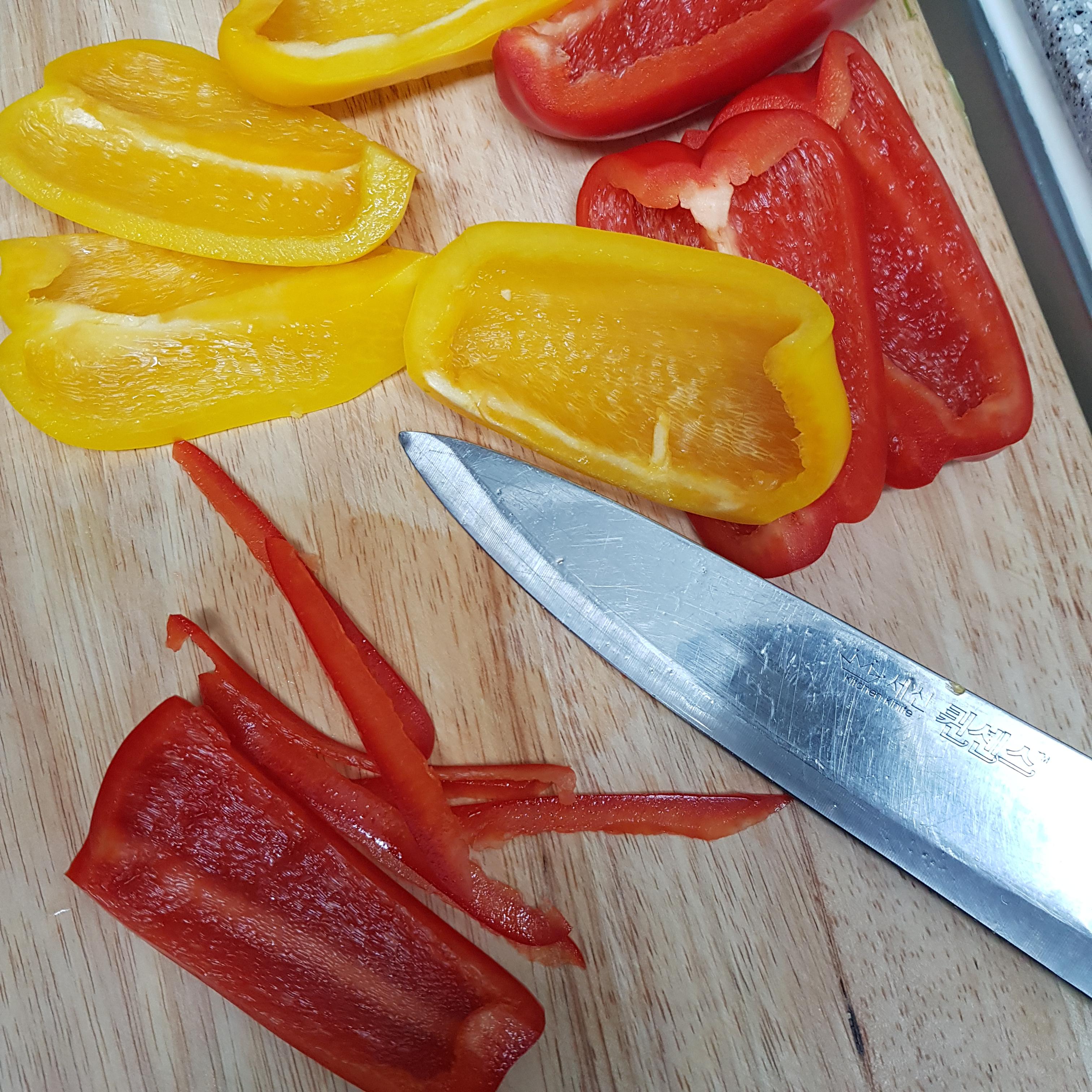 ▶ 파프리카는 반으로 잘라 씨를 제거해주고 최대한 당면처럼 얇게 채썰어주세요 참고로 파프리카를 썰때는 매끈한 면보다 안쪽면으로 썰어주는 게 미끄럽지 않아 손 다칠 위험도 적고 가늘게 잘 썰어진답니다