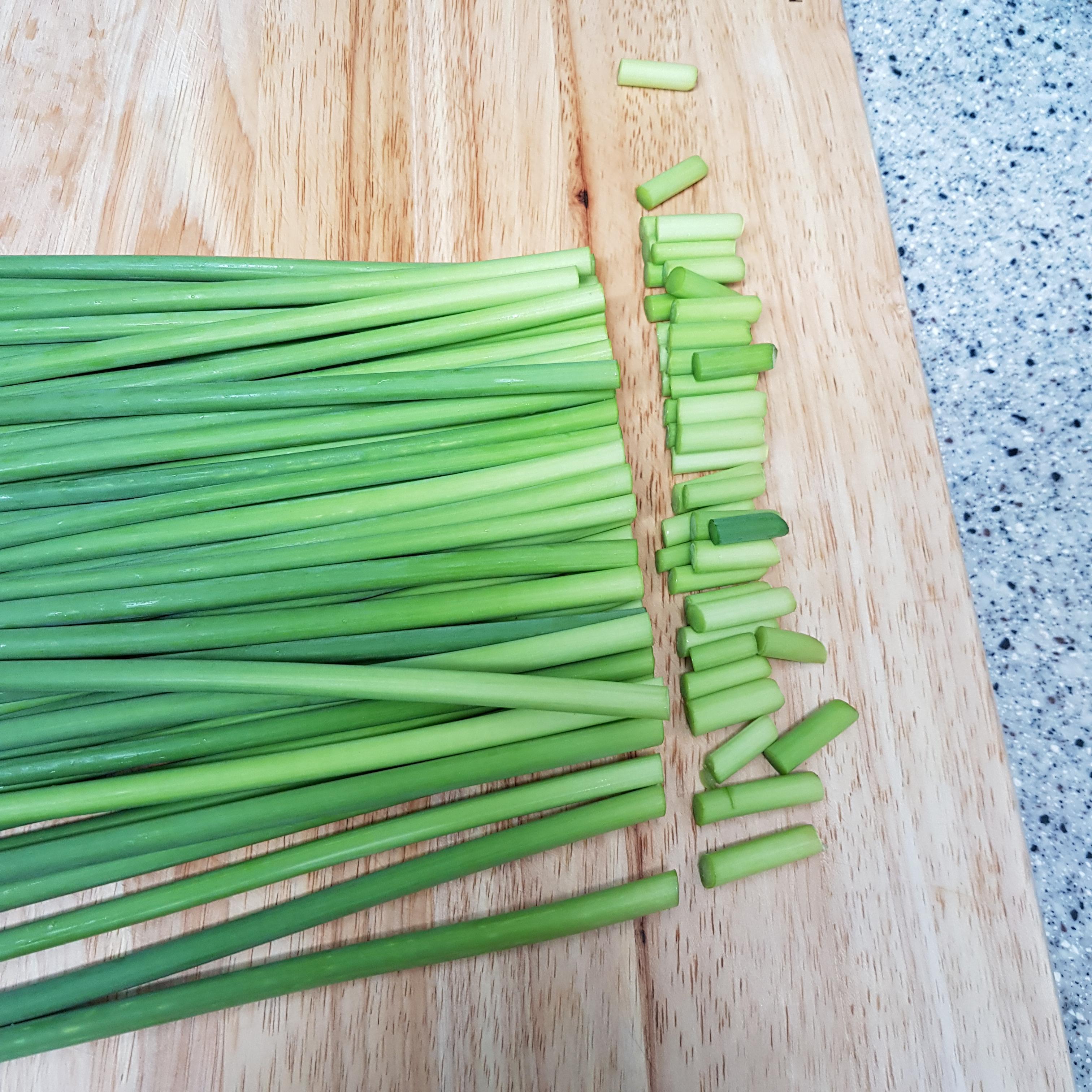▶ 만약 마늘쫑 손질이 서툴러서 조금 두껍게 썰어졌다면 끓는 물에 소금 1큰술 넣고 30초만 데쳐주세요 가늘게 채 썰어주는 게 식감이 질기지 않고 좋답니다 참고해주세요