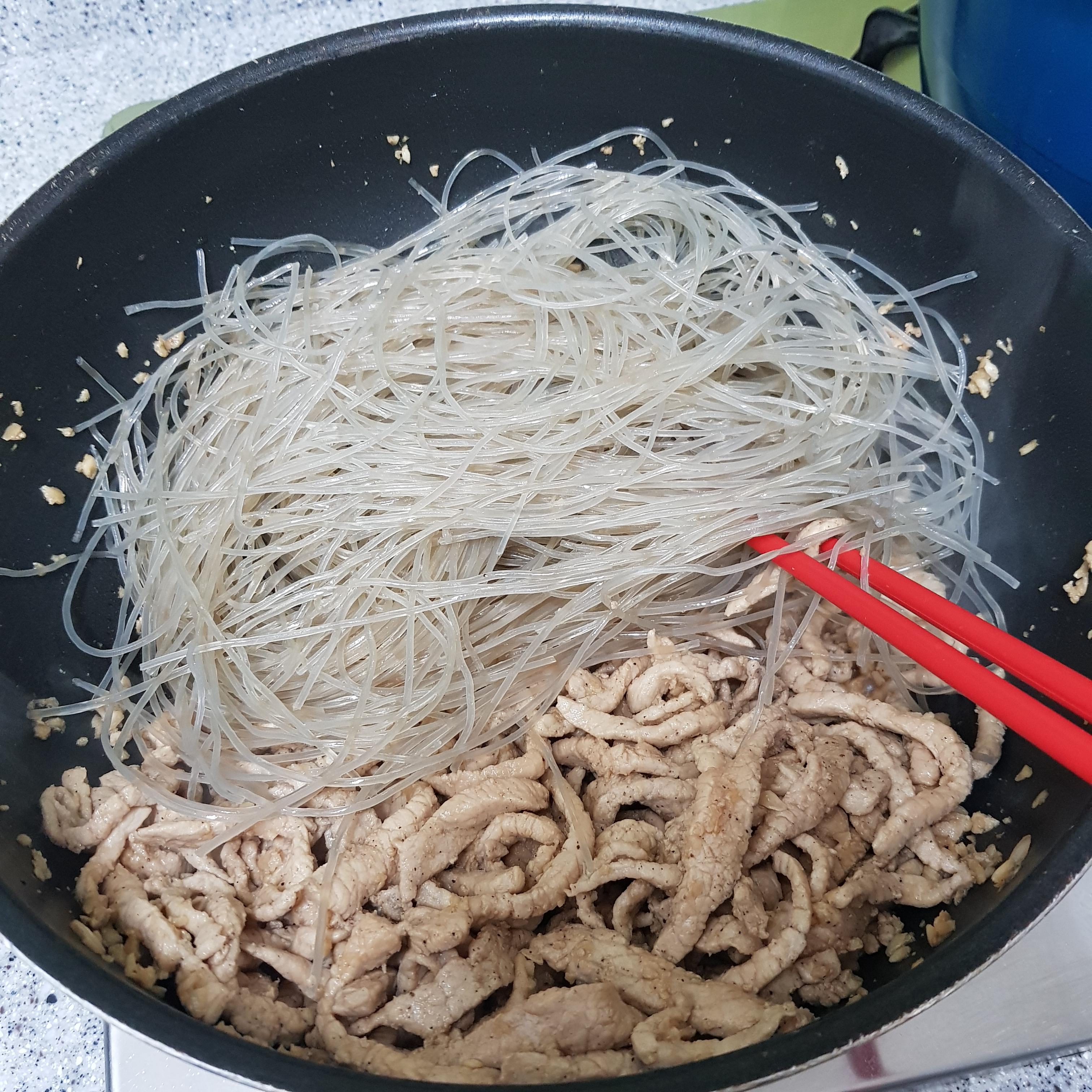 ▶ 어느 정도 고기가 익으면 한쪽으로 고기를 밀어 두고 불린 후 밑간을 해둔 당면을 넣고 볶아주세요 이때부터는 약불에서 볶아주세요