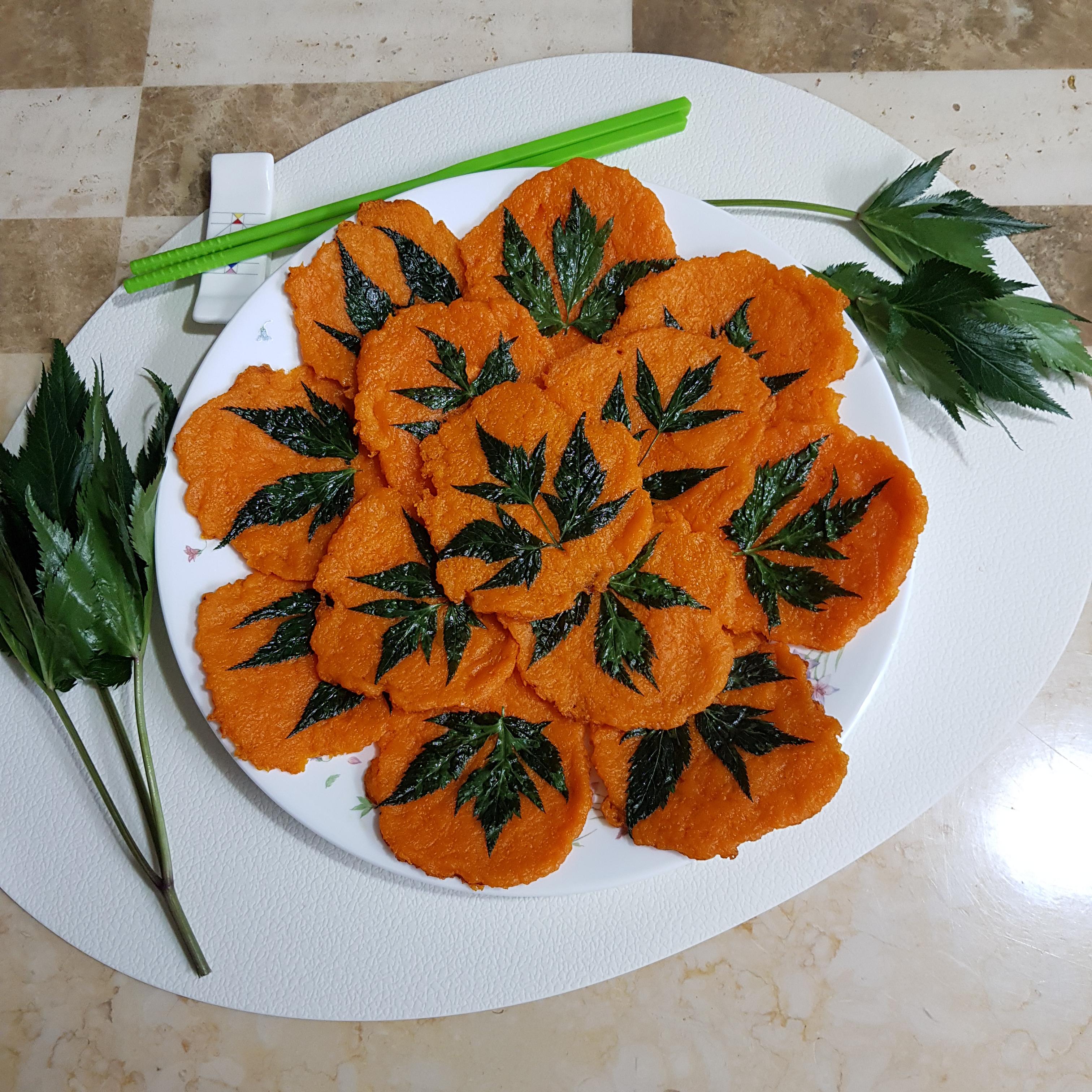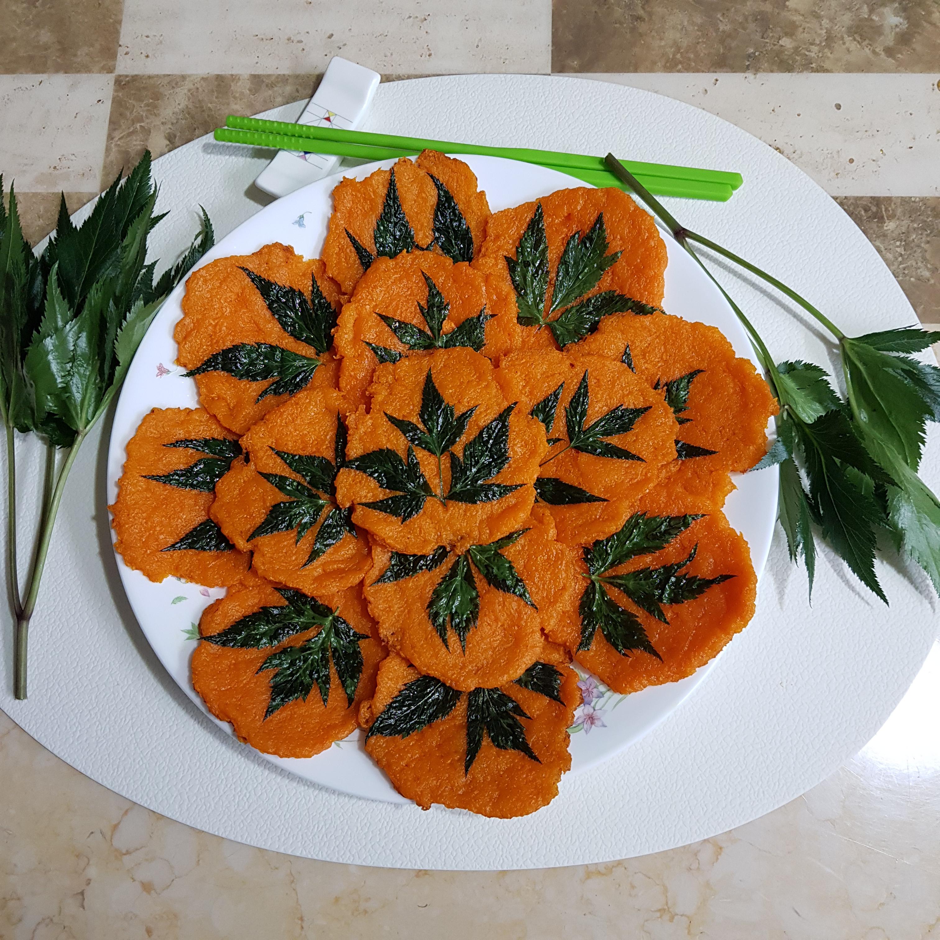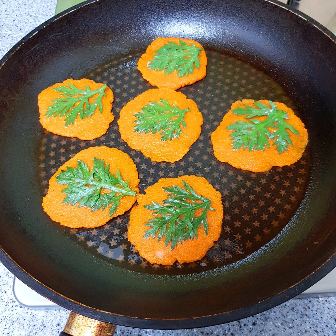 ▶ 뒤집어서 당귀잎 올린 부분은 살짝만 구워서 당귀잎의 색감을 살려주면 당근전 만드는 법 완성입니다