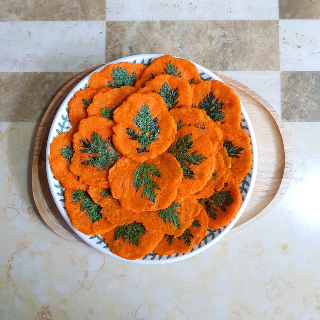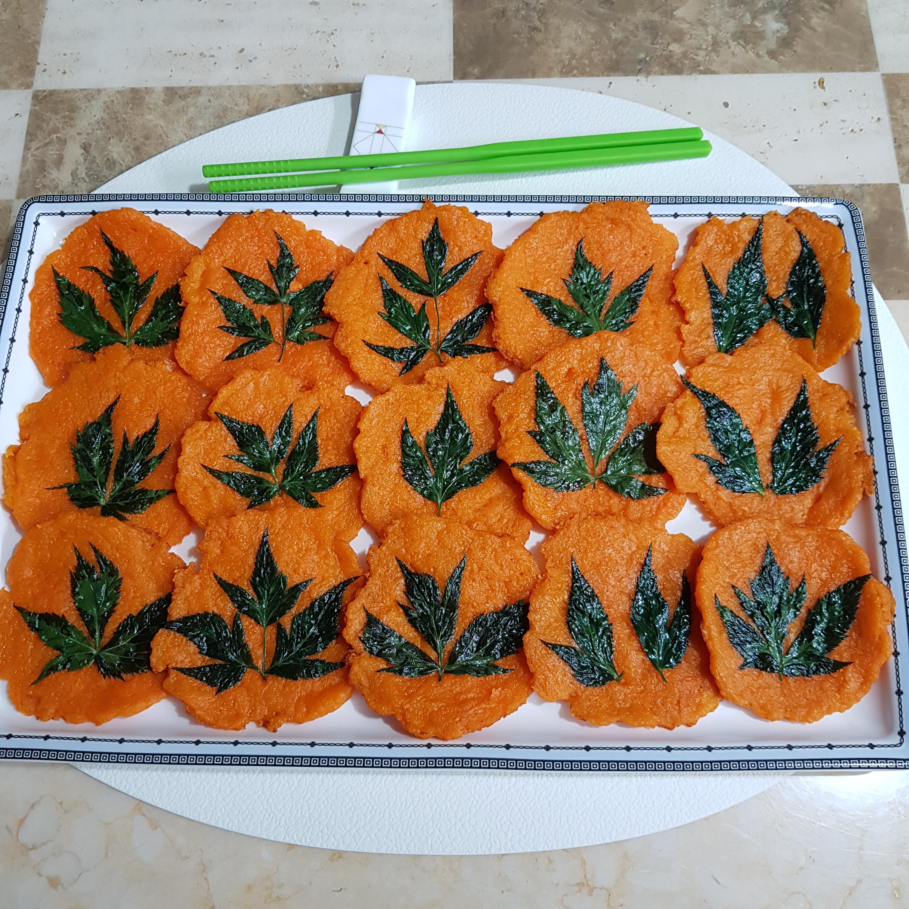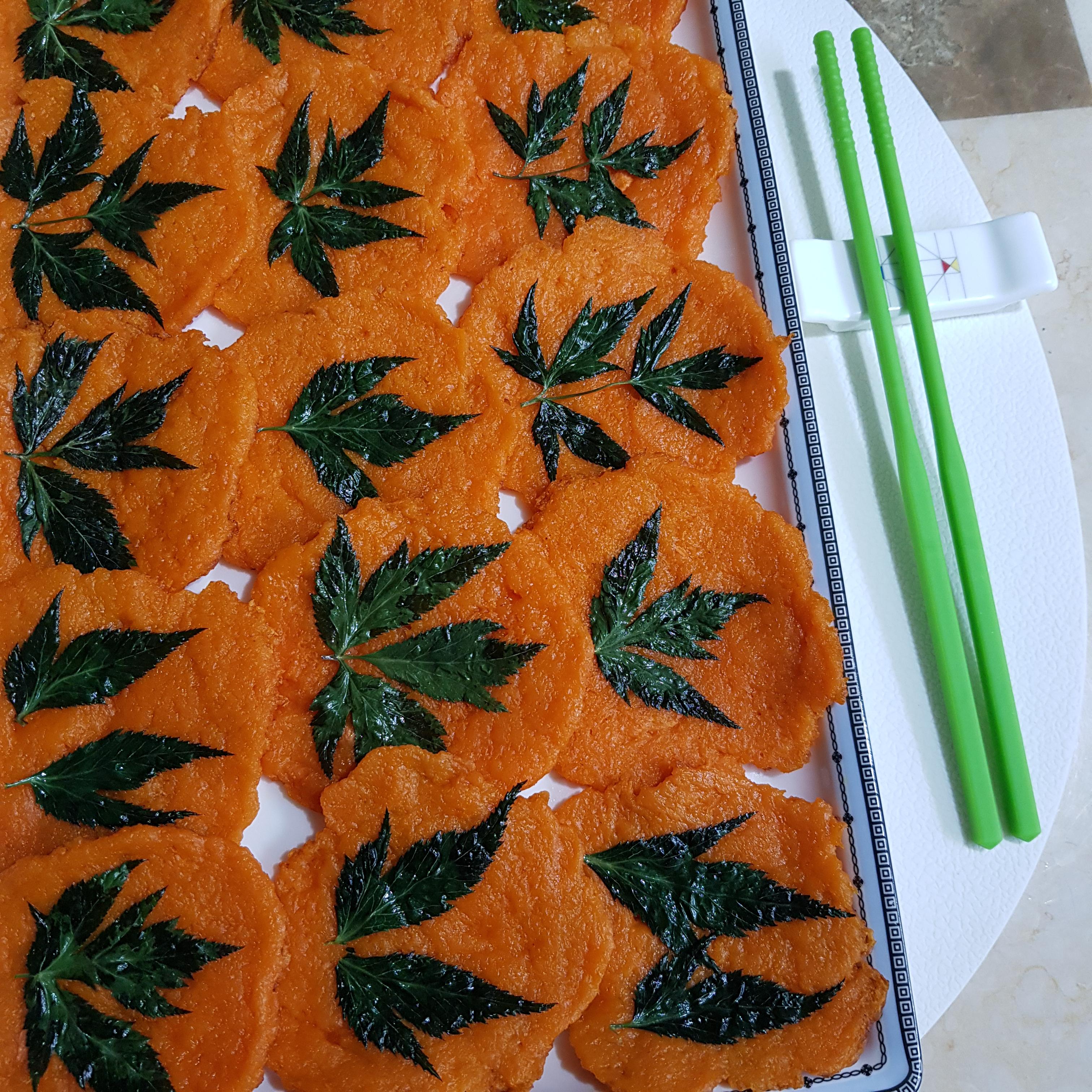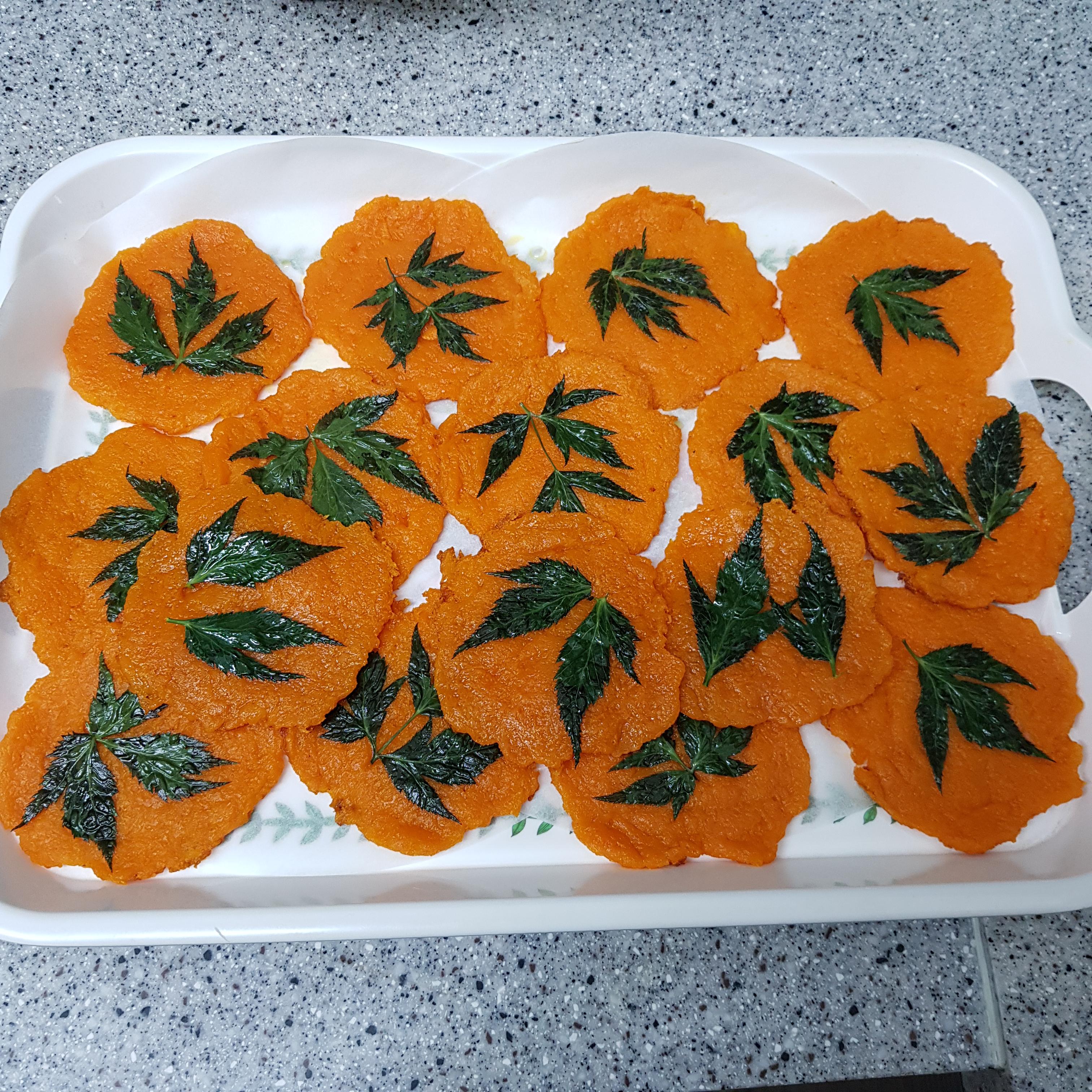 ▶ 뒤집어서 당귀잎 올린 부분은 살짝만 구워서 당귀잎의 색감을 살려주면 당근전 만드는 법 완성입니다