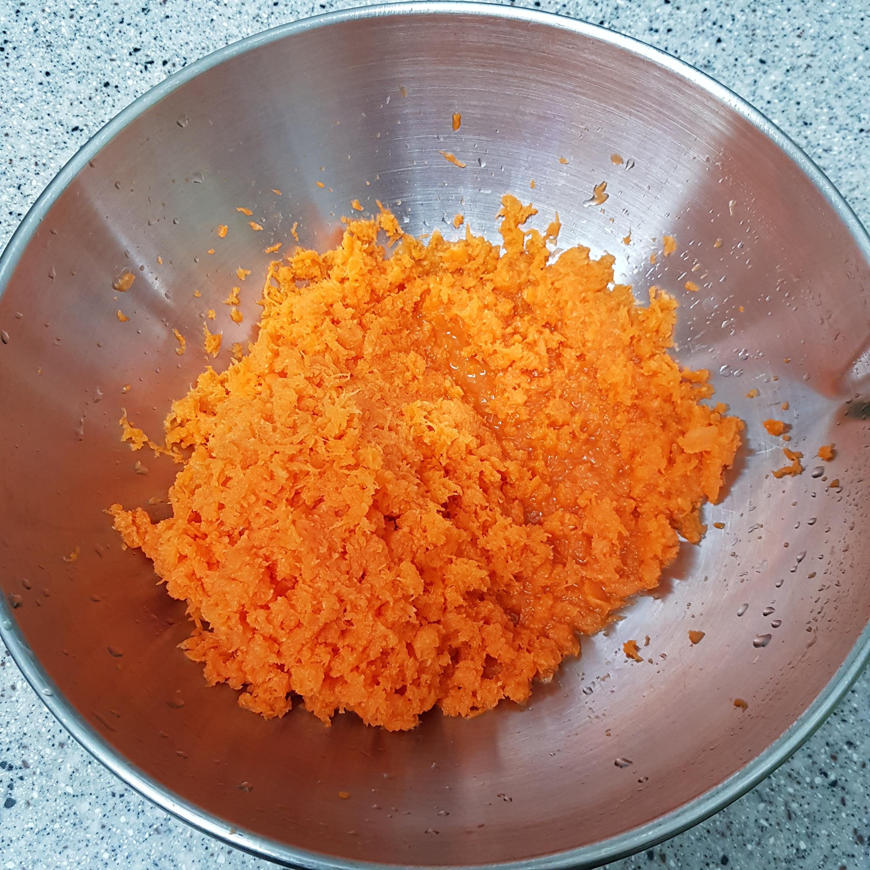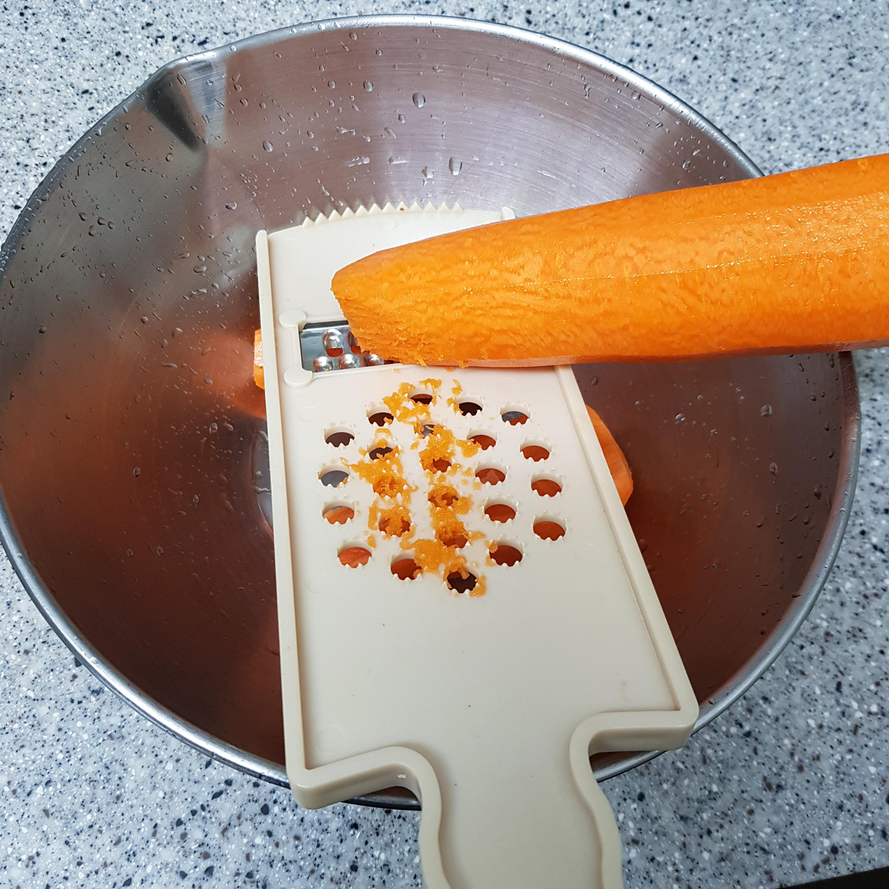 ▶ 껍질 벗긴 당근은 강판으로 갈아주고 꽃소금 반티스푼을 넣어 골고루 섞어주세요