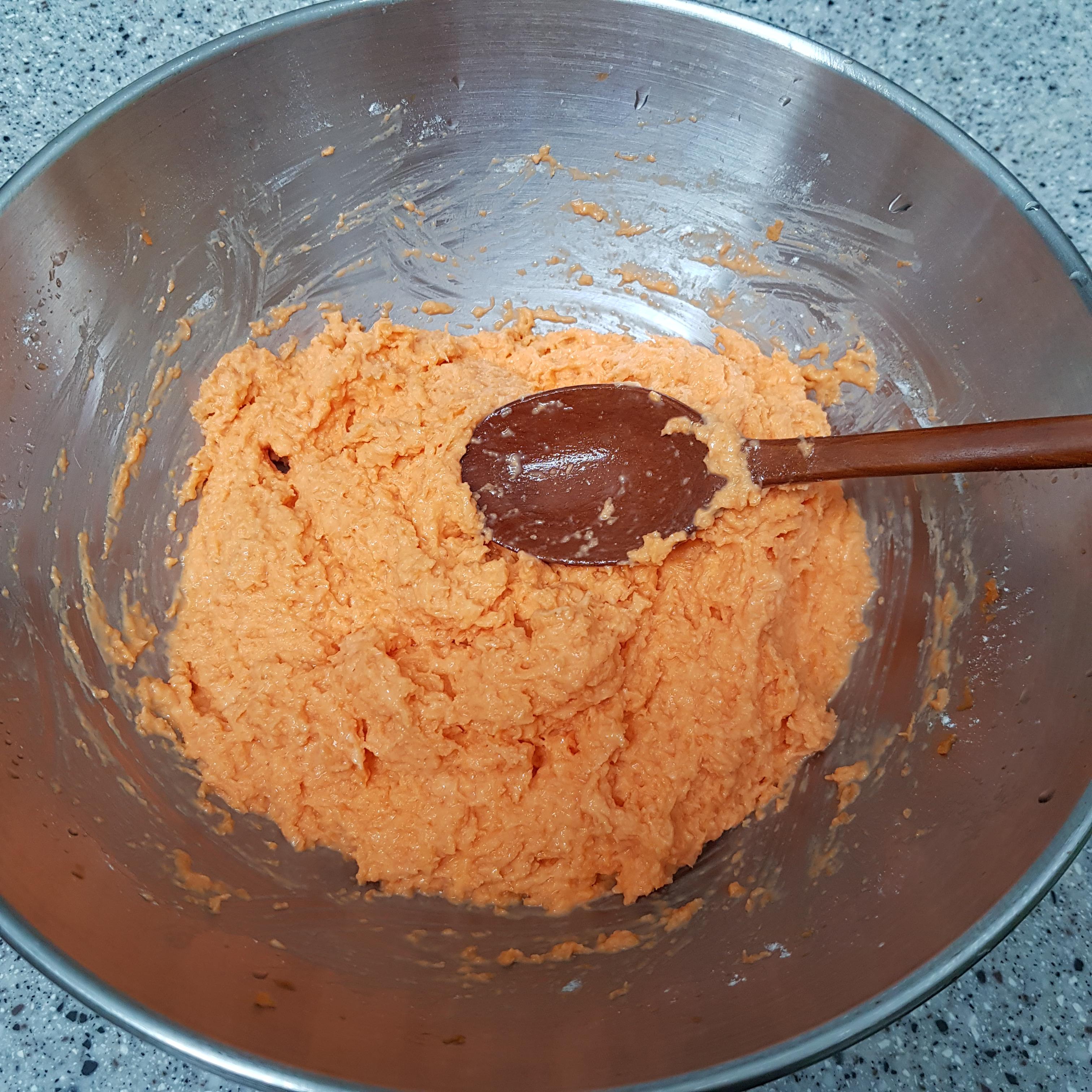 ▶ 꽃소금을 미리 섞어준 후 부침가루 반컵, 튀김가루 반컵을 넣어 골고루 섞어주세요 되직하게 반죽을 만들어주고 당근전은 별도로 물을 넣지 않아도 되니 참고해주세요