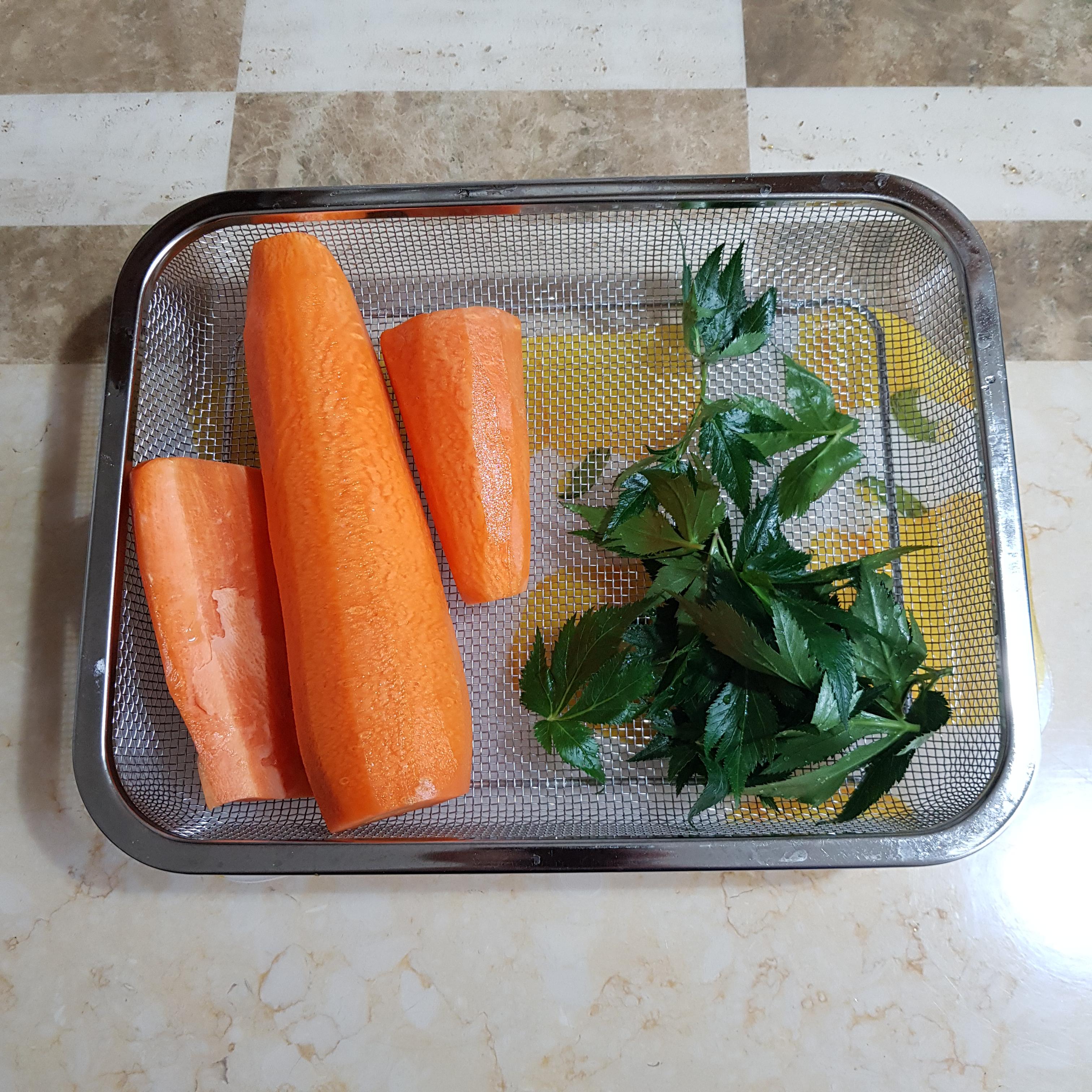 당근 500g, 당귀잎이나 쑥갓 조금(고명용), 부침가루 반컵, 튀김가루 반컵, 꽃소금 반티스푼, 식용유 약간
