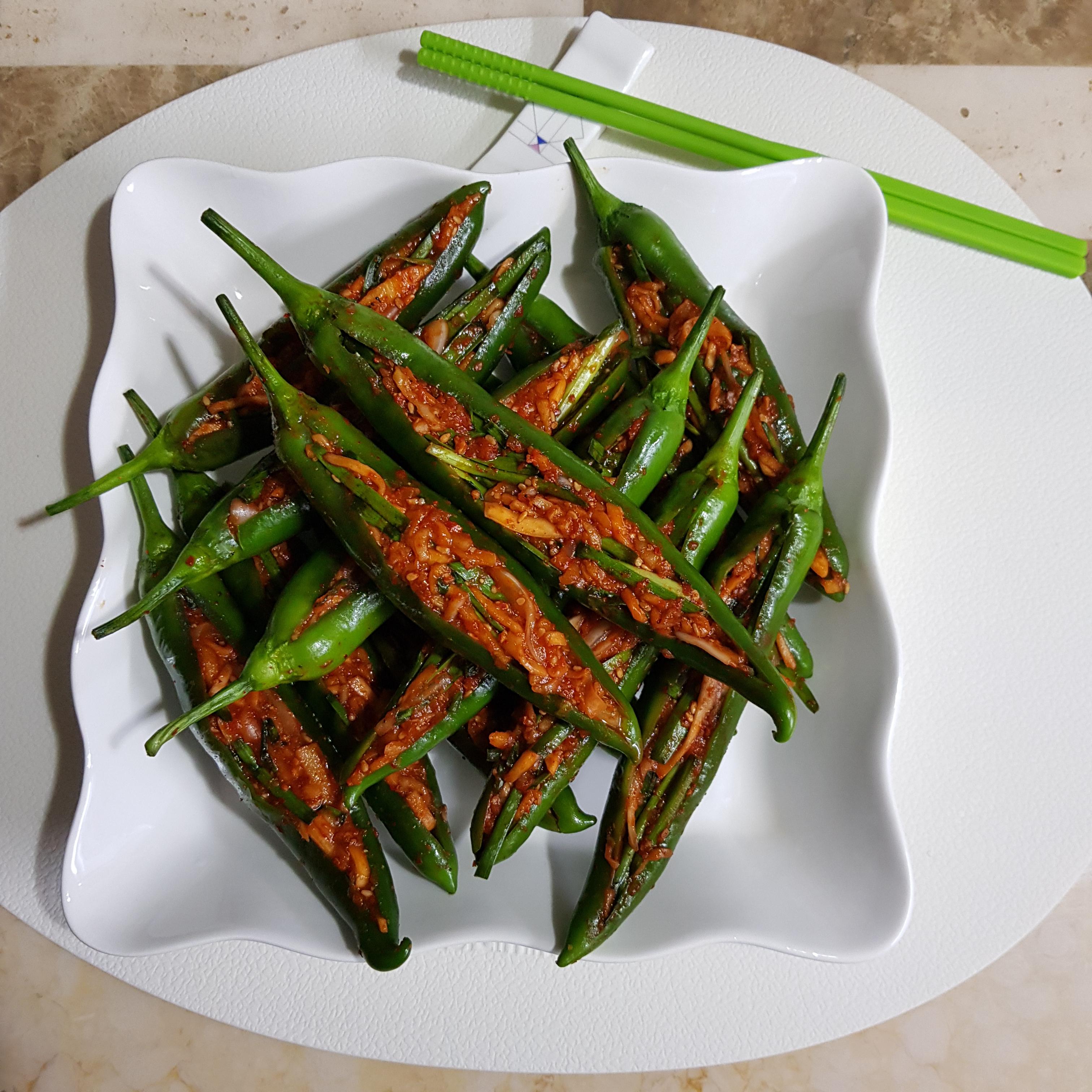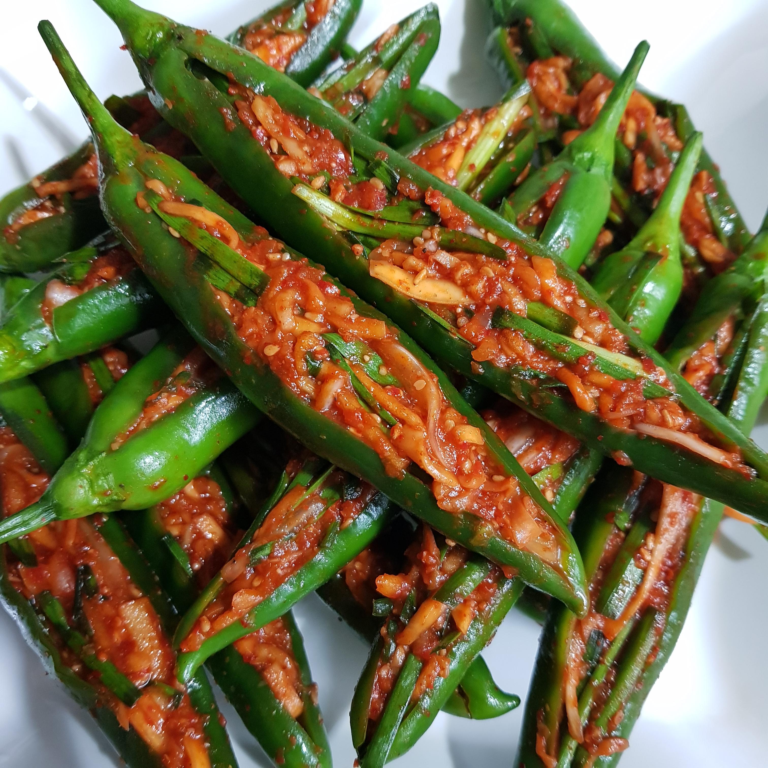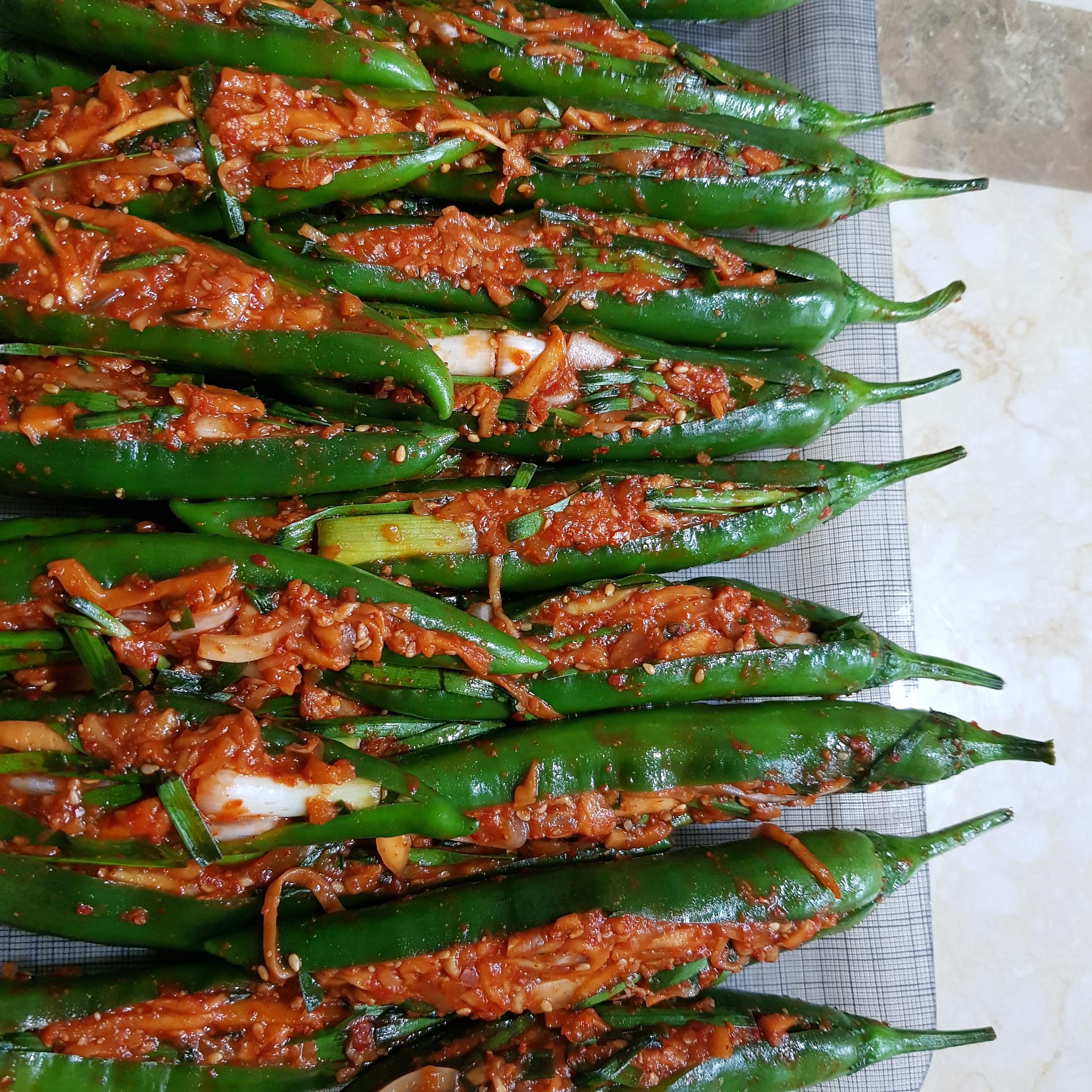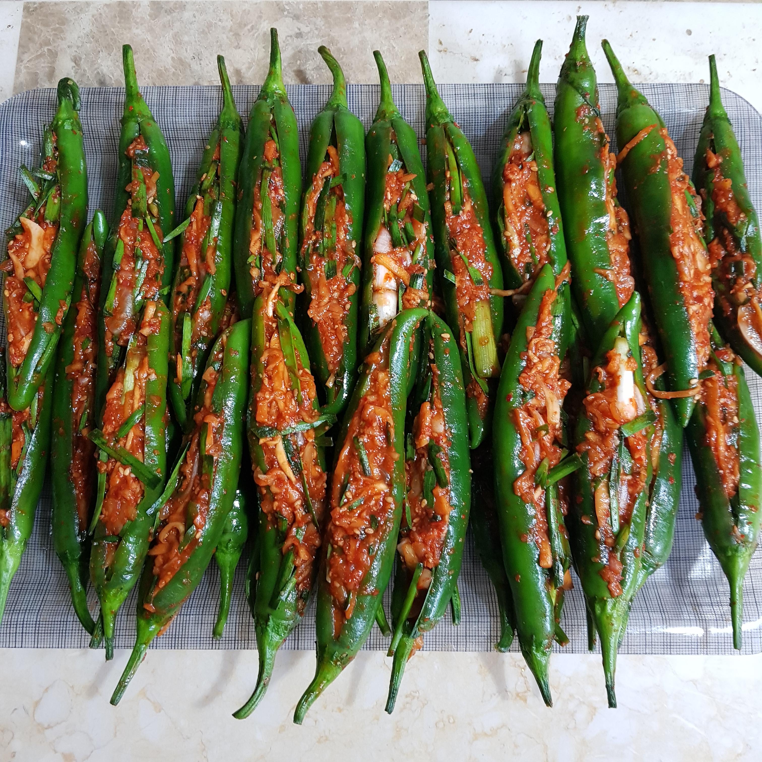 ▶ 김칫소가 튀어나오지 않게 평평하게 채워주고 오이고추를 눌러 오이고추 속 공기를 빼주세요 공기를 빼줘야 무르지 않고 오래 보관할 수 있답니다