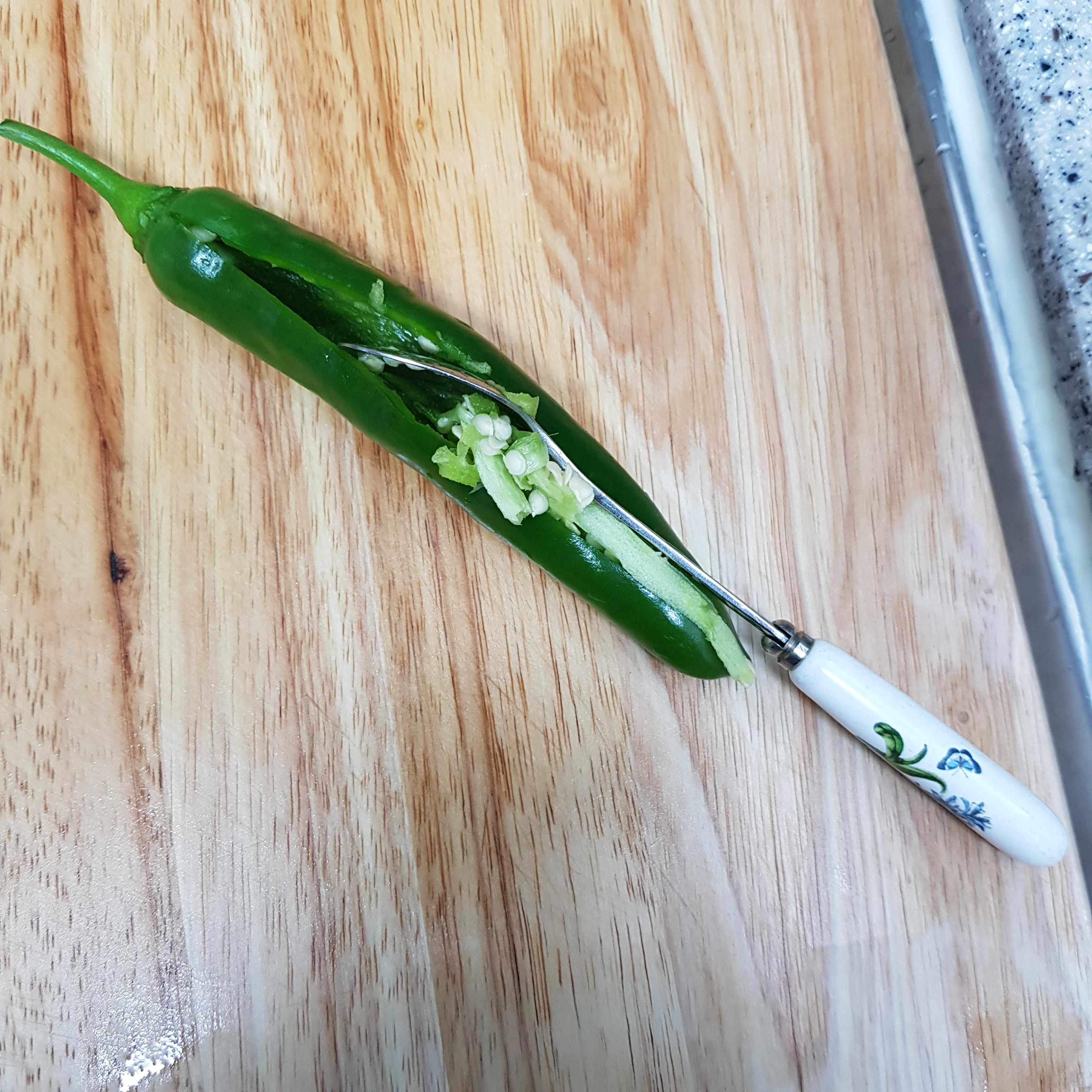 ▶ 숟가락 또는 티스푼을 사용해 오이 속 씨와 태좌를 제거해주세요 오이고추 씨와 태좌를 제거해야 깔끔하고 김칫소를 넣기 쉽답니다