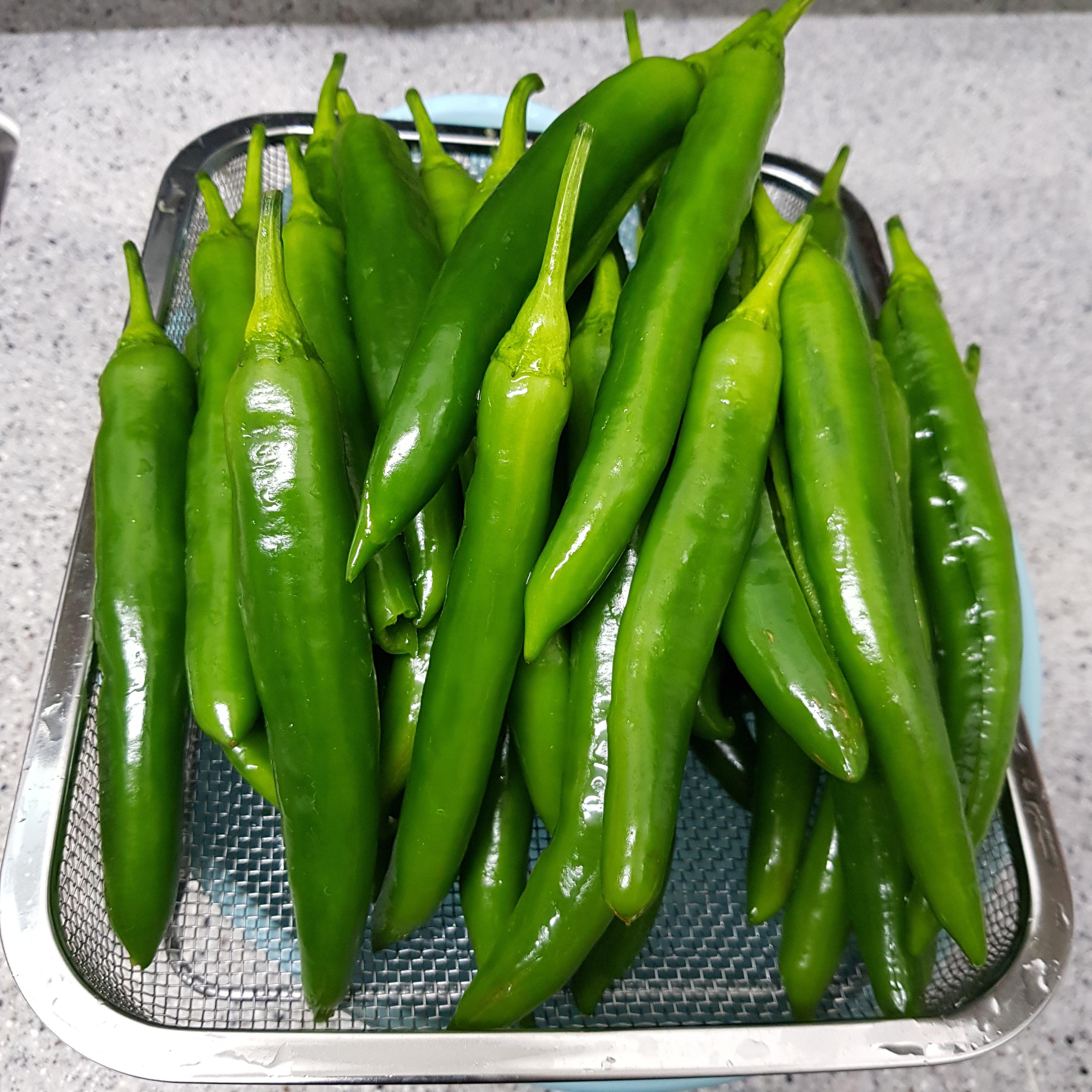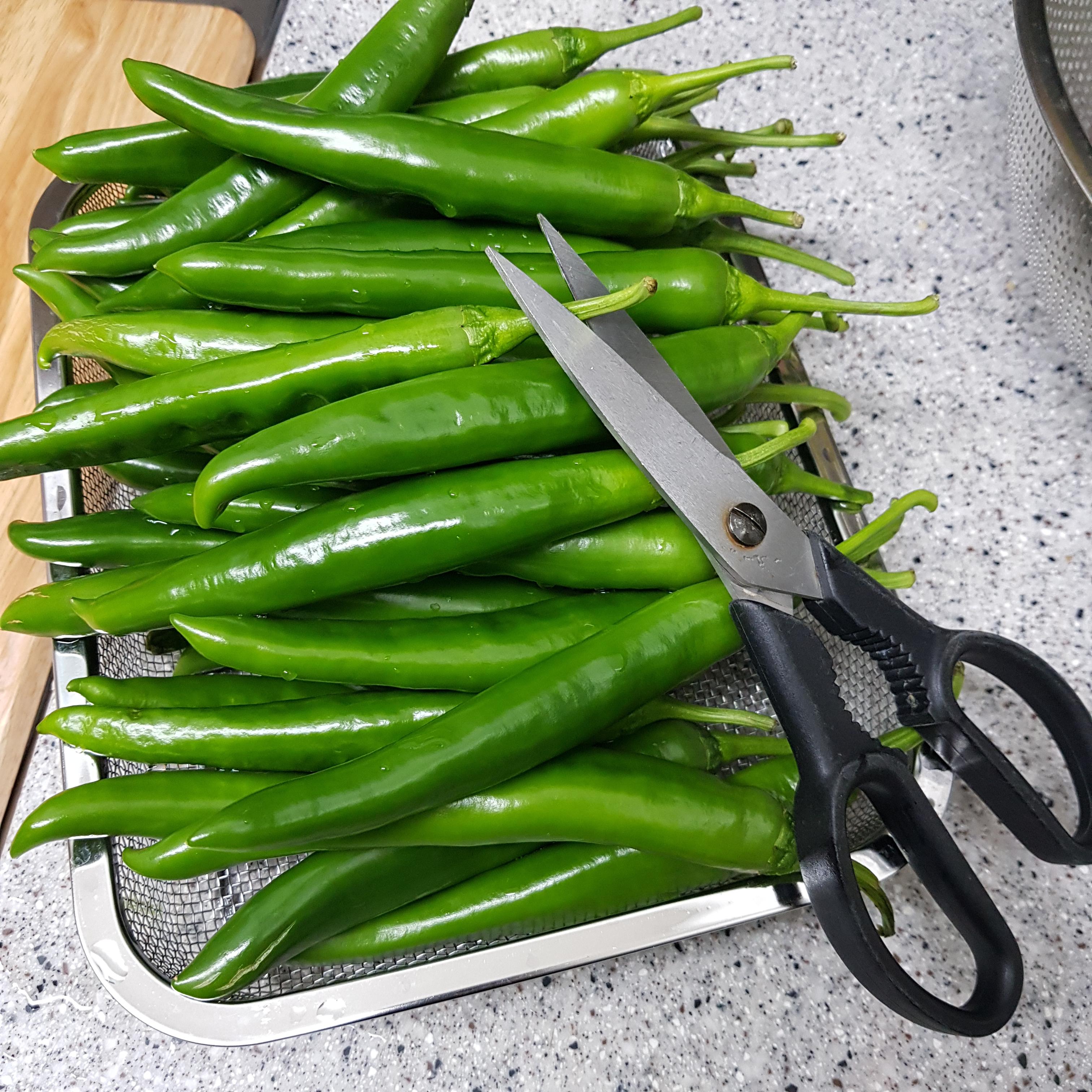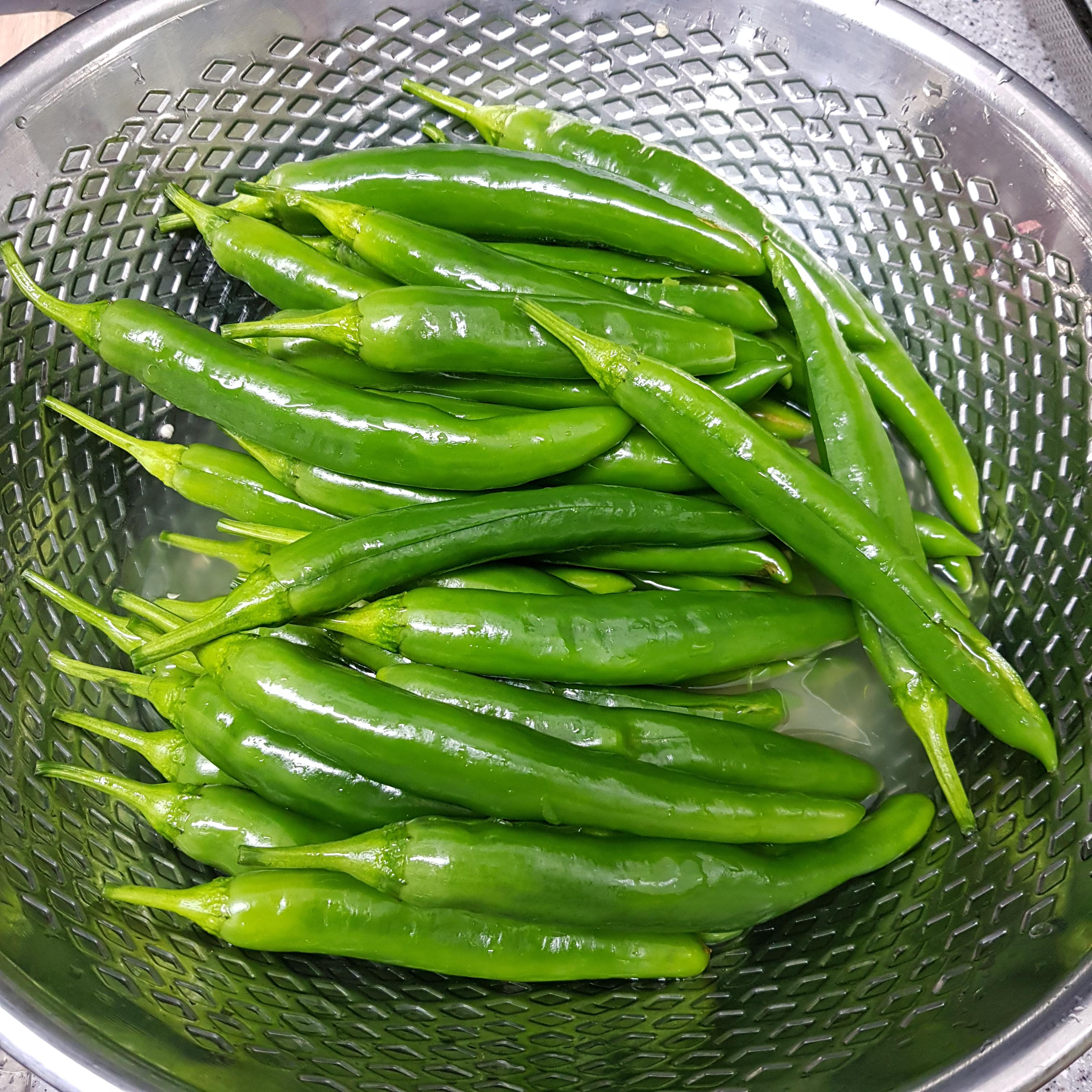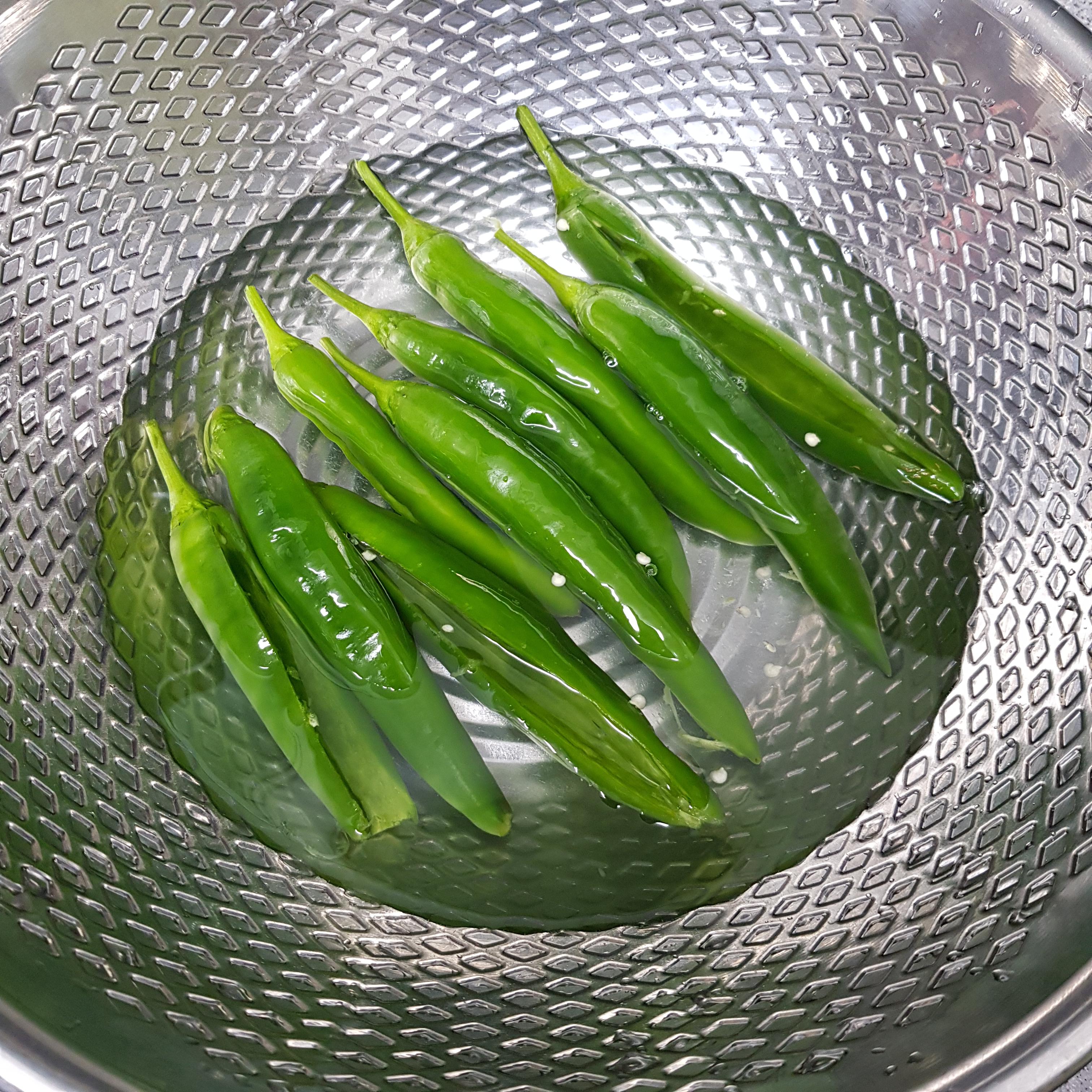 ▶ 풋고추보다 매운맛은 적고 아삭아삭한 오이고추 1kg을 깨끗이 씻은 후 고추 꼭지를 2cm 정도 남겨두고 잘라서 준비해주세요