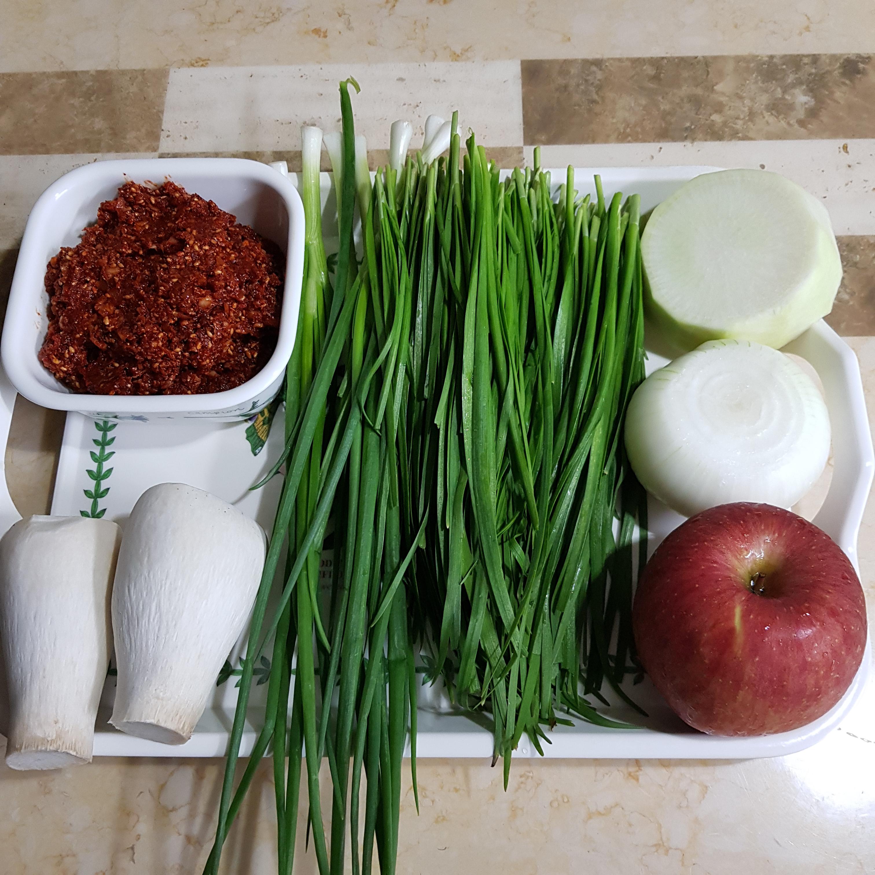 완성된 양념, 쪽파 50g, 부추 200g, 무 150g, 양파 1개, 사과 1개, 갓뗀 새송이버섯 2개