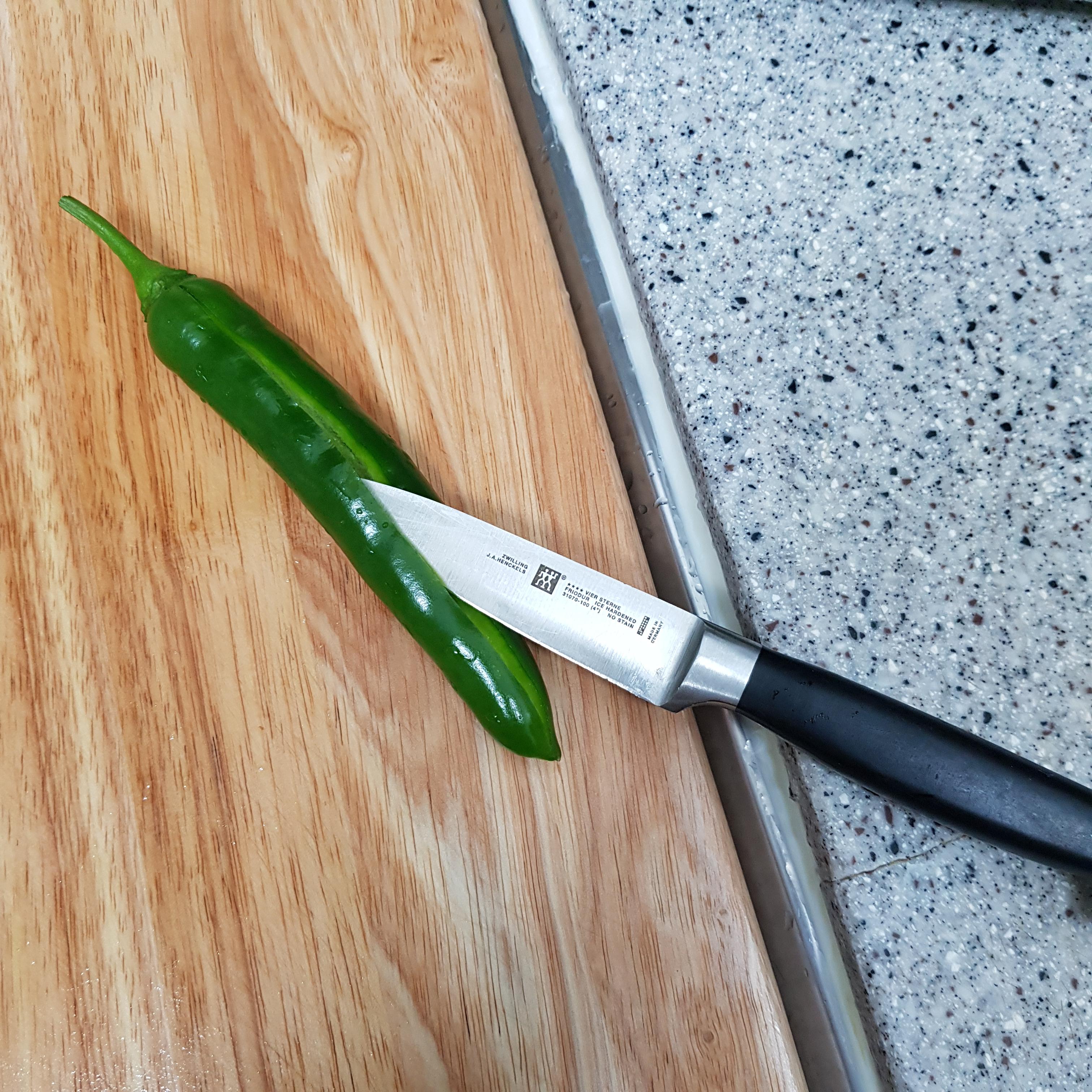 ▶ 오이고추 한쪽 면에만 끝까지 칼집을 넣어주세요 오이고추에 김칫소를 넣어 채워줄 거라 한쪽면에만 칼집을 넣어주시면 되고 끝까지 칼집을 넣어줘야 김칫소 채우기가 쉽답니다 참고해주세요