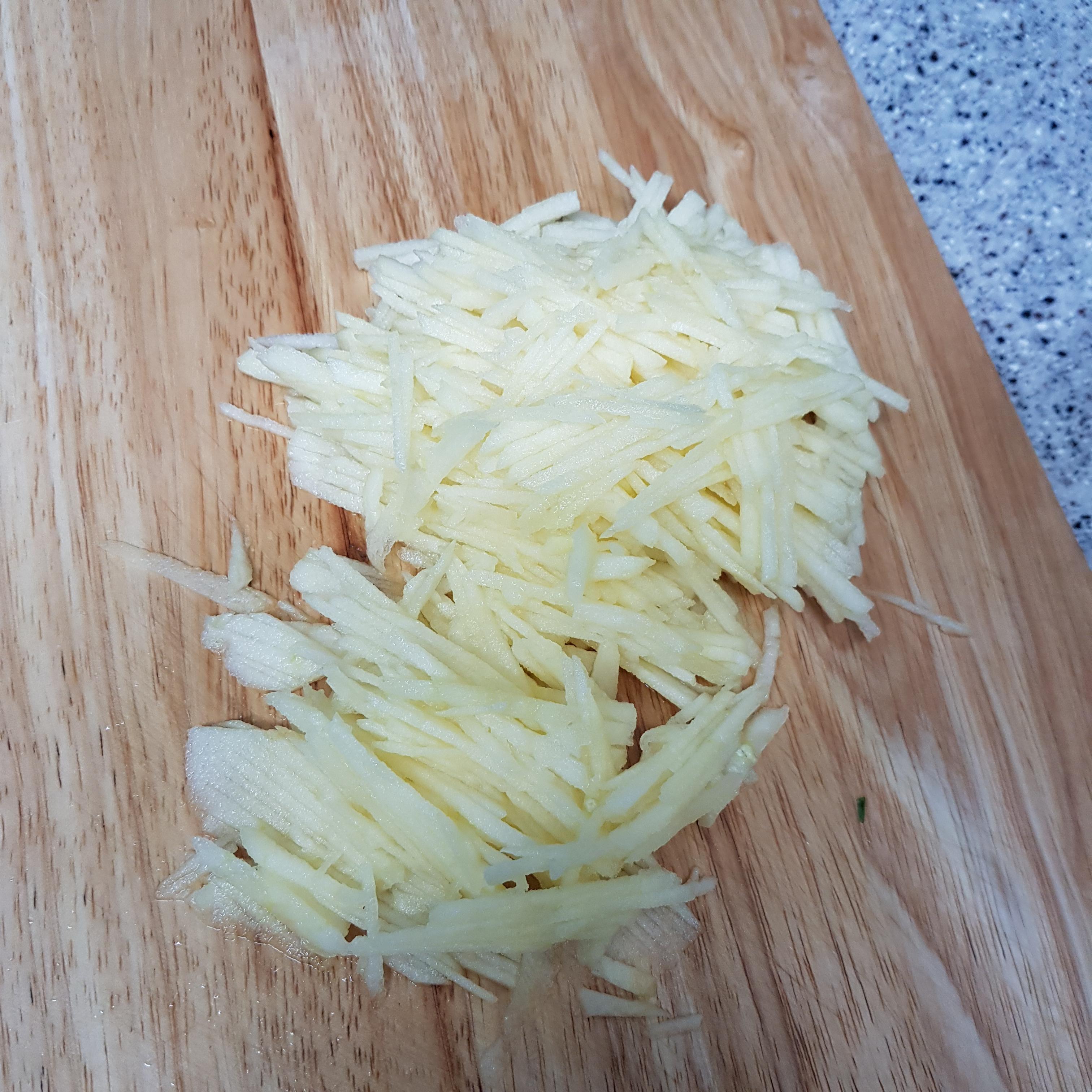 ▶ 사과 1개를 껍질과 씨를 제거한 후 가늘게 채 썰어 준비해주세요 김칫소에 사과를 넣으면 액젓의 잡내를 없애주며 사과 하나만으로도 김칫소 풍미가 급상승하니 알토란 오이고추소박이 김칫소 재료로 사과는 필수로 넣어주셔야 한답니다