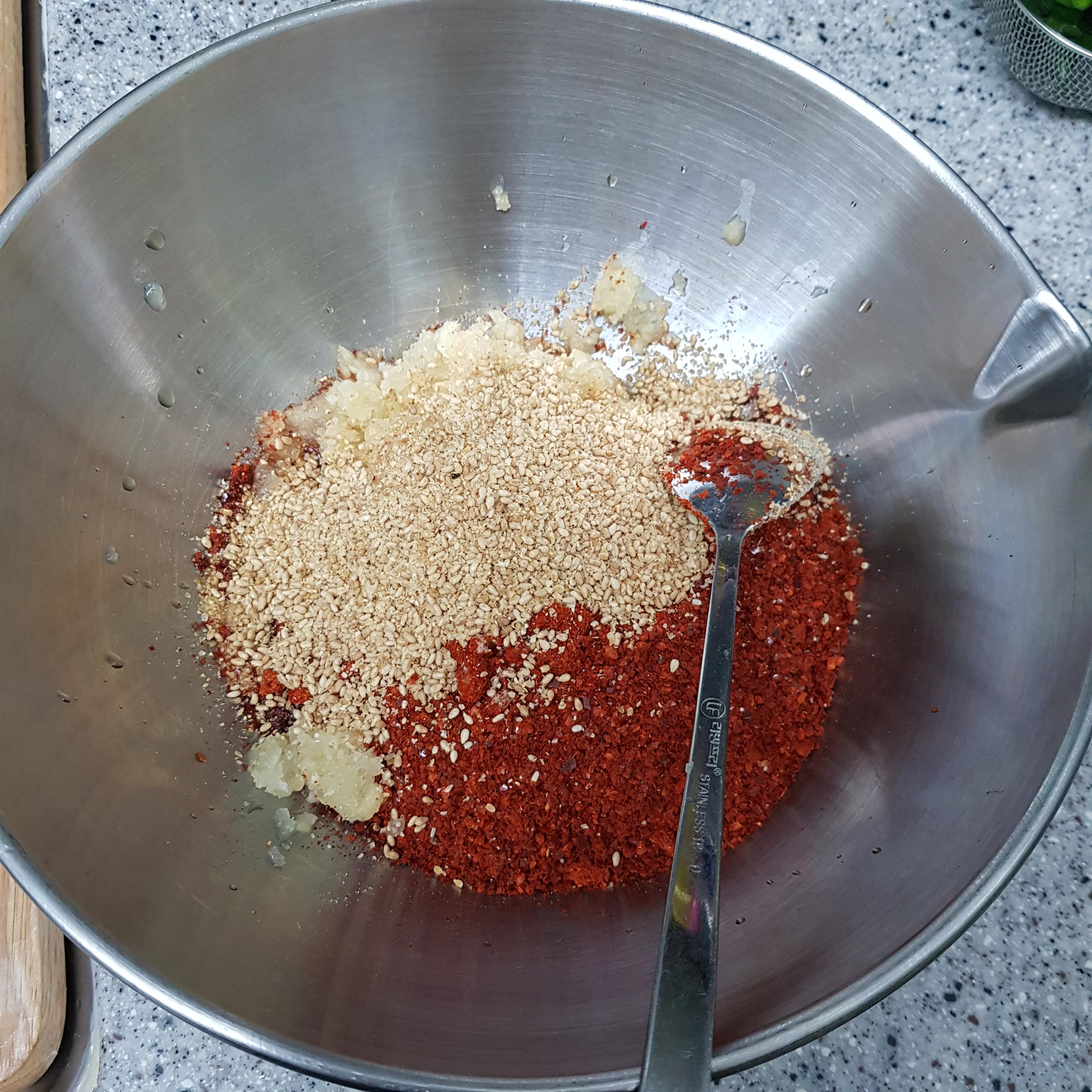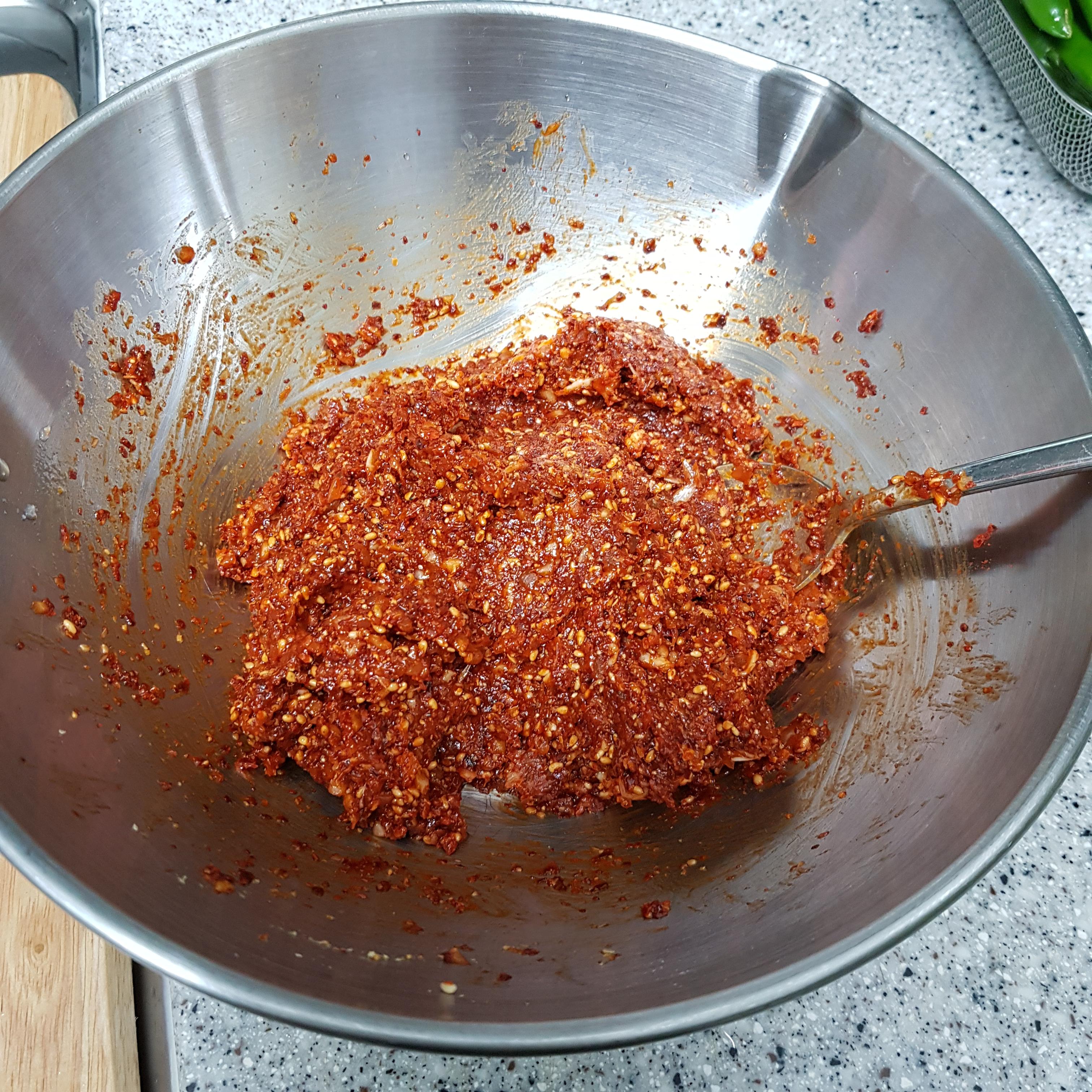 멸치액젓 3큰술, 새우젓 3큰술, 고춧가루 10큰술, 다진 생강 1큰술 또는 생강분말 2티스푼, 매실액 6큰술, 다진마늘 4큰술, 깨소금 4큰술