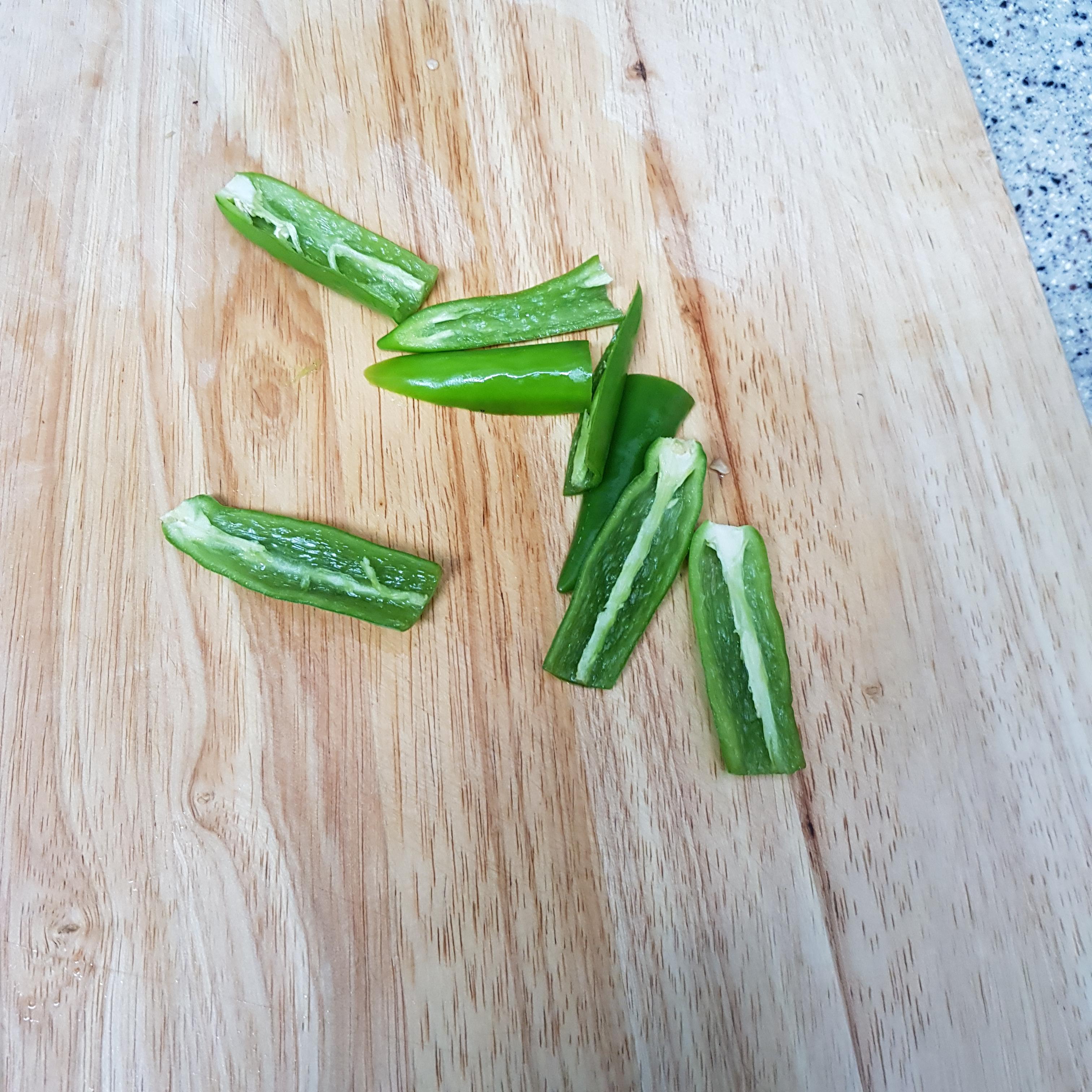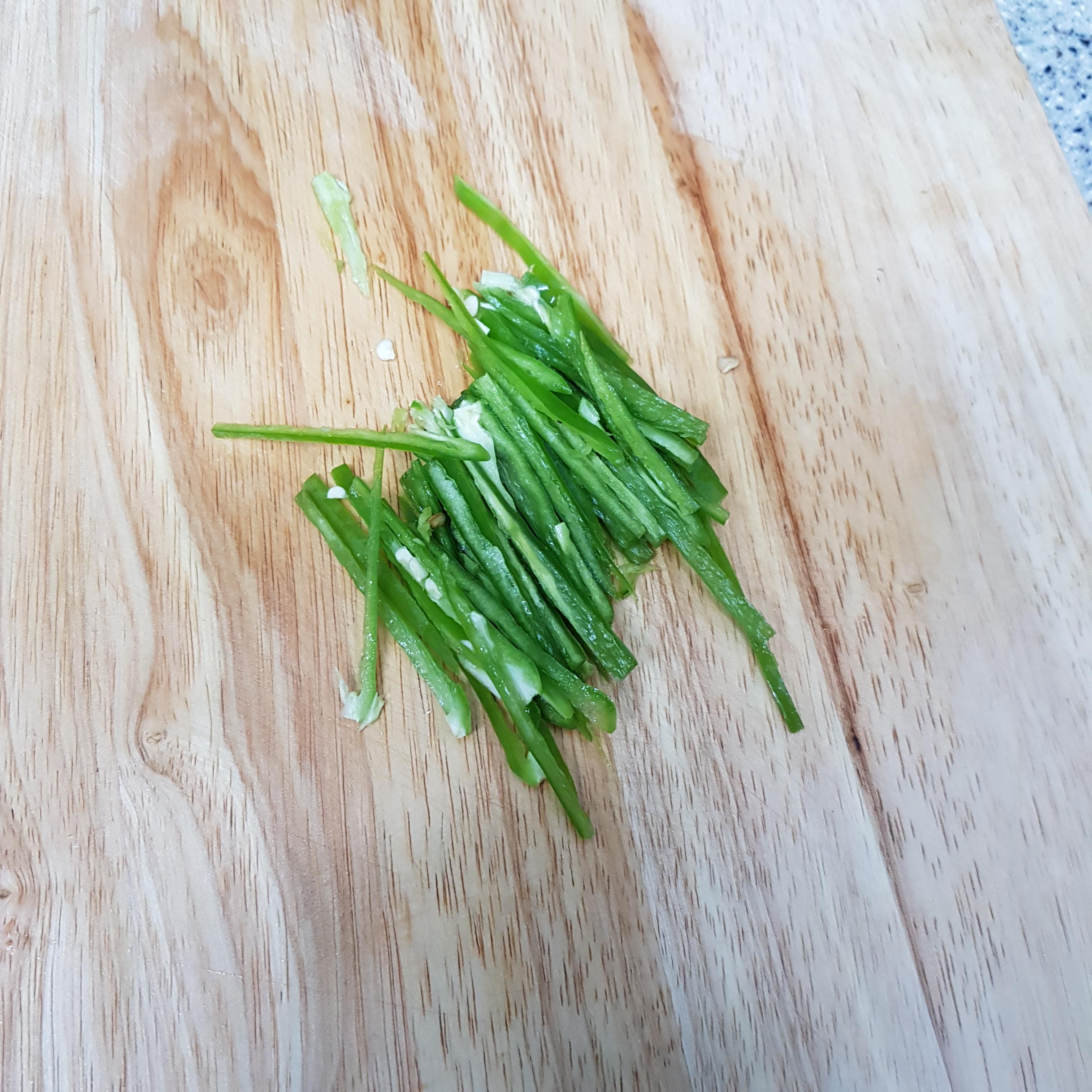 ▶ 저는 매운걸 좋아해 청양고추 2개를 씨 제거 후 가늘게 채 썰어 준비했어요 매운 걸 싫어하시면 색감을 위해 청 피망을 준비해 넣어주시면 된답니다