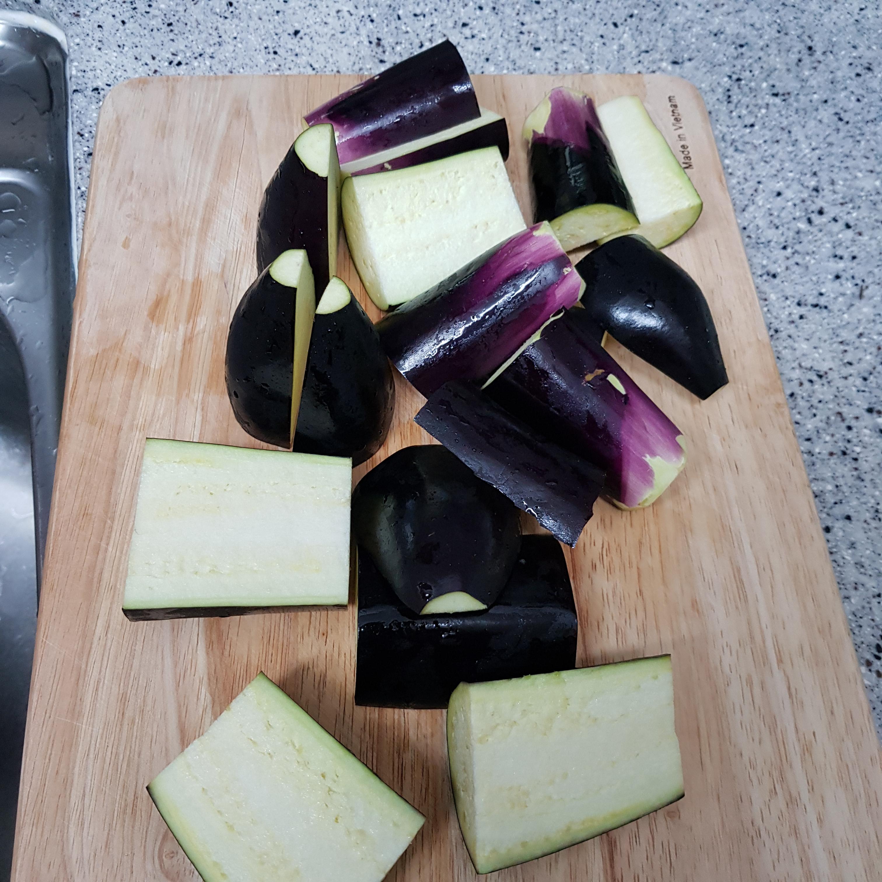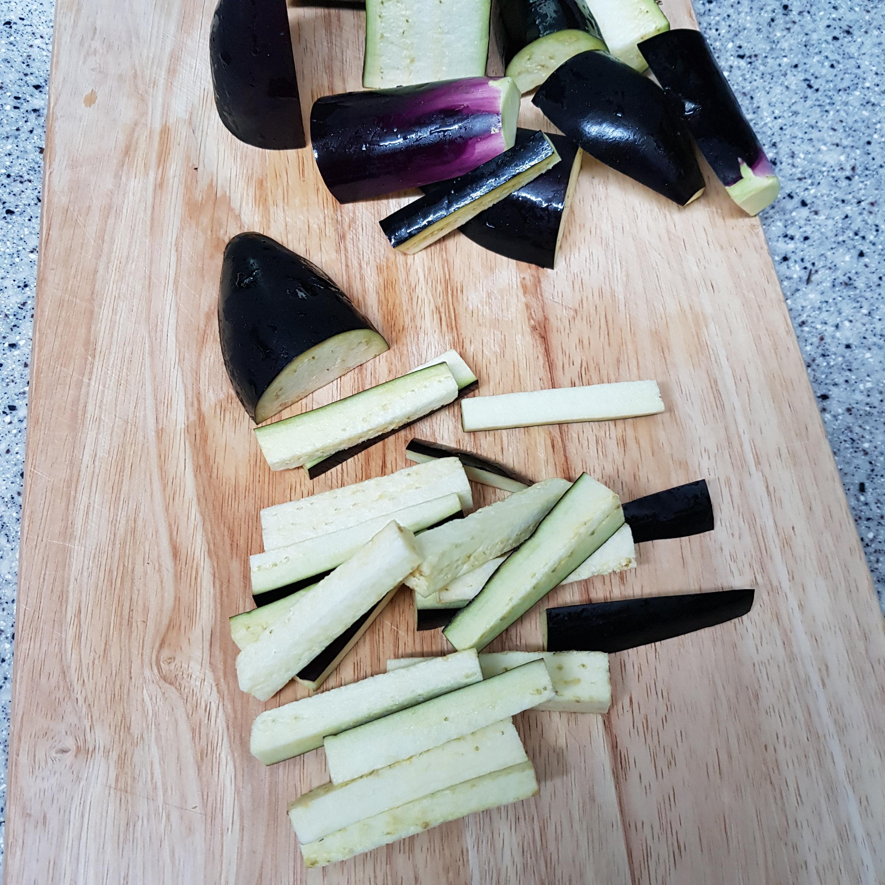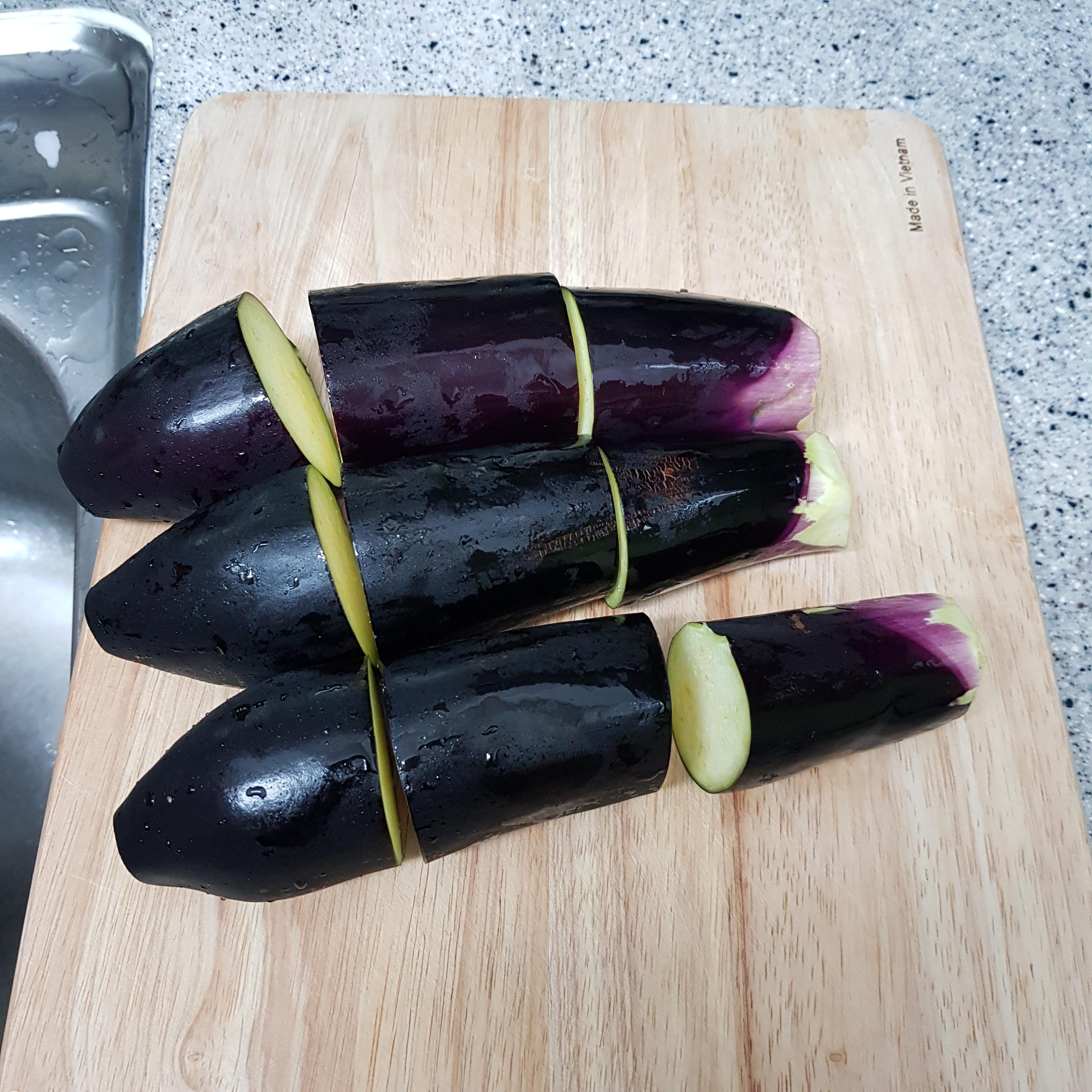 ▶ 가지는 0.5cm 정도 두께로 썰어주세요 가지를 너무 얇게 썰 경우 식감이 부족하고 또 너무 두껍게 썰 경우 국물이 흥건하니 0.5cm 정도 두께로 해주시는 게 좋아요