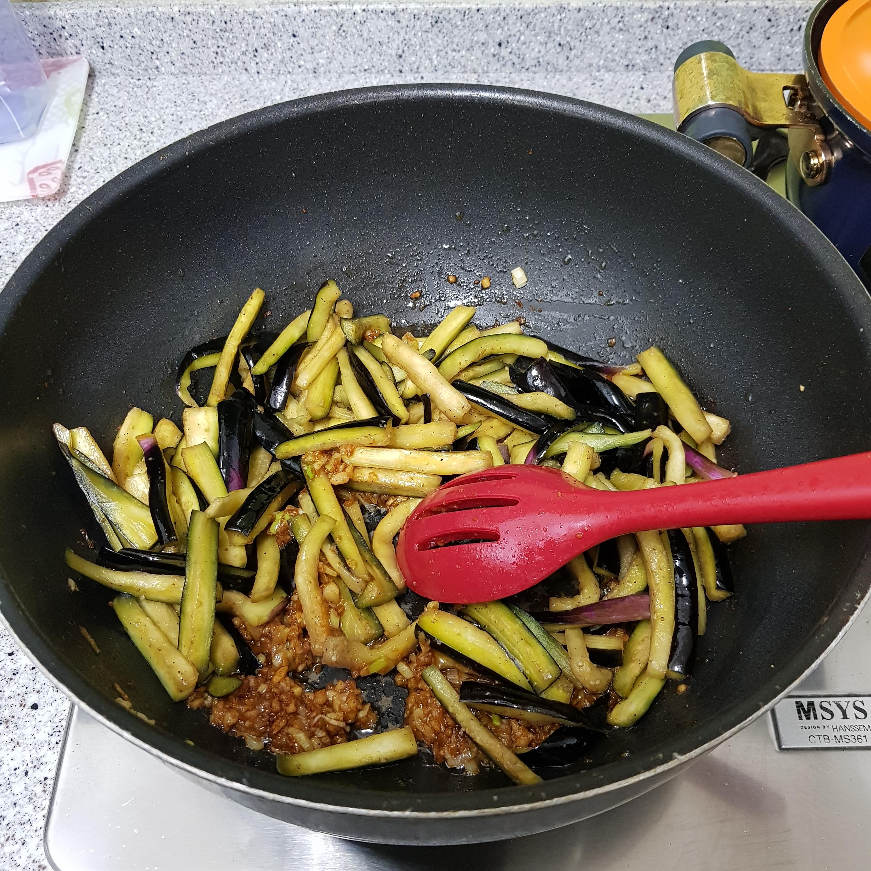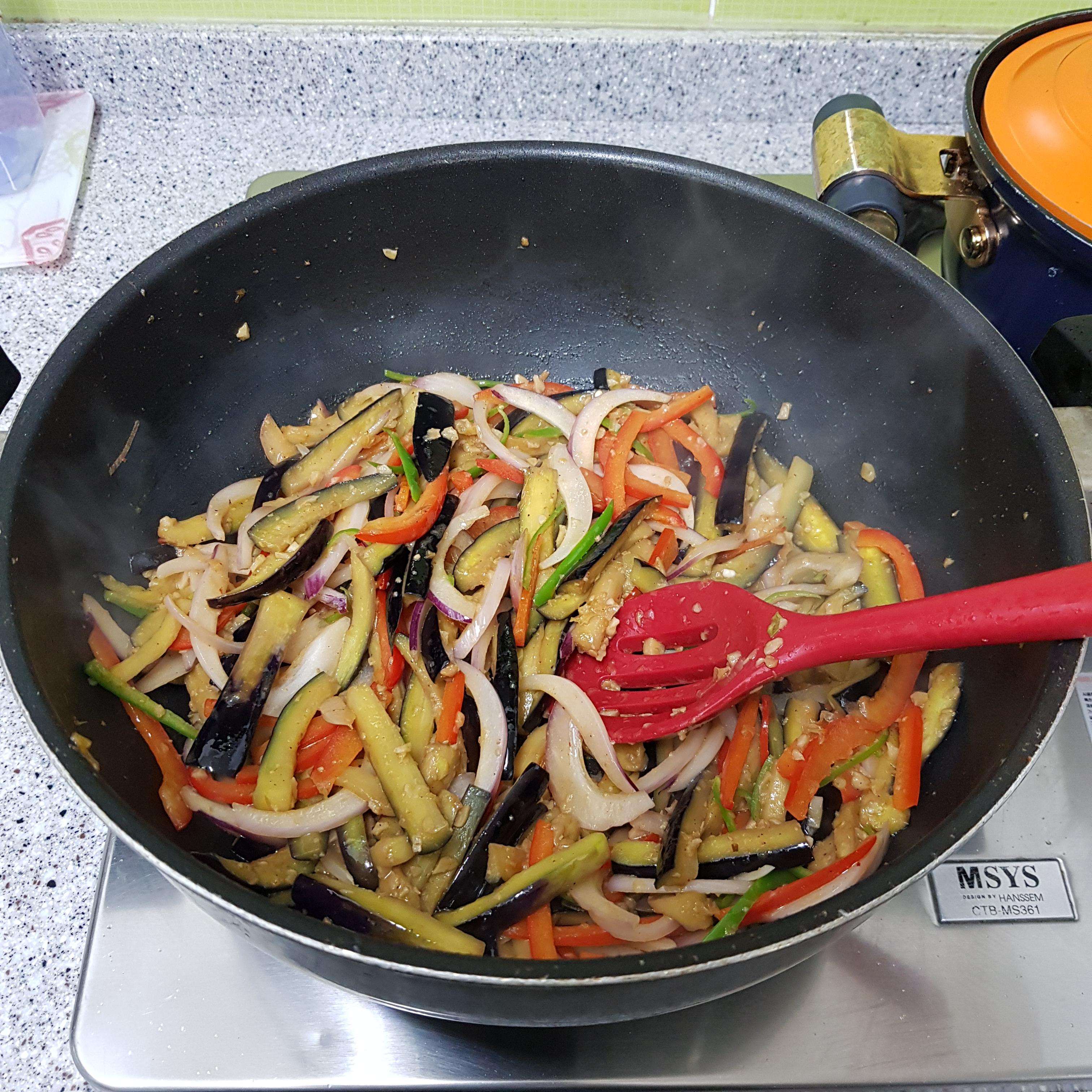 ▶ 중불에서 된장을 볶은 후 밑간한 가지를 넣고 센 불에서 2분 정도 볶아주세요