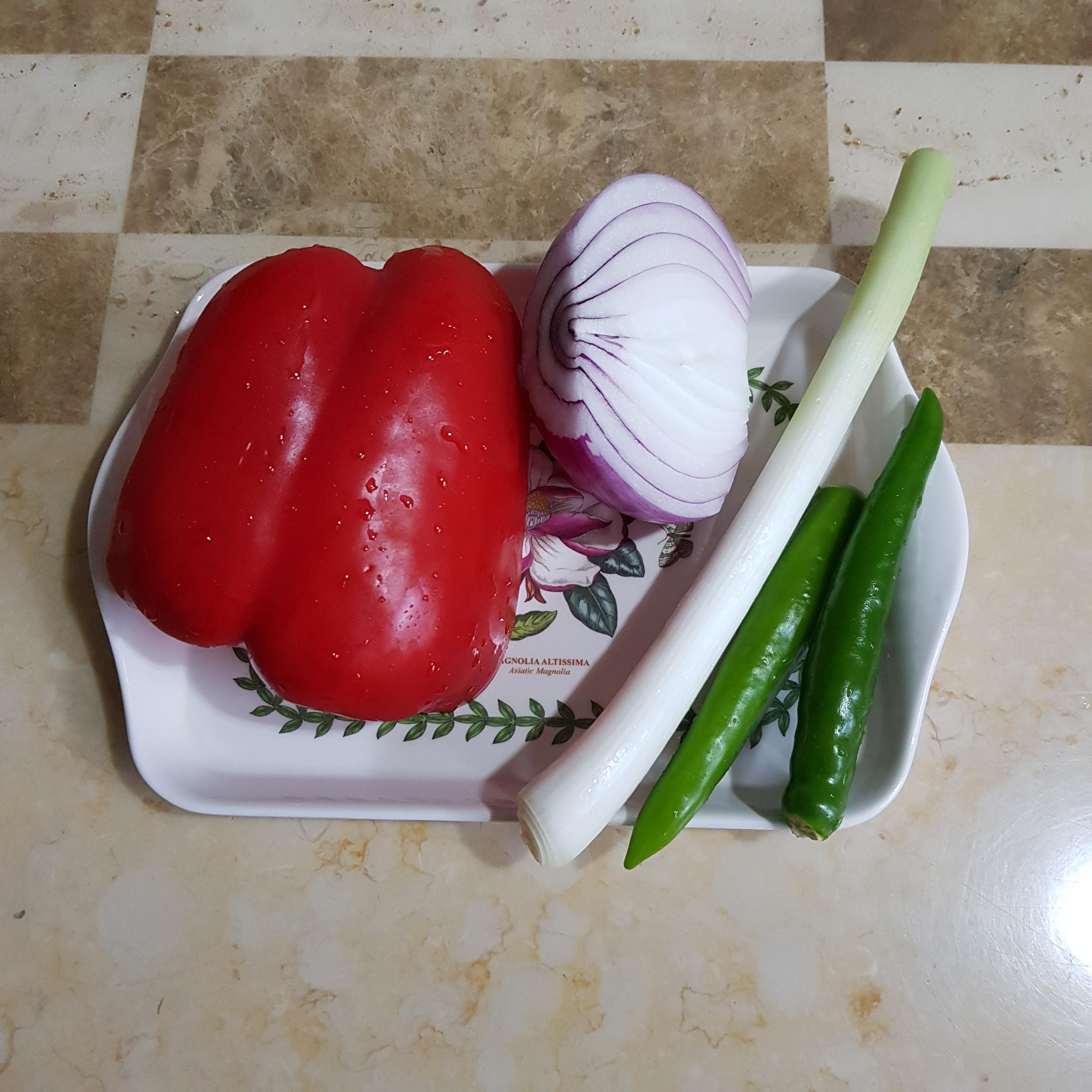 가지 3개, 꽃소금 반큰술(가지 절임용), 빨강 파프리카 반개, 양파 반개, 대파 흰 부분 반개, 청양고추 2개, 진간장 반큰술+후춧가루 2꼬집(가지 밑간용)