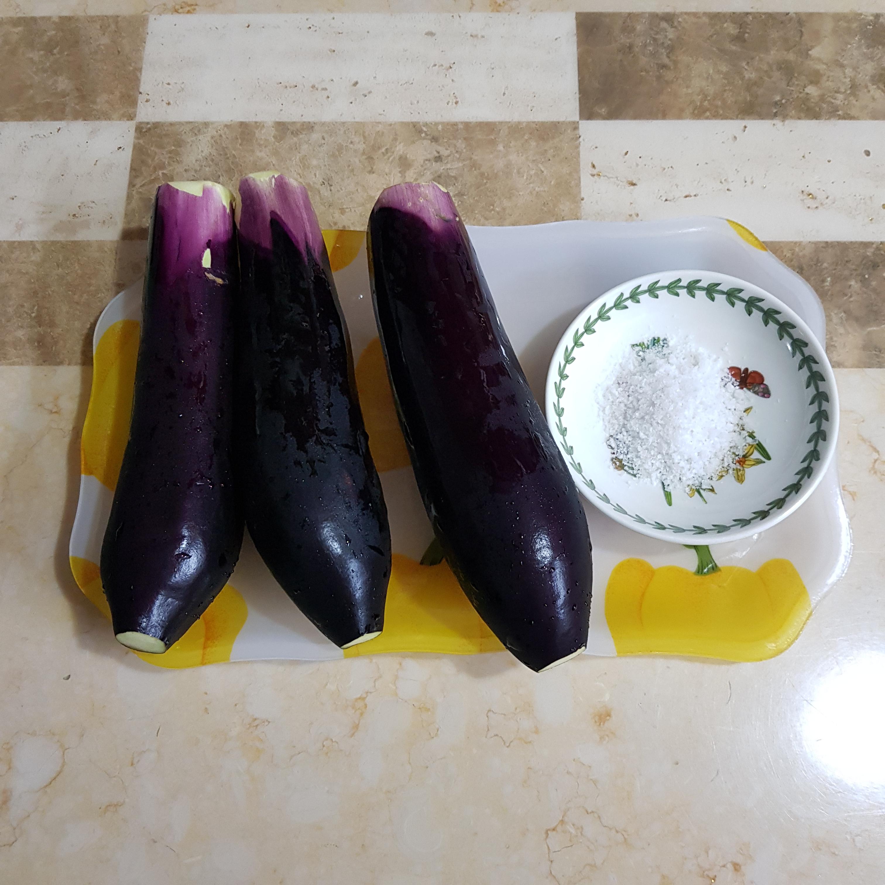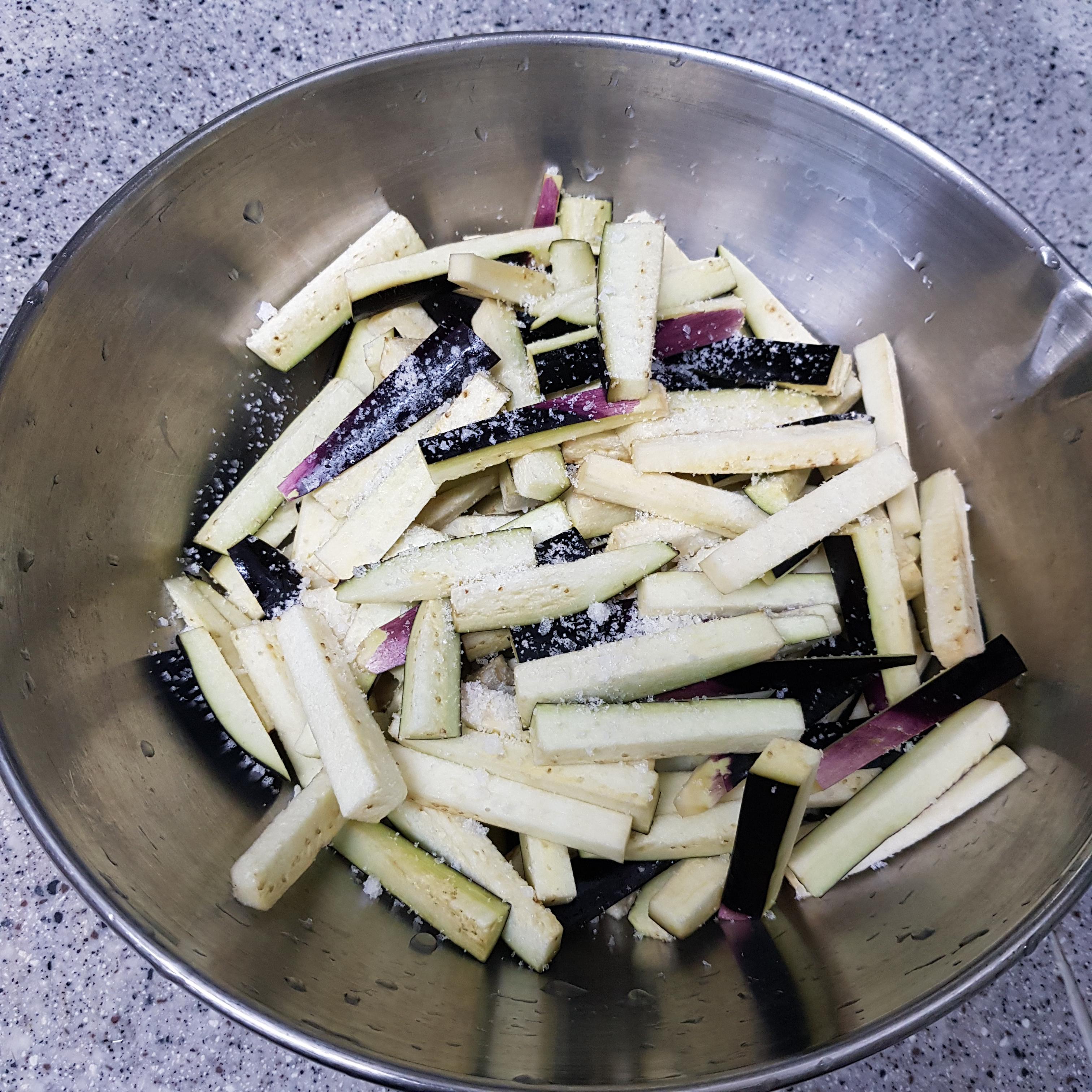 ▶ 0.5cm 정도 두께로 자른 가지는 볼에다 넣고 소금 반큰술을 넣어 10분간 절여주세요 가지를 절여주면 가지의 수분이 빠져나가 식감도 좋고 특유의 아린 맛도 사라지고 보관기간도 늘어나 가지의 단점을 보완해줄 수 있답니다