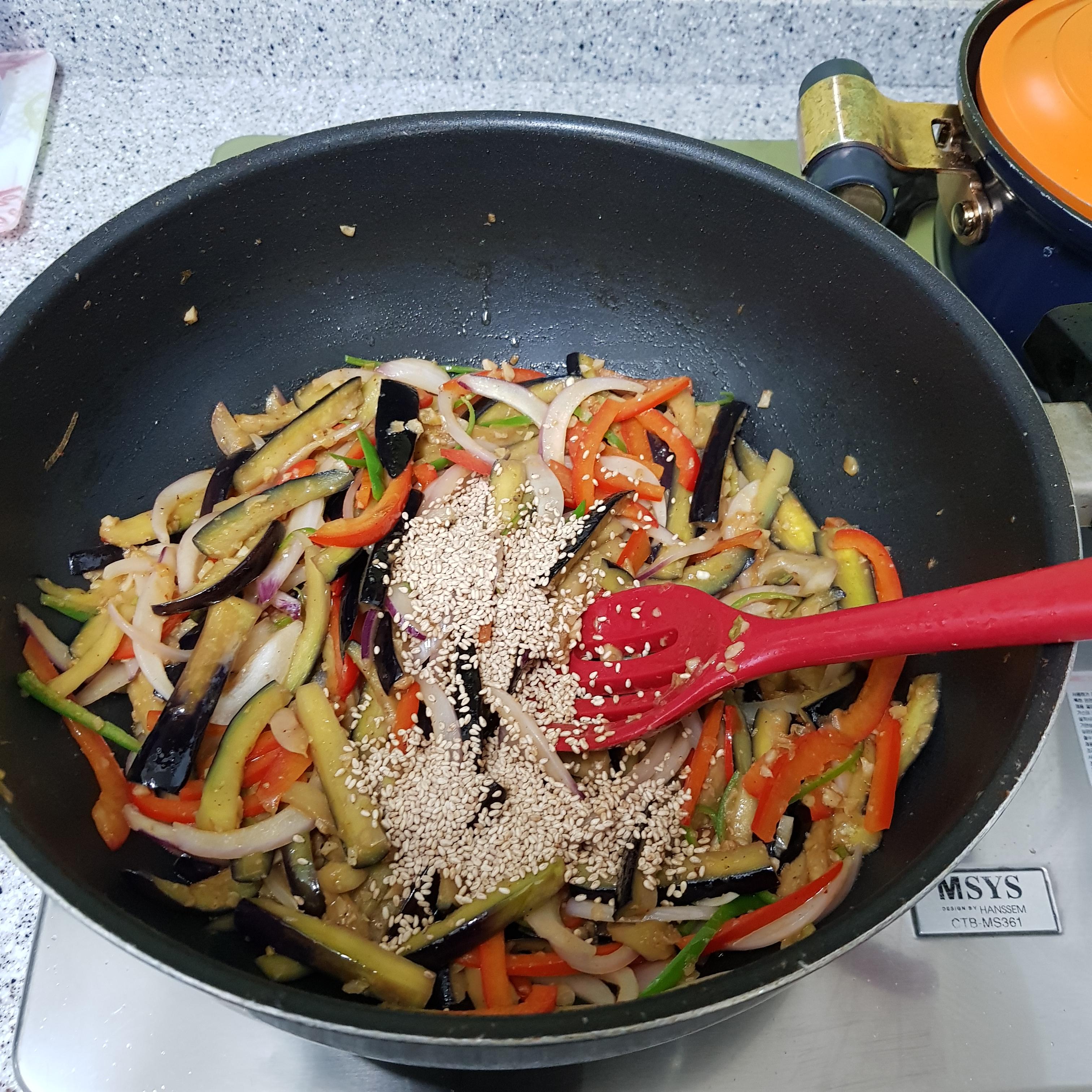 ▶ 불을 끄고 참기름 1큰술, 통깨 2큰술 넣어주면 가지의 물컹한 식감을 싫어하셨던 분들도 잘 드실 수 있는 알토란 가지볶음 완성입니다