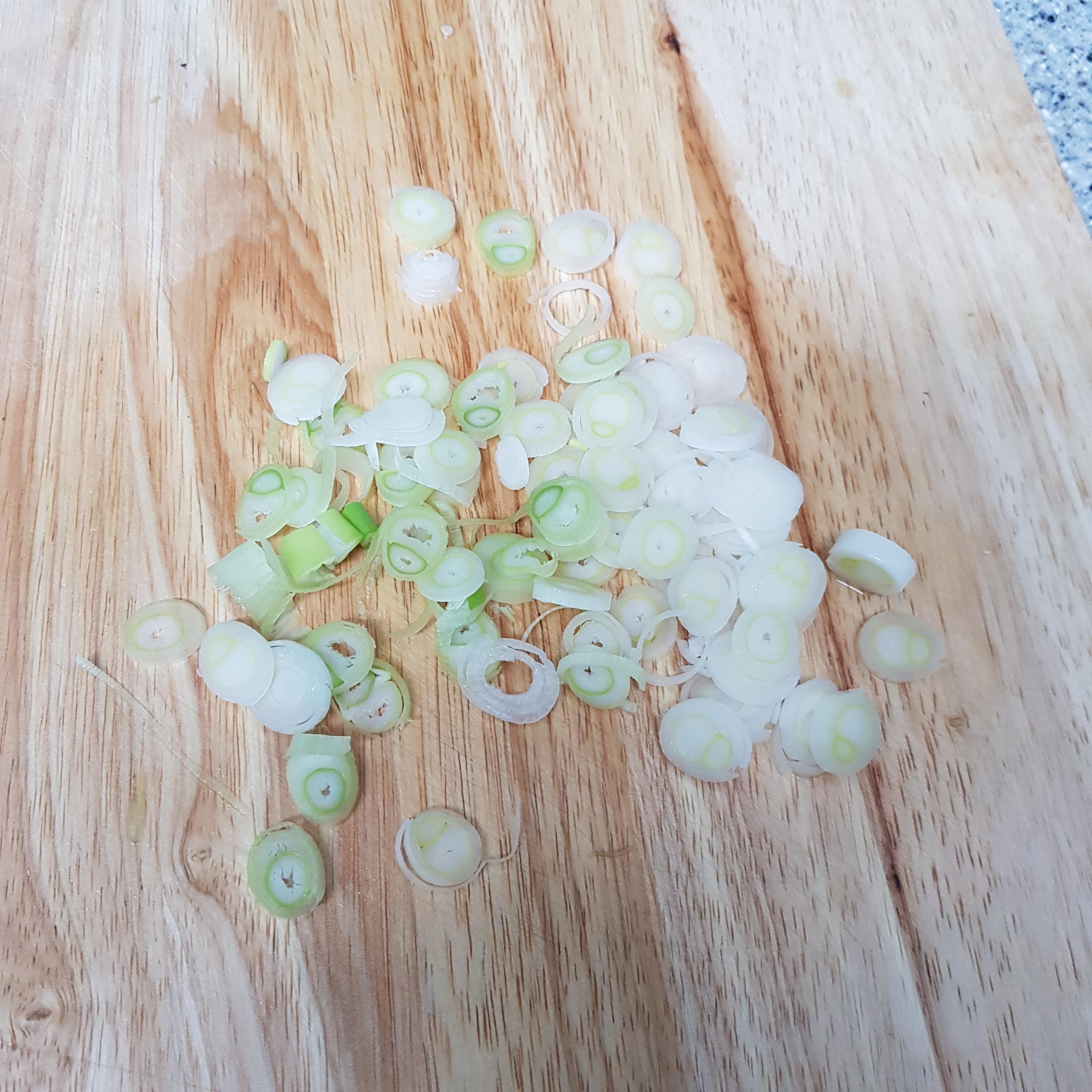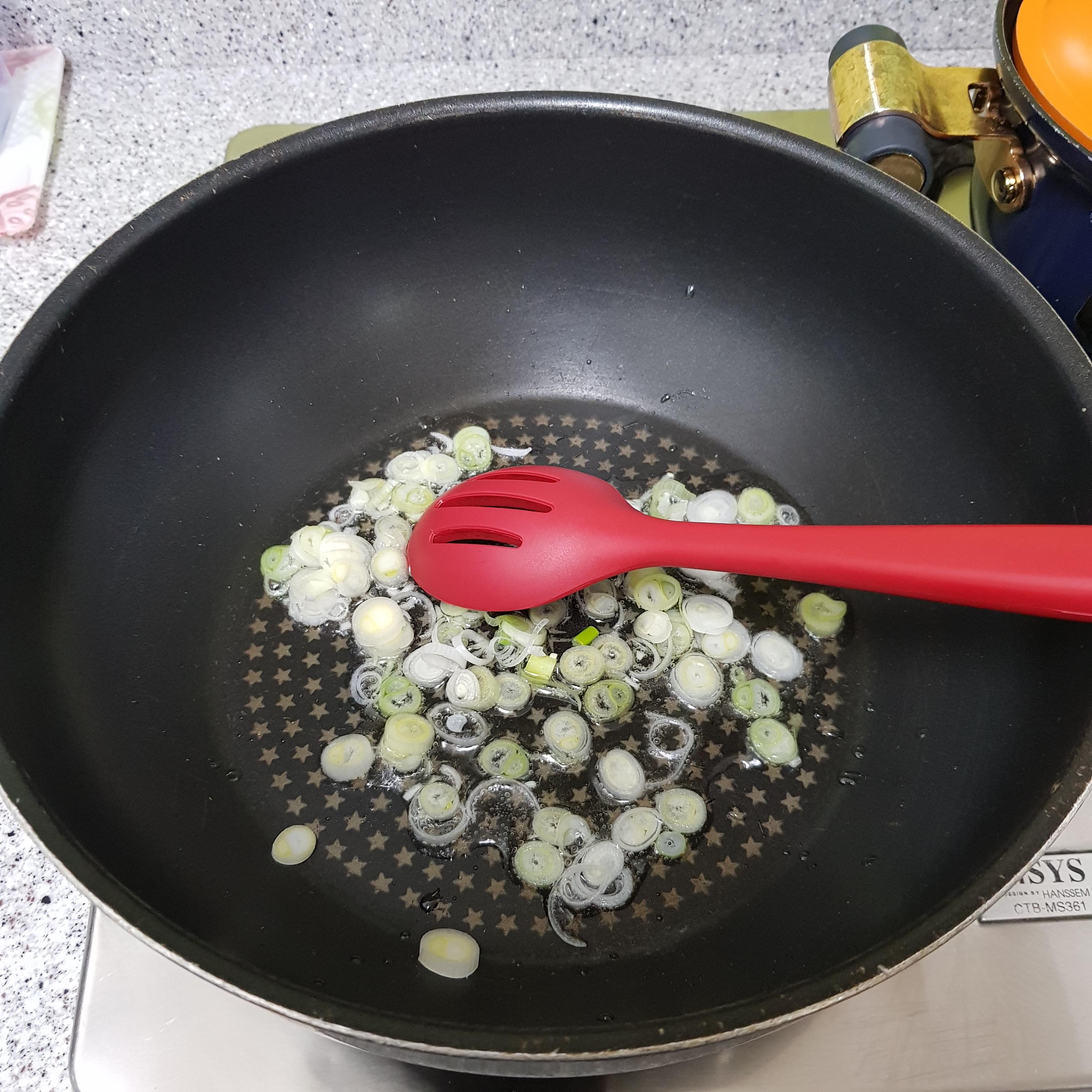 ▶ 센 불에서 달군 팬에 식용유 3큰술을 넣고 송송 썬 대파 흰 부분을 넣고 볶아주세요