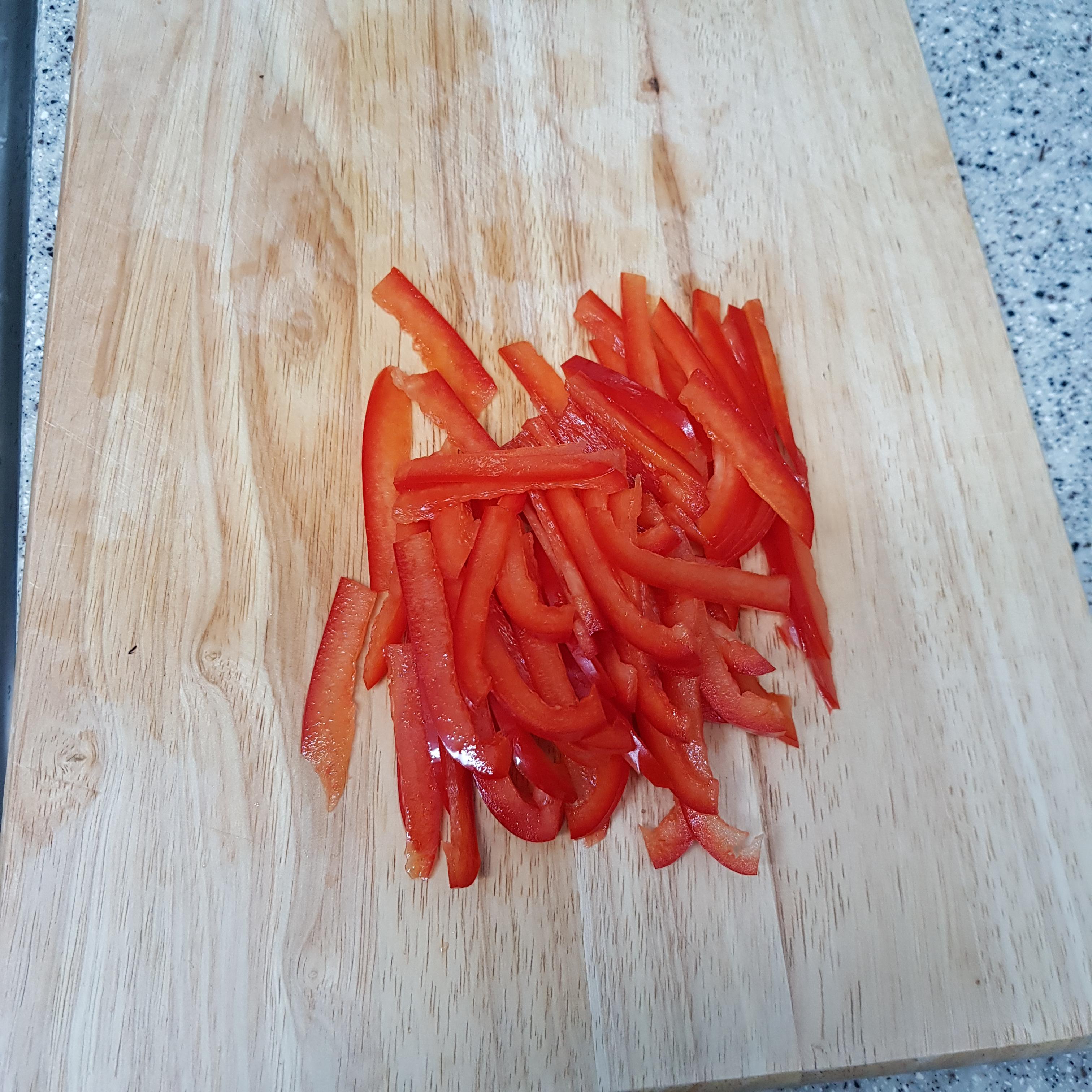 ▶ 파프리카 반개는 씨를 제거한 후 가지 길이와 비슷하게 채 썰어 준비해주세요 참고로 파프리카는 안쪽에서 썰어주면 썰기 쉽답니다